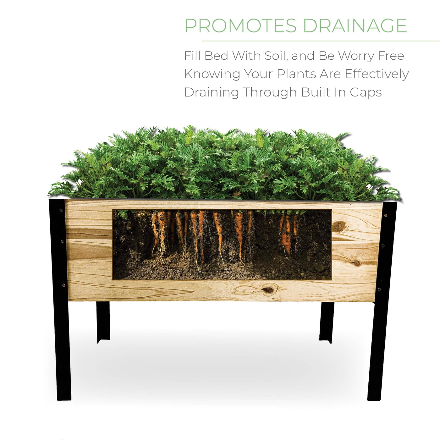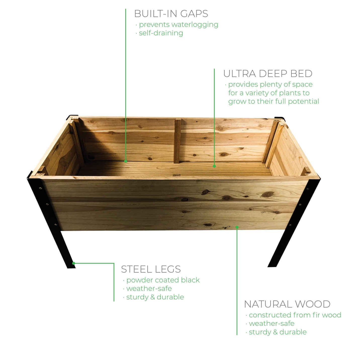 LARGE GROWING SPACE | 35” x 15” Planter box is super deep and will provide plenty of room for your plants and vegetables to grow with ease SELF DRAINING | This elevated planter will allow water to drain naturally through the built-in cracks and keep their soil fresh NATURAL WOOD | Durable Fir Wood will naturally resist weather and water ERGONOMIC HEIGHT | 22” Tall Raised Bed will keep you comfortable as you tend to your garden plants VERSATILE USAGE | Use both indoors or outdoors | Use on the patio, deck, porch, yard, or even indoors in the greenhouse SIMPLE TO ASSEMBLE | Super easy to assemble and only takes minutes GREAT GIFT IDEA | This raised planter box makes a perfect gift for that gardener in your life DIMENSIONS | Bed (35.4” X 15.4”) Height (21.7”) | Weight (17.6lbs) | Weight Capacity 176lbs