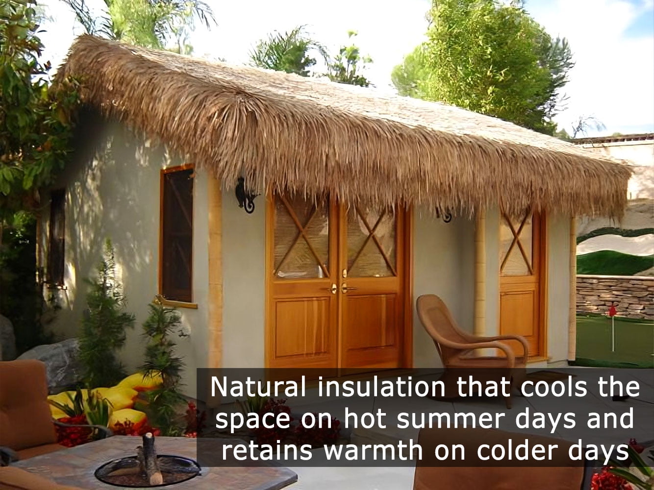 Mexican Thatch is a great option for tropical Tiki bar decor, DIY duck blind project, or upgrading your backyard, garden, or any outdoor space to a Hawaiian theme. Palm leaves Thatch are an excellent way to have natural roofing, shade, and cover for tiki huts, Hawaiian palapa roofing, patio umbrellas, or your tropical-themed landscape or pool Apply natural Mexican thatch to roof frames, ceilings, windows, arbors, and more with staples or zip-ties Perfect to add a tropical touch to your tiki bar as a wall cover or provide a commercial-grade durable natural roofing solution to your palapa, tiki hut, or tiki bar. Approximately 6 lbs. per roll Measuring approximately 35 inches height by 96 inches long. Approximately covers 20 square feet, not including pitch Application for solid or open beam frames Hand-woven, weave pattern and can be seen from underneath. Two layers are recommended for a fuller appearance Cut thatch with sharp, heavy-duty scissors. To prevent unraveling, cut between knots and not directly on top. Fasten to structure using wires, zip ties, or heavy-duty staples. May contain some residue, rinse it and allow it to dry before installation. This product is not fire-proof but can be by applying a certified fire retardant or sending it to a fireproofing company. This is a natural product, lifespan of the product varies on its application and surrounding environment