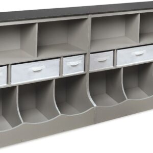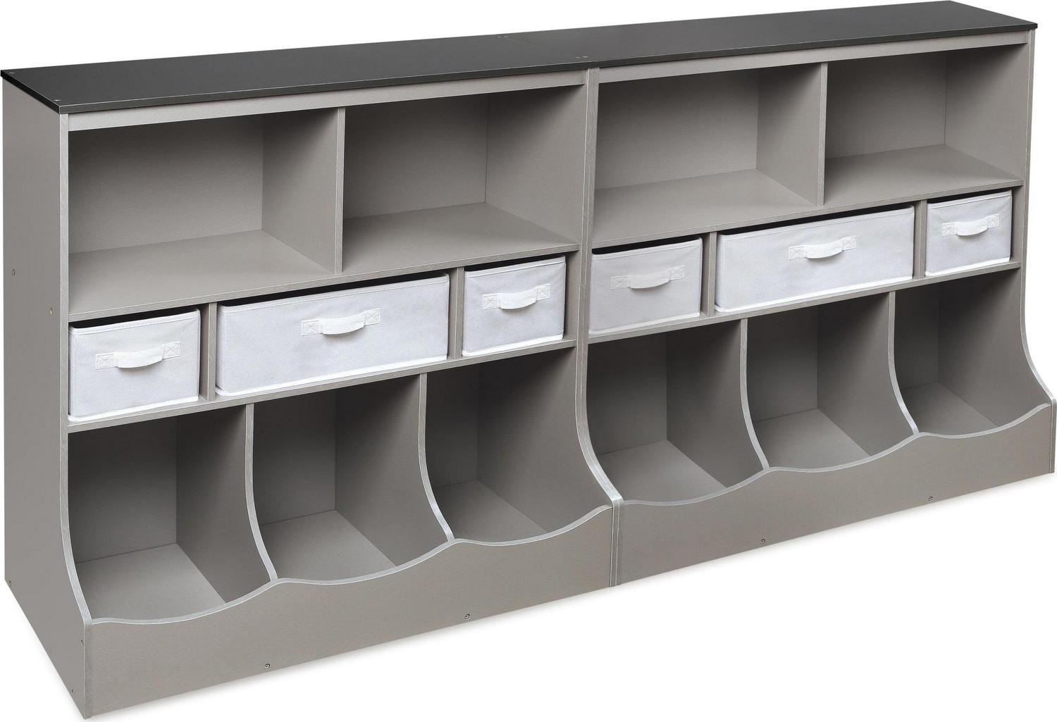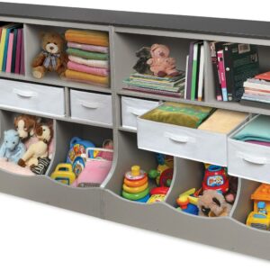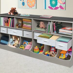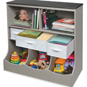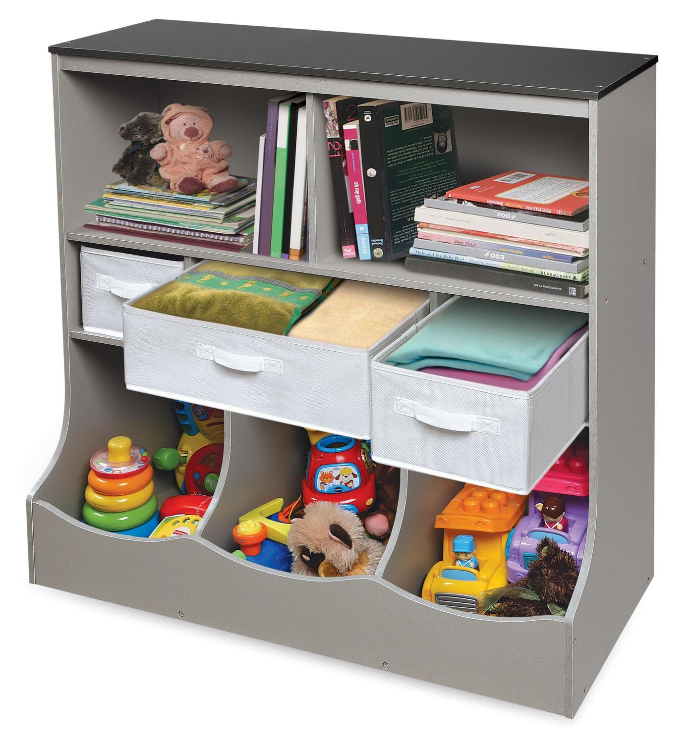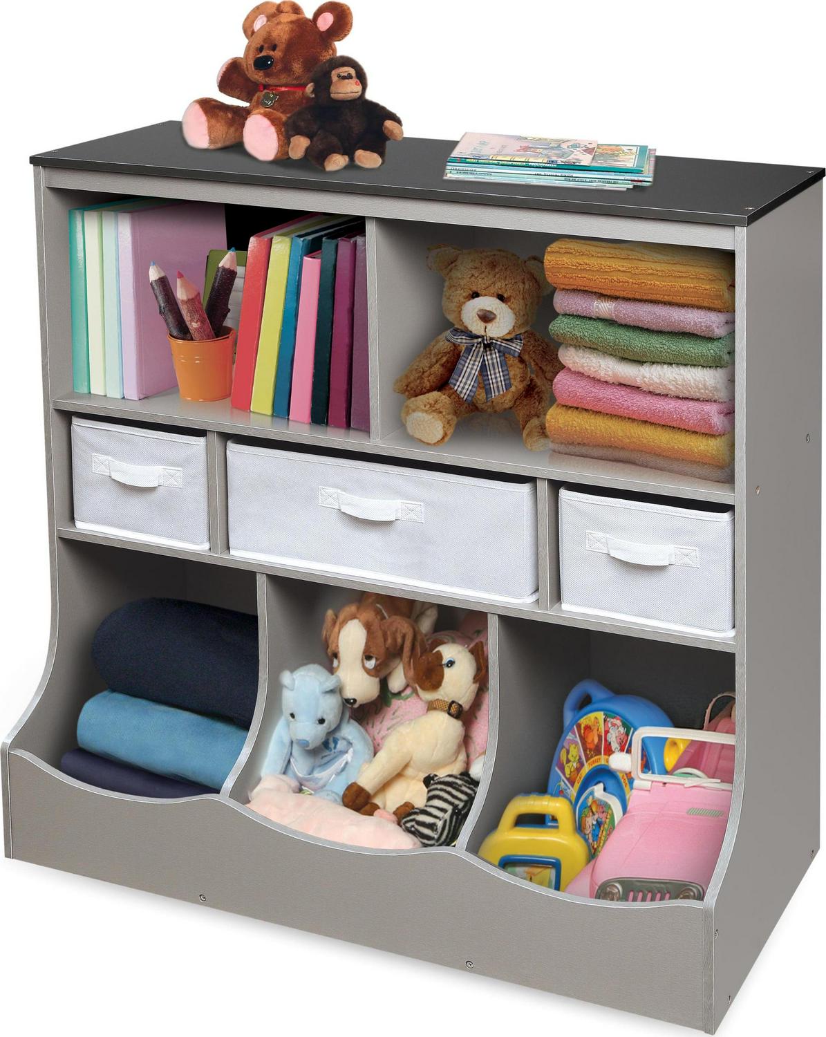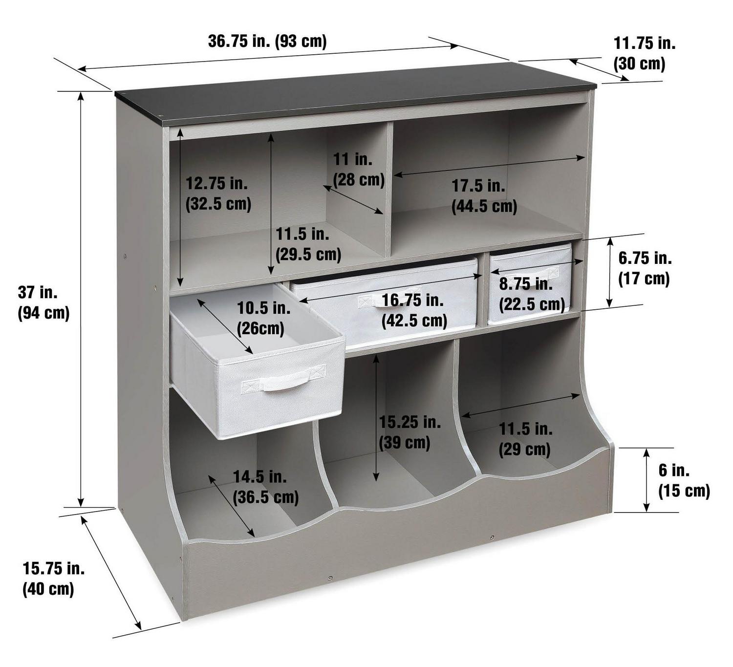 – All-in-one storage system includes shelves, fabric bins, and three open cubbies