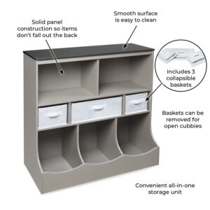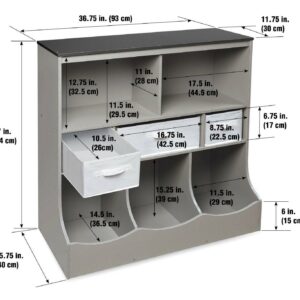 Badger Basket’s Combo Bin Storage Unit with Three Baskets features shelf, basket, and bin storage all in one unit. Convenient for a variety of items including toys, books, and crafts, and a suitable size for any room in the house such as kids’ rooms and entryways. Baskets are removable. Solid panel, engineered wood construction with melamine lamination. Wipe and spot clean. Overall size 36.75 inches L x 15.75 inches W x 37 inches H. Adult assembly required.