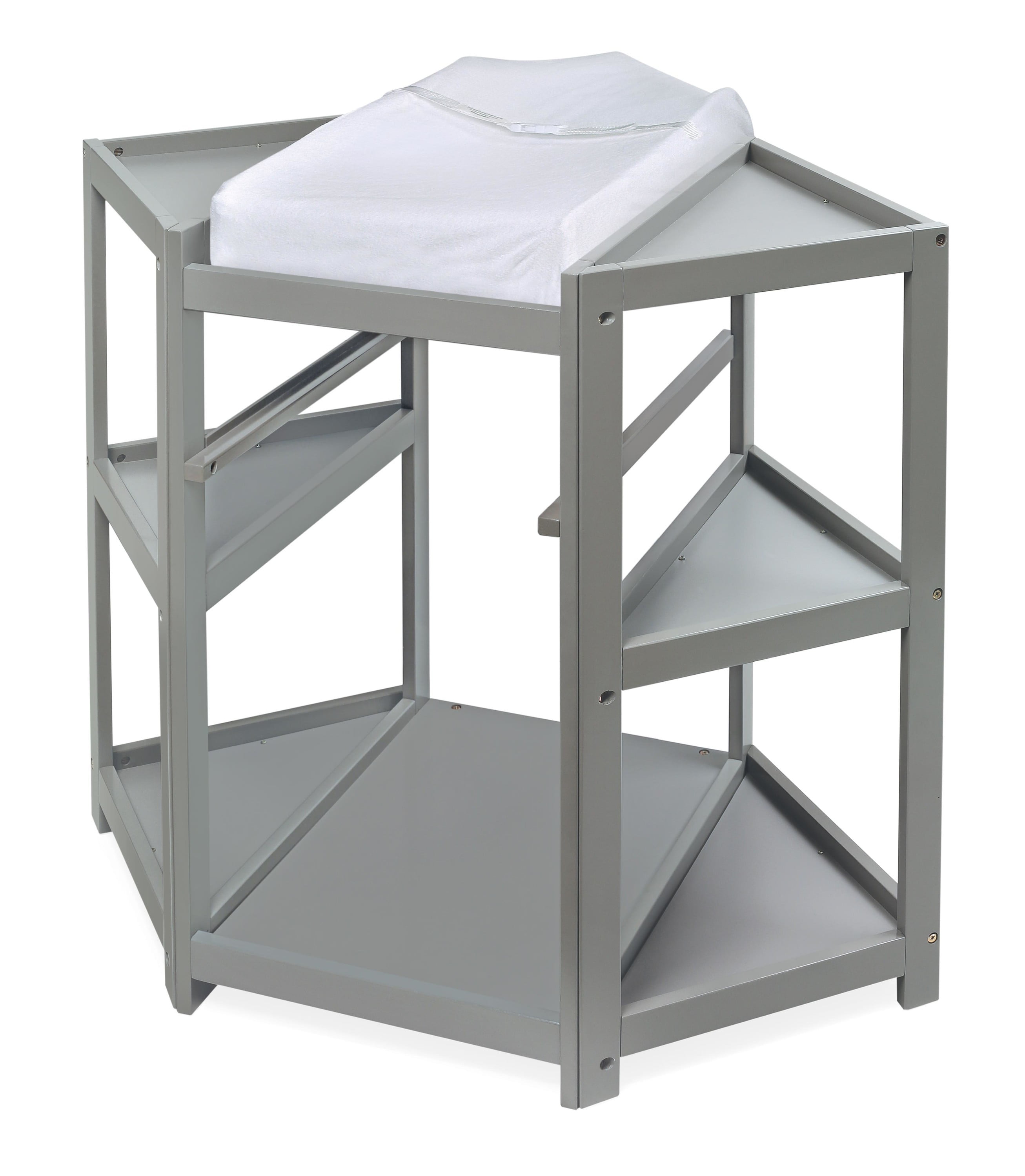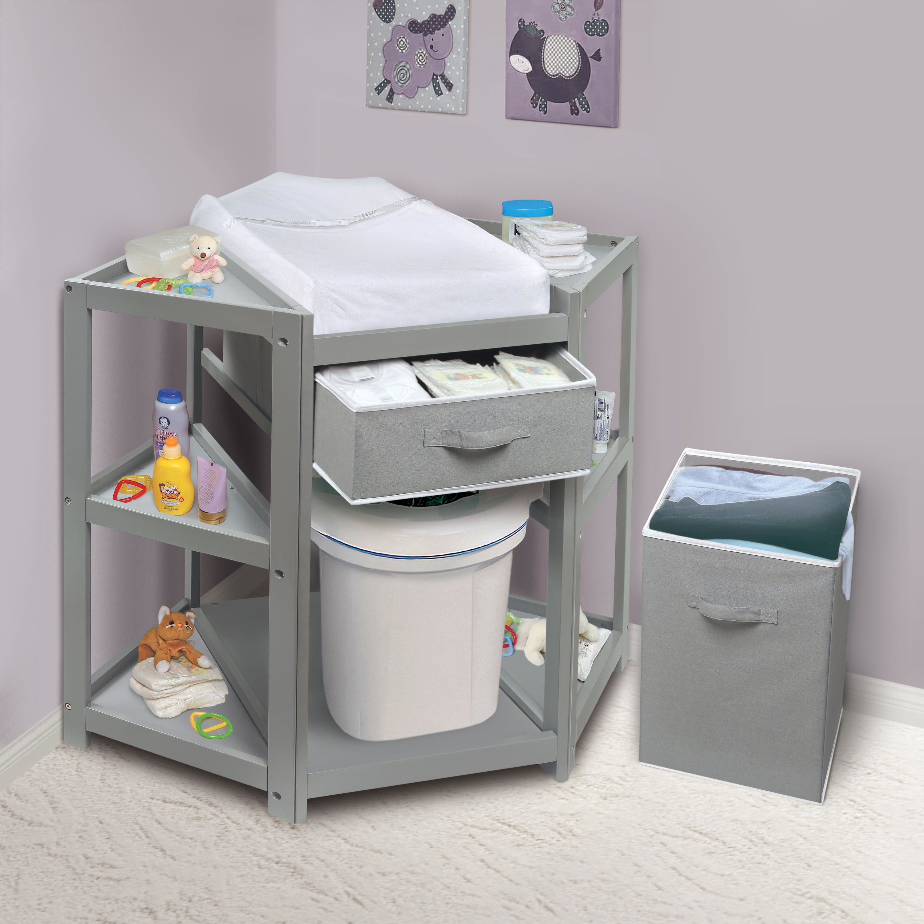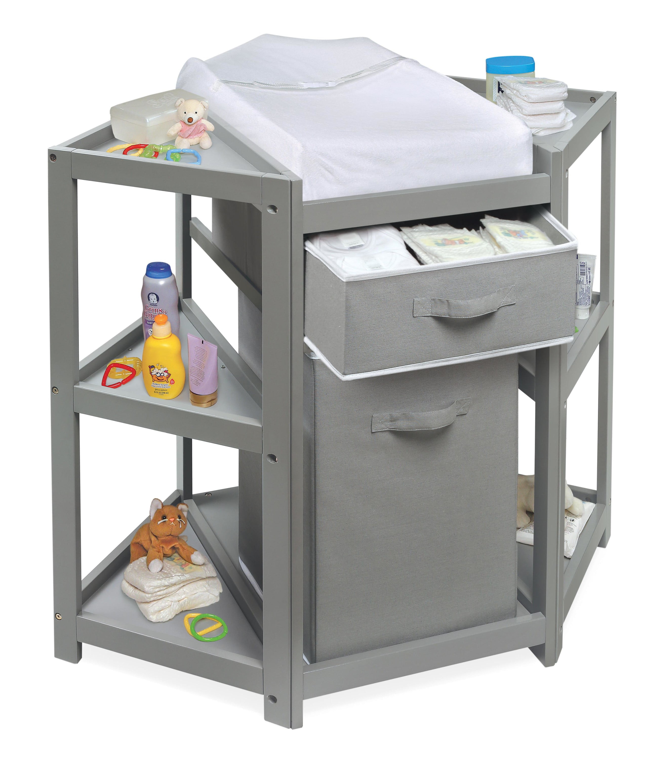 Transform a corner of your baby’s nursery into a deluxe dressing and diapering station Includes a laundry hamper and a storage basket for diapers and changing supplies Change your baby’s diaper with feet pointing towards you Comes complete with a foam changing pad, fabric pad cover, and safety belt Wipe and spot clean as needed Measures approximately 35 inches H, 31.5 inches from the back corner to the front edge, and 40.25 inches W from corner to corner For children weighing up to 30 pounds Manufacturer’s 30 Day Limited Warranty