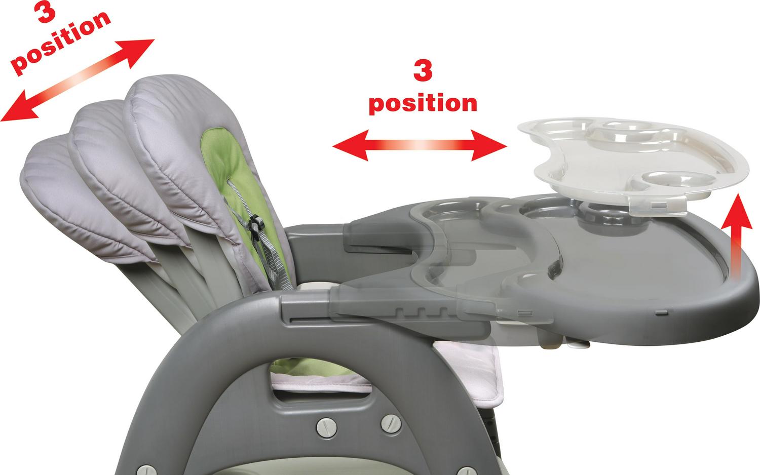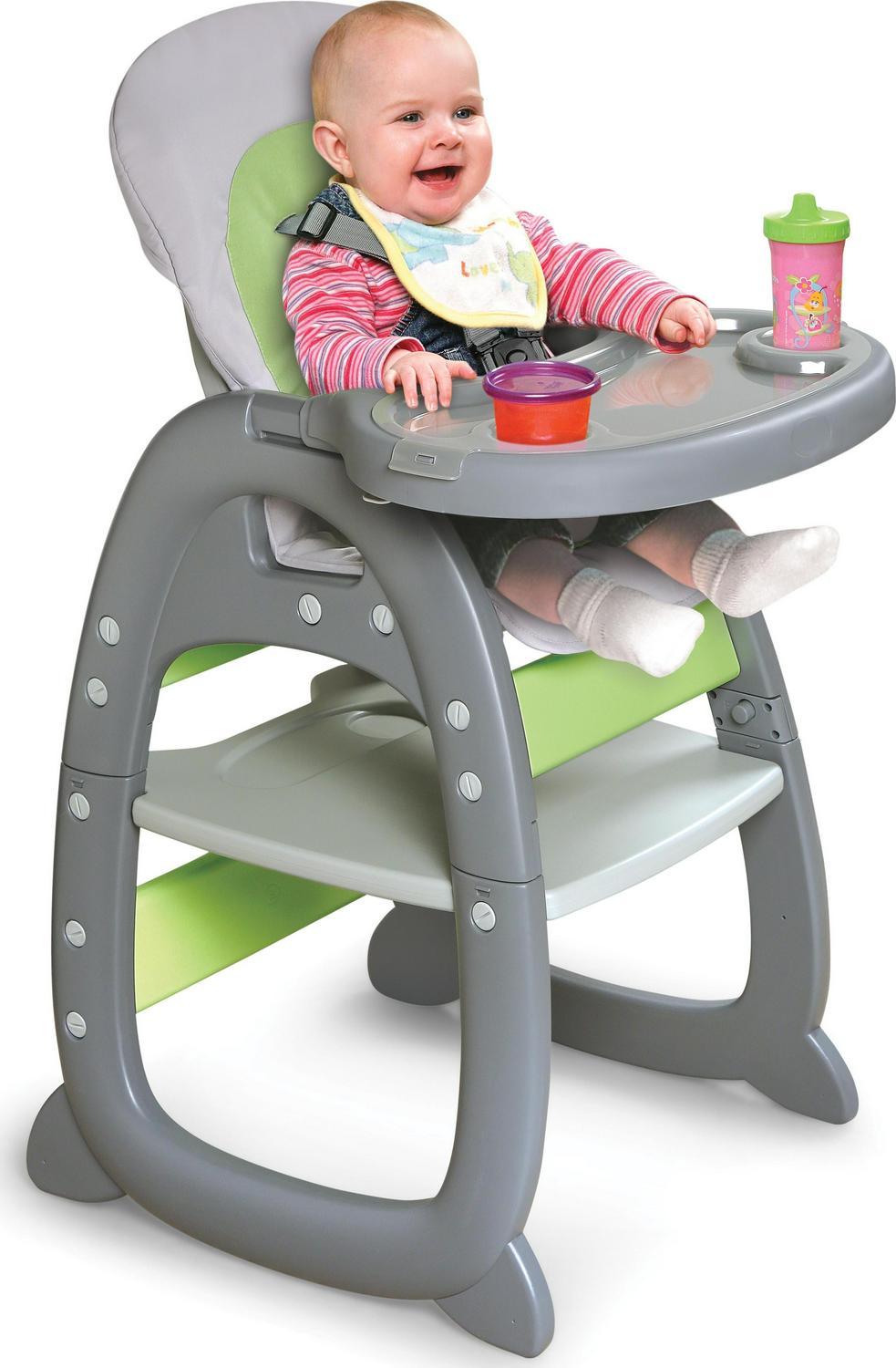 Badger Basket s extended use Envee II highchair easily converts back and forth from a fully-featured baby feeding station to a separate play table and chair for your toddler and preschooler! The Envee II’s many, convenient features are easy to use, yet it’s also affordable. Classy, executive gray is complemented with a bright, energetic lime green on both the seat pad and high chair frame. Includes a three-position adjustable front tray and three-position, adjustable, reclining seat. Seat can be reclined using one hand. Seat includes a five-point harness system with one-handed, quick release buckle. Simply press the large button in the center of the harness and both shoulder and waist belts release. All belts of the seat harness are fully adjustable for comfort at the shoulders, waist, and crotch. Shoulder belts can be released from the waist belts if needed when adjusting the harness or for removing the harness and pad for cleaning. Two feeding trays included! The large, regular tray has a removable, dishwasher-safe insert tray so it’s easy to tidy-up and always have a clean surface available for each meal. Translucent insert tray snaps off and removes easily by releasing and pulling up on the two side clips. The spacious insert tray includes two indented cup holders and a large indented main compartment (3/4 inch deep). The roomy main tray features one cup holder and one wide indented compartment (5/8 inch deep). Stylish, two-tone seat pad is removable and washable. Quickly remove the chair from the table by pressing and releasing the large buttons and releasing the leg posts. Chair (with or without tray) can be used separately from the base/table. The chair connects to the table only one way for extra safety when converting it back to highchair use. As a play table, the chair nests fully under the table for comfort during craft or meal time, and compactness when not in use. Play table has an indented cup holder, crayon, and snack area. Includes four caps to cover the corner posts of the table when the chair is not connected. Lined and cushioned seat pad is 100% polyester fabric with 100% polyester fill. Chair and Table are made of durable, recyclable High-Density Polyethylene (HDPE) plastic; insert feeding tray is made of recyclable Polypropylene (PP). Overall Highchair with Tray measures 24.75 inches W (24 inches W when insert tray is removed) x 28.5 inches D with tray in 3rd position (30.5 inches deep with tray in 1st position) x 42 inches H. Overall Highchair without Tray measures 22.5 inches W x 25.5 inches D x 42 inches H. When Highchair seat is fully reclined, it adds another 2 inches to the Depth. Overall Highchair with Tray weighs 16.5 pounds (16.02 pounds with insert tray removed). Chair only with Tray measures 24.75 inches W (24.2 inches W when insert tray is removed) x 26.5 inches D x 24.5 inches H. Chair only without Tray measures 18.25 inches W x 21.75 inches D x 24.5 inches H. Chair only without Tray weighs 7.7 pounds. When Chair seat is fully reclined, it adds another 3.5 inches to the Depth. Interior width of the chair/seat is 12 inches W. Interior depth of the chair/seat bottom is 10.5 inches D from front to back. Interior height of the chair/seat back is 18 inches H. Distance from crotch belt to seat back is 7.5 inches. Maximum waist belts length is 23 inches. Height from top of seat to floor in Highchair position is 26 inches, and it is 9 inches from seat to floor in play chair position. Chair only without tray weighs 8 pounds. Table only measures 22.5 inches W x 25.5 inches D x 18.25 inches H (16.5 inches H to the tabletop surface). Table only weighs 6.5 pounds. Table surface area measures 18.5 inches W x 22.5 inches D at the widest points. Indented cup/snack area on the table measures 10.75 inches W x 4 inches D at the widest points (round cup holder only is 3.25 inches in diameter). Tray only with insert tray measures 24.75 inches W (24 inches W when insert tray is removed) x 16 inches D (including the arms) x 6.5 inches H (including the safety T-bar; 2 inches H not including the T-bar or position adjustment levers). Insert tray interior at the widest points measures 20.5 inches W x 8.5 inches D with 3/4 inch deep rim (cup holders are 2.75 inches in diameter). Main tray interior at the widest points measures 21 inches W x 8-5/8 inches D with 5/8 inch deep rim (cup holder is 2-7/8 inches in diameter). Tray only weighs 2.5 pounds. All measurements approximate and may be rounded. Measurements may vary slightly depending on position of the tray and recline of the seat. All measurements taken with the fabric seat pad in place. Pad can be machine washed in cold water, gentle cycle, do not bleach, do not iron, air dry; may be dry cleaned if desired. Chair/table frame easily wipe clean with a sponge or damp cloth and mild soap. For use from approximately six months (when your child can sit unassisted) and up in the highchair. For use from approximately 2 years to approximately 6 years (40 pounds/18 kg) when converted to a play table and chair (maximum ages vary depending on the child’s size/weight and activity level). Complies with all current U.S. safety standards including T-bar on the tray to prevent sliding out. No polycarbonate plastic is used in the manufacturing of this chair, therefore the chair is BPA free. Adult assembly required. Illustrated assembly instructions included. Custom-designed assembly tool included. Product details/features subject to change at any time without notice. Props/accessories shown with the chair are for illustration purposes only and not included. Product includes a warranty of 30 Days Parts to the original purchaser.