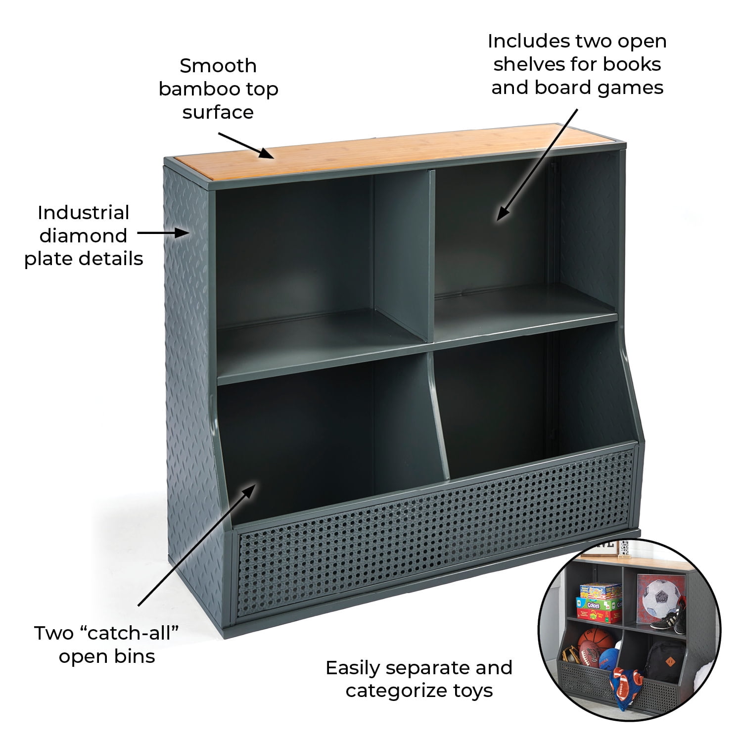 - Features: Wipe Clean, Adult Assembly Required, Metal, Bamboo, Some soft plastic/rubber toys (such as balls) can react with and cause damage to the finish when left in prolonged contact. Be mindful of what is stored in the unit and regularly check toys and the unit to prevent damage.