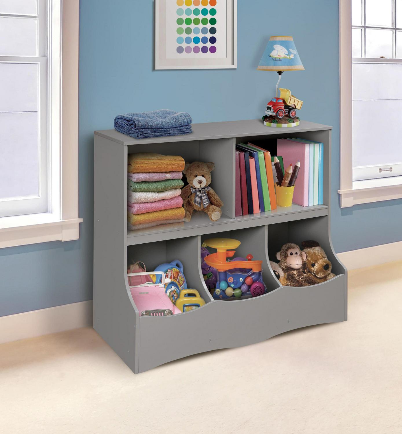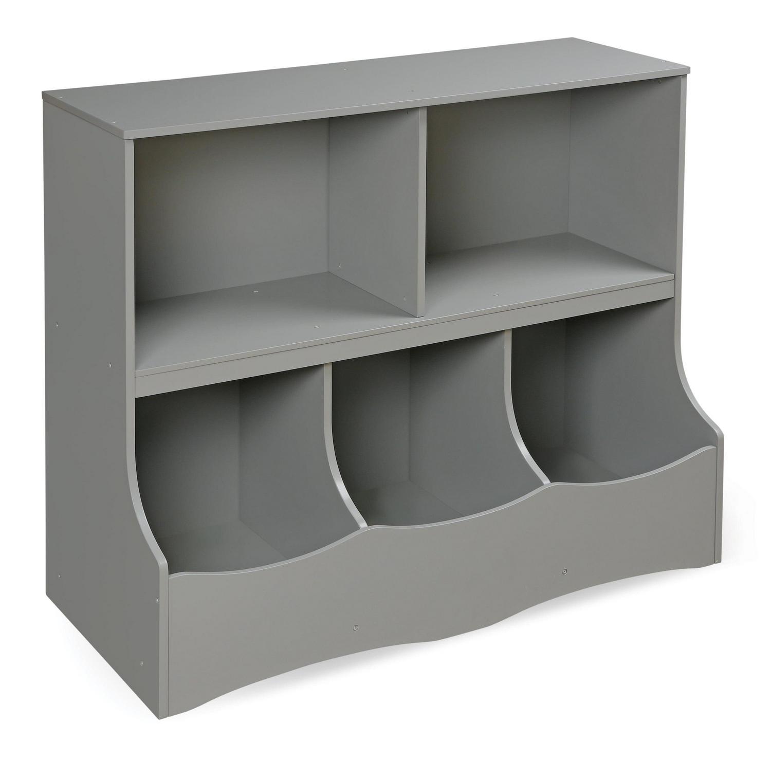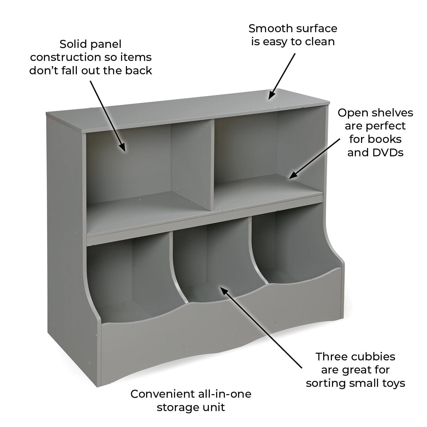 – Features two open shelves and three large cubby bins