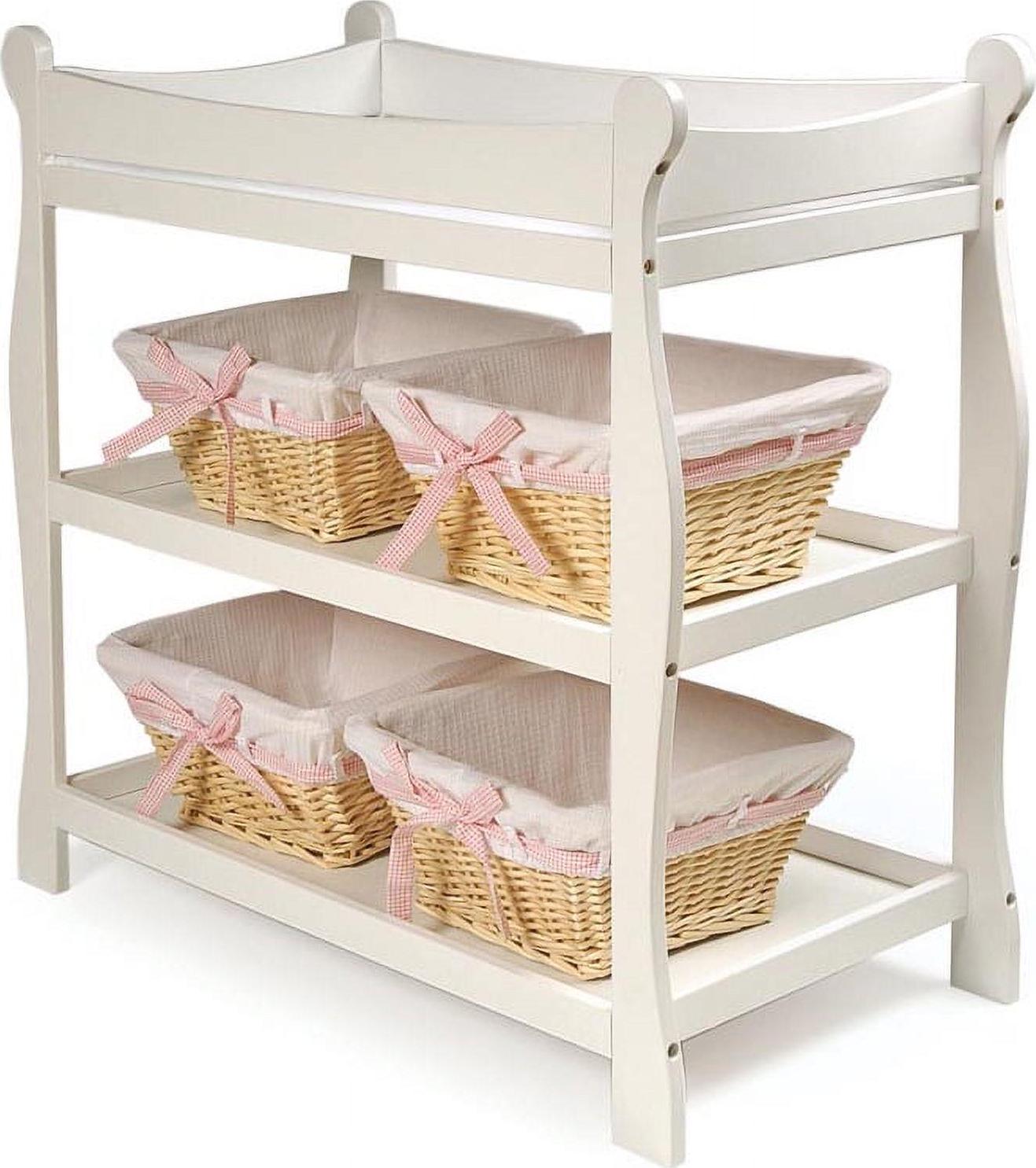 Badger Basket’s Sleigh Style Baby Changing Table offers a traditional style with two nicely sized shelves and safety rails on all four sides. Includes a foam changing pad and safety belt. Wipe clean. Made with wood and veneered MDF. Changing pad is polyurethane foam covered with PEVA vinyl. Overall dimensions: 37.5 inches L x 19 inches W x 37.5 inches H. Shelves measure 32 inches L x 17.5 inches W. Adult assembly required.