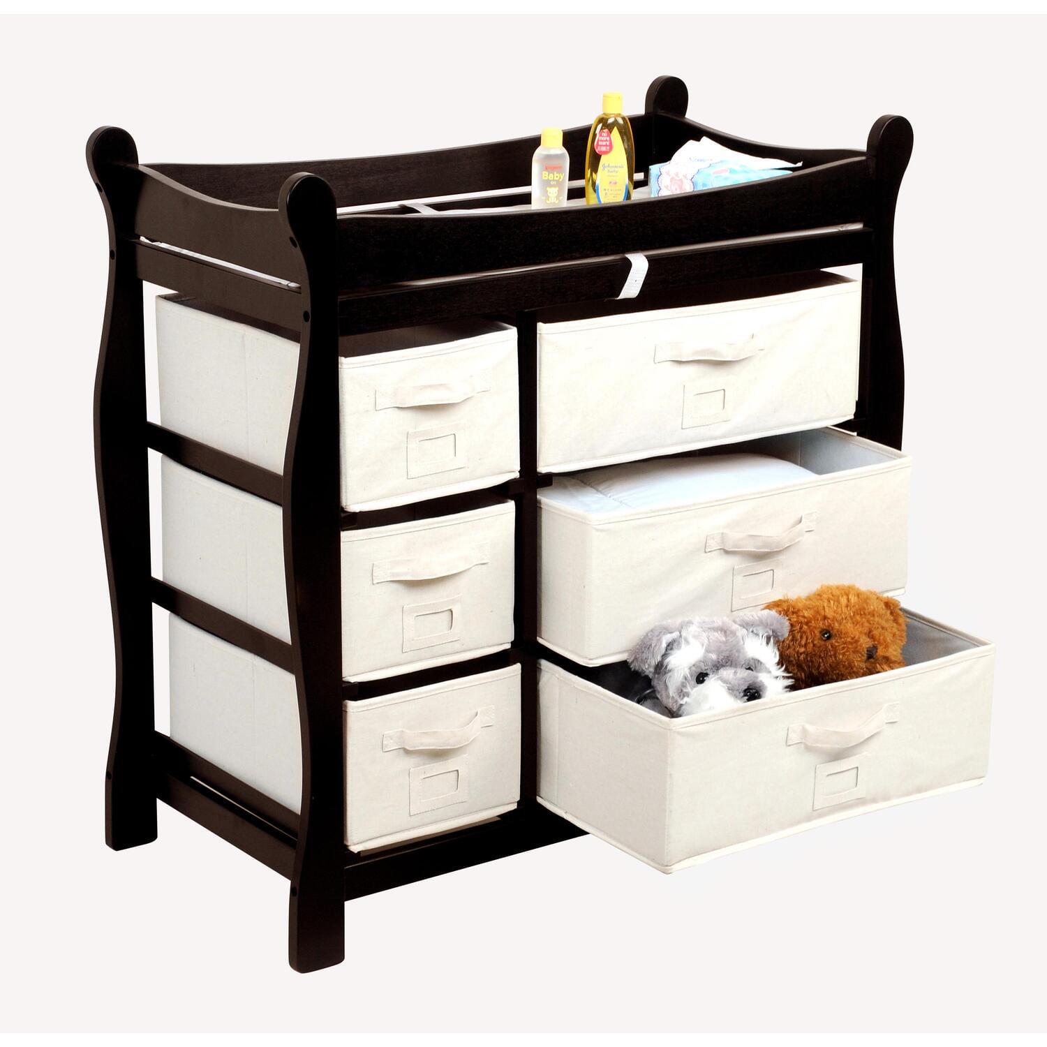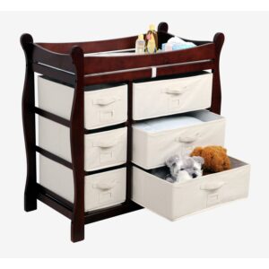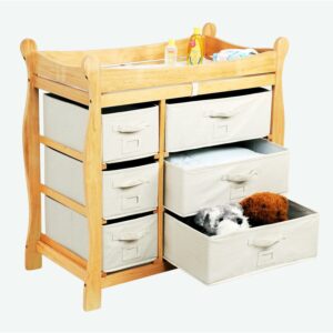 Enjoy a high quality, handsome changing table that will grow with your child. The Sleigh Style Changing Table with Six Baskets is designed with safety and style in mind. The changing table is constructed with wood with a non-toxic finish. Under the changing surface a metal support bar provides additional stability and safety rails enclose all four sides around the top of the table. There are six pull-out baskets, three large and three small, and since the table is reversible, the large drawers can go on the right or left side to suit your liking. The drawers provide ample room to store and organize changing supplies and other items. And once your baby has outgrown the table, it becomes a useful and attractive piece of furniture for holding clothes or toys. Enjoy functionality and simplicity with the Sleigh Style Changing Table with Six Baskets.