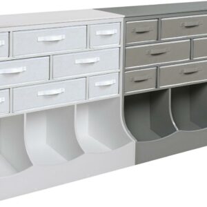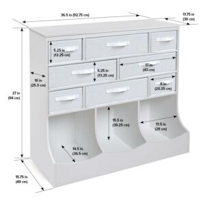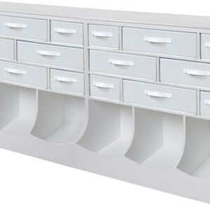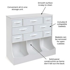 Badger Basket’s Storage Station with Eight Baskets and Three Bins creates a central hub for organizing busy families or out-of-control crafts and toys. Features four large and four small removable baskets, three open bins, and a top surface for books or knick-knacks. Solid panel construction. Made with MDF and fabric. Wipe and spot clean. Overall size 36.5 inches L x 15.75 inches W x 37 inches H. Adult assembly required.