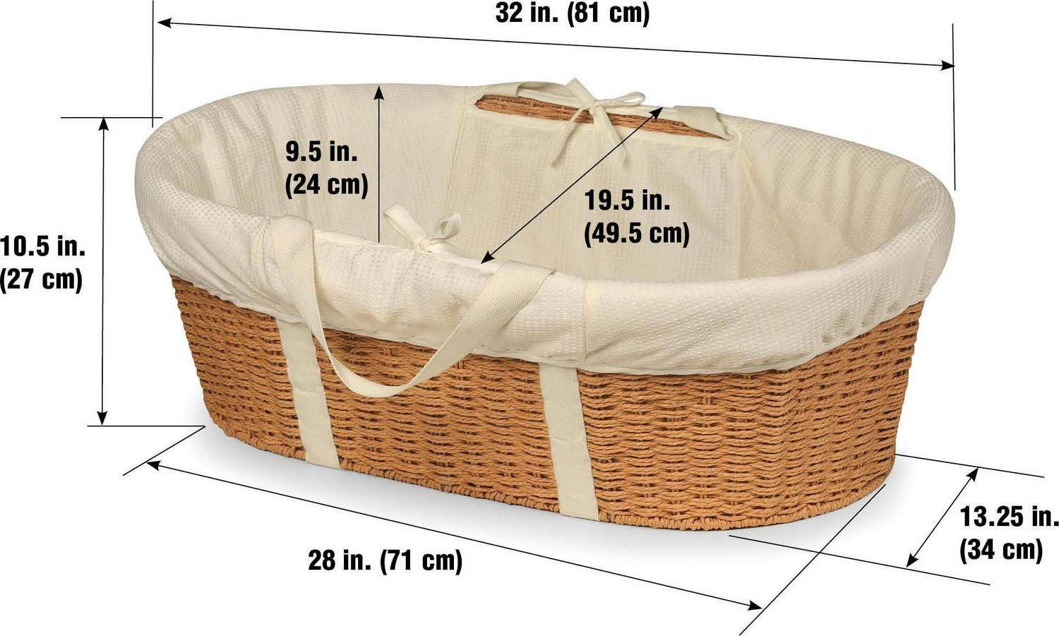 Badger Basket s elegant Wicker-Look Woven Baby Moses Basket checks all the boxes for a comfortable and stylish dressing spot for your baby s first few months. All fabric is machine washable. Wipe clean foam pad. Fully assembled, simply put the fabric in place. Overall unit measures 32 inches L x 19.5 inches W x 10.5 inches H. For use from birth to 15 pounds or until Baby pushes up or rolls over unassisted.