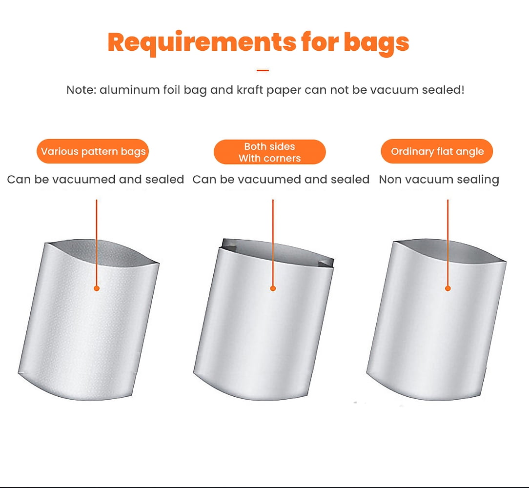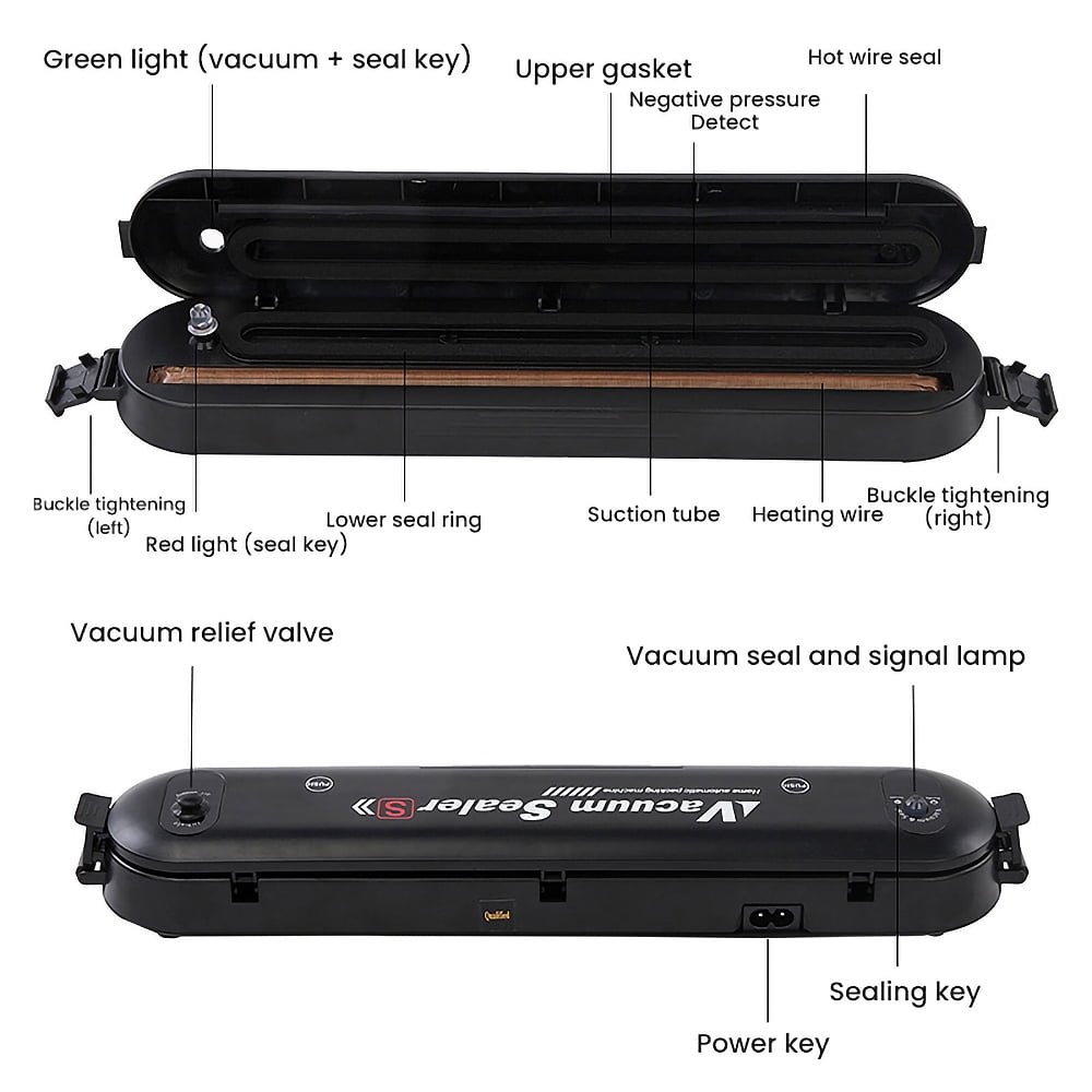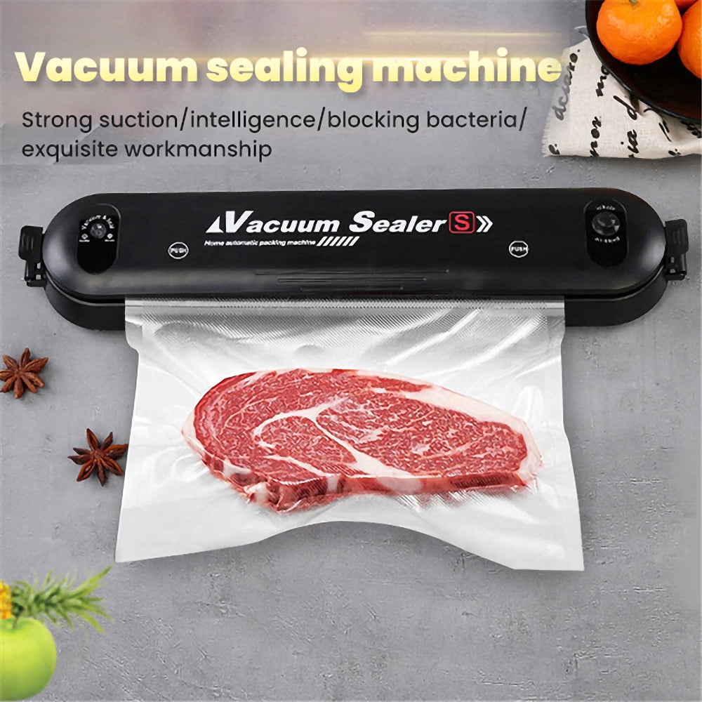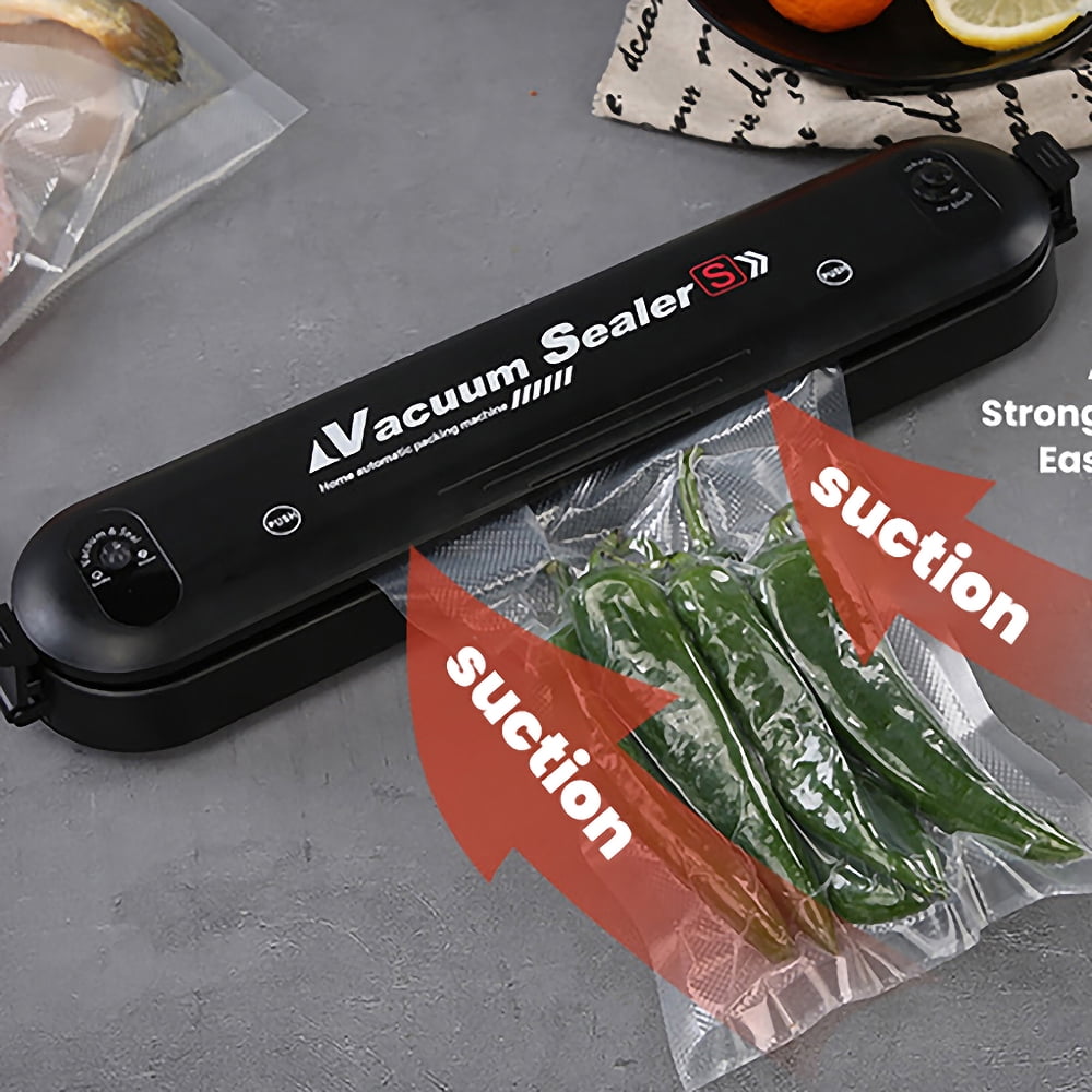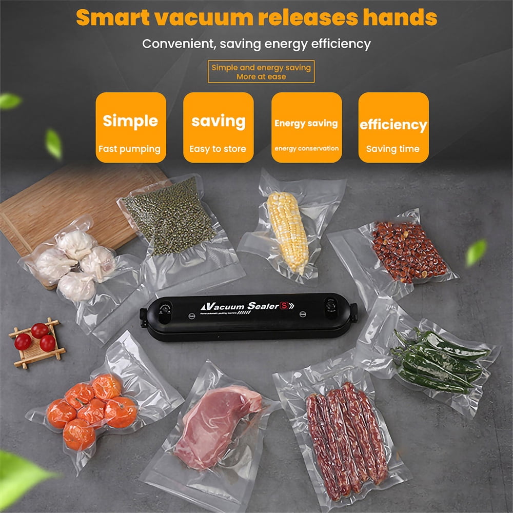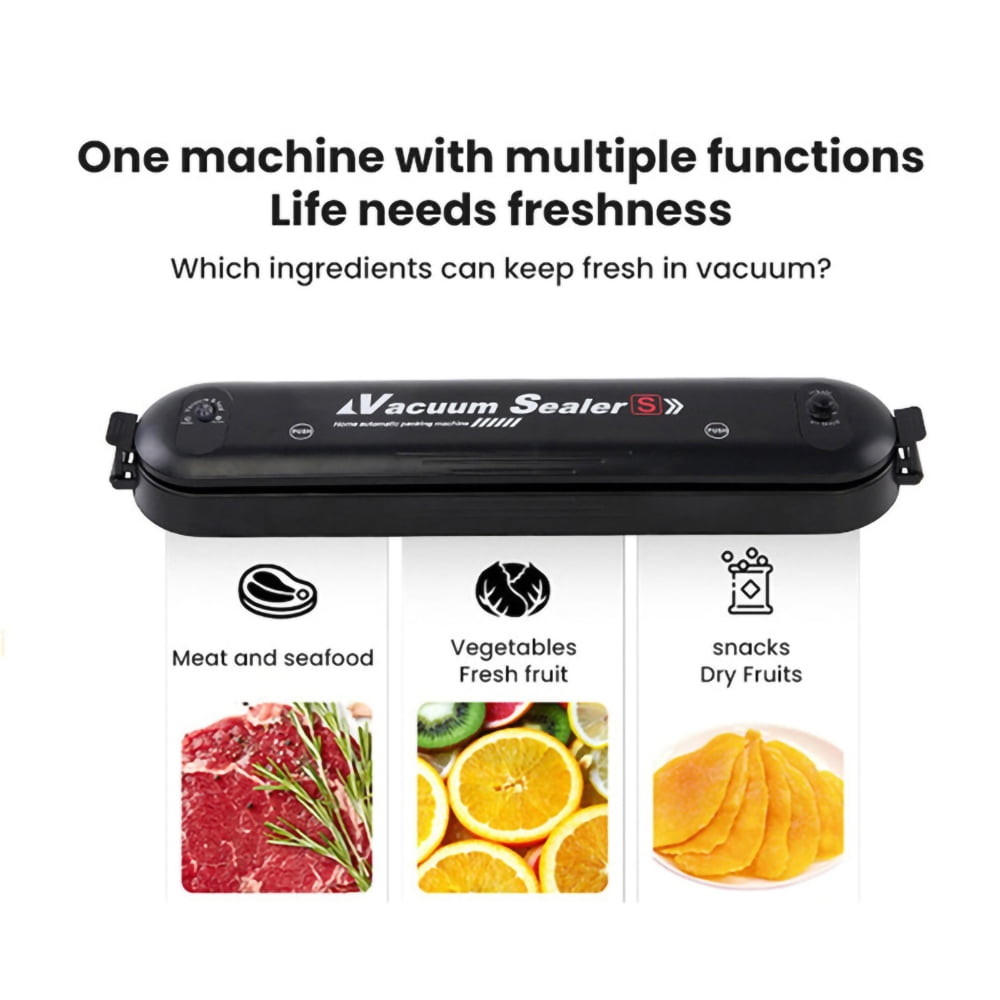 Why Use Vacuum Sealing Machine, Why Choose Our Products? ✿ Food Saving ✿ Space Saving ✿ Time Saving ✿ Money Saving ✿ Why is Vacuum Sealer a Must-have? ➤ Keep your kitchen tidy and organized. ➤ Save the storage space of refrigerator. ➤ Package all kinds of foods separately. ➤ Maintain the freshness and natural taste. ➤ Prevent foods from spoiling. Features: ♥【Multifunctional Food Vacuum Sealer】: The automatic vacuum sealer can keep the freshness of fruits, nuts, meat, sweets, and vegetables, preventing foods from getting freezer burned, molded, and spoiled, reduces spoilage and food saver. ♥【Professional Vacuum Sealing System】: Made of eco-friendly ABS, lightweight and compact, totally durable and practical in use. Upgraded sealing technology adopts inverter constant temperature for sealing stability and efficiency. The vacuum sealing process extends the freshness of the food, saving you time and money. ♥【Two Sealing Modes】: This food vacuum sealer is designed with separated buttons (for sealing and vacuum) with LED indicator lights, easily guide you through the vacuum sealing process, ensures hands-free and efficient operation. ♥【Automatic Vacuum Air Sealing System】: Designed with fully automatic vacuum sealing system, bottom case is waterproof, outer air vent, and low-noise feature together make it safe and comfortable for use. ♥【Easy To Clean】: The Food vacuum sealer lightweight and compact, this vacuum sealing system can be placed on any counter top. Its stain- resistant housing will not absorb accidental spills, and it is easy to wipe it clean. Please keep them away from children to avoid burns. Specifications: Material: ABS Size (about): length 14.6”/37cm; width 2.9”/7.6cm; height 1.89”/4.8cm Net weight (about): 21oz/600g Color: black Rated voltage: 220V/50HZ 110V/60HZ Rated power: 90W Packing list: Vacuum machine *1 Vacuum packaging bag*10 VACUUM SEALER NOTES : 1. Do not fill the vacuum bag full. Leave enough space at the open end of the bag to allow the bag to enter the vacuum chamber more safely. 2. Do not wet the open end of the bag. Wet bags can be difficult to melt and tightly seal. 3. Do not vacuum with sharp objects, such as hard shells.
