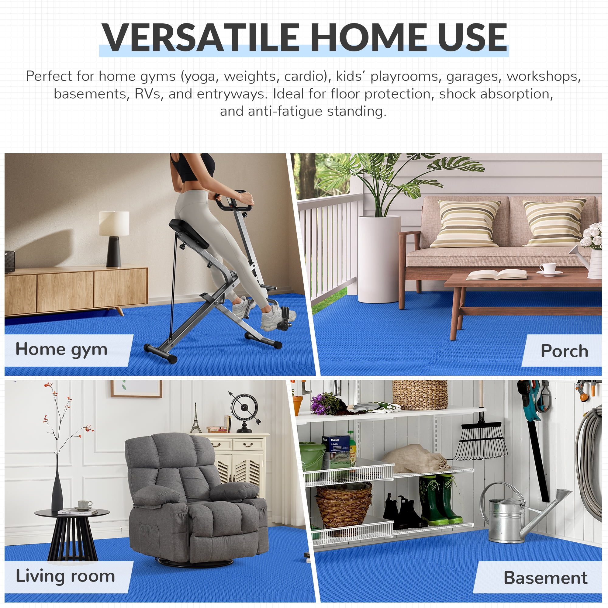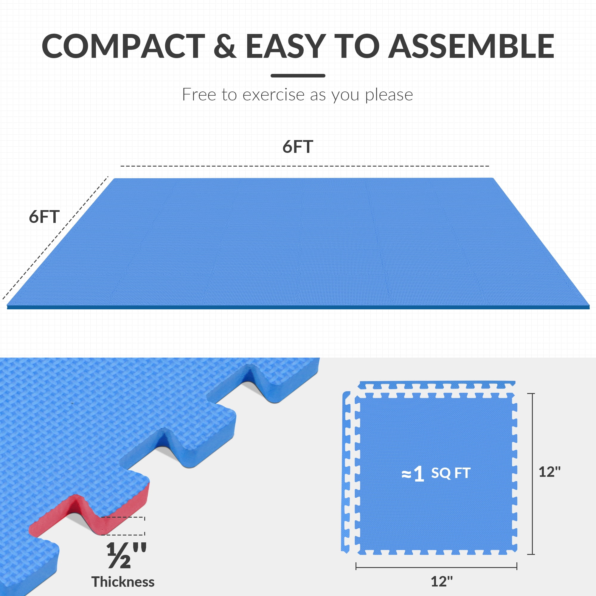 Introducing the BalanceFrom 1/2 In. Thick Flooring Puzzle Exercise Mat, a versatile and durable flooring solution for your home gym or exercise space. This mat is designed with high-quality EVA foam interlocking tiles that provide excellent cushioning and support for a variety of exercises. With a thickness of 1/2 inch and a total coverage of 144 square feet, this mat offers ample space to move and exercise comfortably. The puzzle piece design allows for easy installation and customization, making it suitable for any size or shape of space.Key Features:- High-Quality EVA Foam: The mat is made from premium EVA foam material that is durable, non-toxic, and resistant to water and sweat, ensuring long-lasting performance.- Thick and Cushioned: With a thickness of 1/2 inch, this mat provides optimal cushioning and shock absorption to protect your joints during high-impact workouts.- Interlocking Puzzle Piece Design: The puzzle piece edges allow for easy assembly and customization, allowing you to create a flooring layout that fits your space perfectly.- Versatile Use: This mat is suitable for various exercises, including yoga, Pilates, HIIT workouts, cardio exercises, and more.- Noise and Impact Reduction: The thick foam material helps to reduce noise and impact, making it ideal for home gyms or exercise spaces in apartments or shared living spaces.- Easy to Clean: The surface of the mat is easy to clean with a damp cloth or mild soap, ensuring a hygienic and odor-free workout environment.- Protects Floors: The mat provides a protective layer between your equipment and the floor, preventing scratches, dents, and damage to the surface underneath.- Non-Slip Surface: The textured surface of the mat provides a secure grip, preventing slips and ensuring stability during exercises.- Large Coverage Area: With a total of 144 square feet, this mat provides ample space for a wide range of exercises and movement.- Portable and Easy to Store: The lightweight design and puzzle piece construction make it easy to assemble, disassemble, and store the mat when not in use.Create a comfortable and safe workout space with the BalanceFrom 1/2 In. Thick Flooring Puzzle Exercise Mat. Its high-quality EVA foam construction, interlocking puzzle piece design, and generous coverage area make it an excellent choice for any home gym or exercise area. Whether you’re practicing yoga, engaging in cardio workouts, or doing strength training, this mat provides the necessary cushioning and support for a productive and enjoyable workout. Experience the benefits of a premium exercise mat with the BalanceFrom Puzzle Exercise Mat.