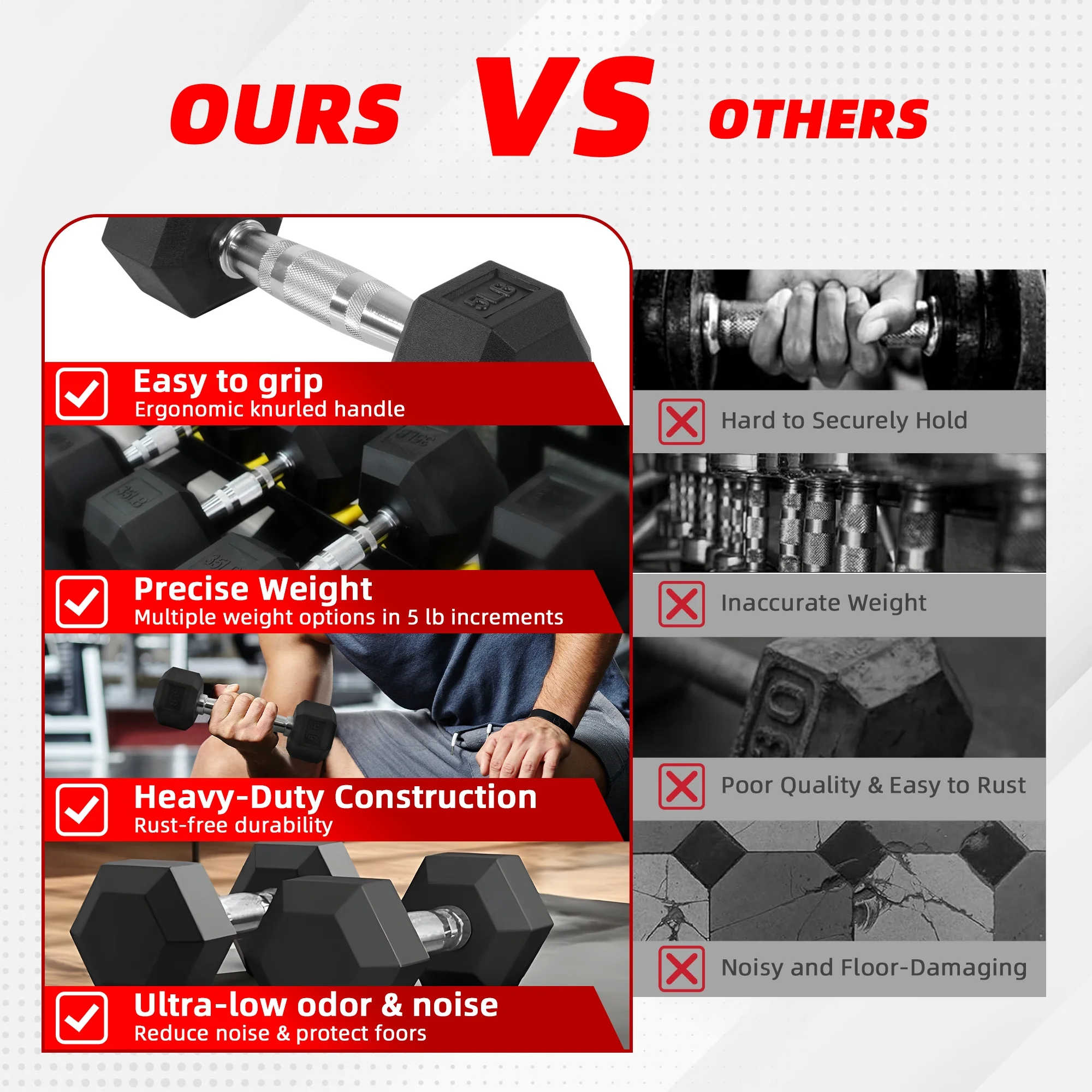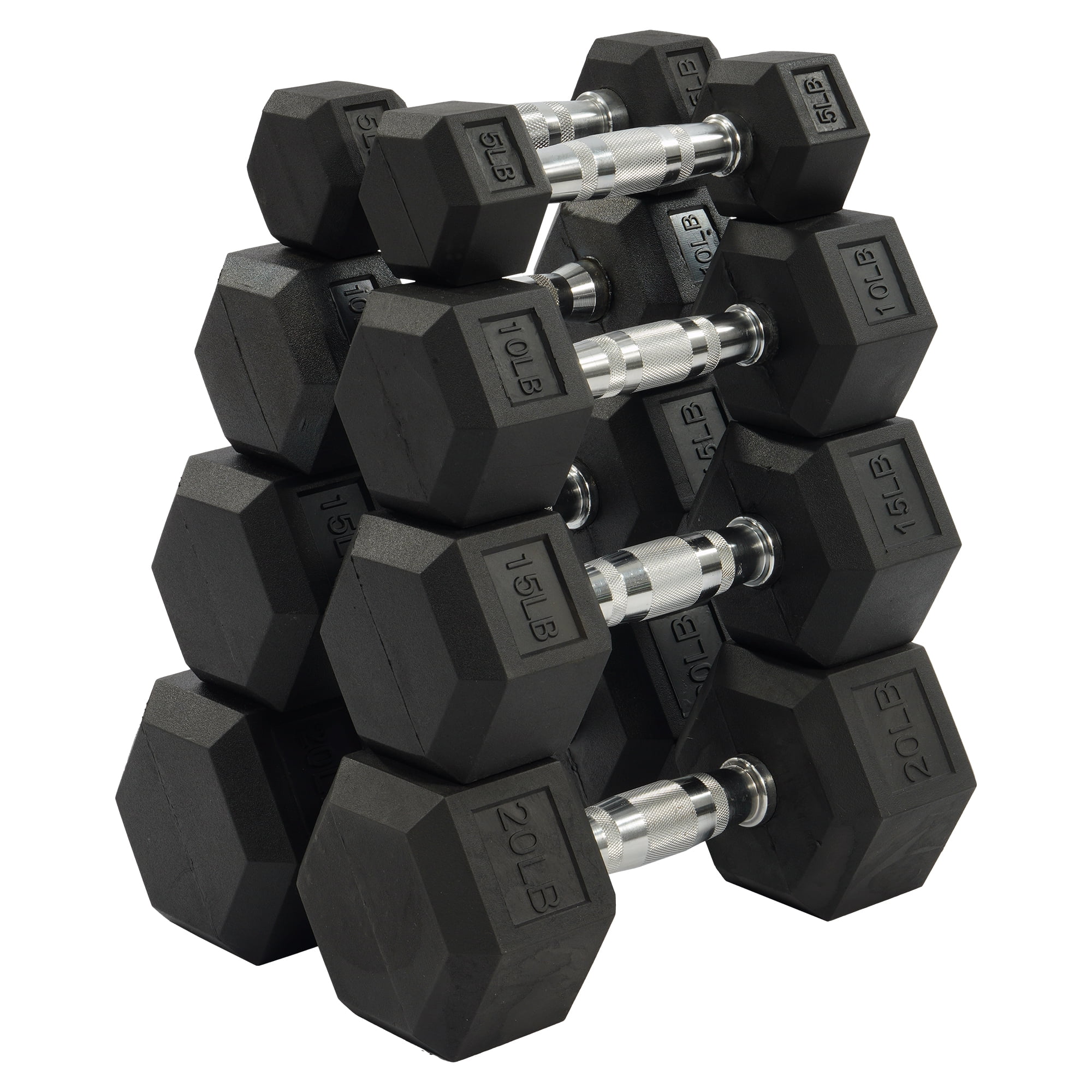 5-20LB DB SET Rubber dumbbells Hex style prevents roll Low odor Key Features: Durable and Long-Lasting: Crafted with high-quality materials, these dumbbells are built to withstand the test of time. The rubber encasing not only protects the dumbbells from wear and tear but also prevents damage to your floors, making them ideal for both home and commercial use. Comfortable Hex Design: The hexagonal shape of these dumbbells prevents rolling, providing you with a stable and safe workout environment. The ergonomic design also ensures a comfortable grip, allowing you to focus on your exercises without any discomfort. Versatile Weight Options: This set includes pairs of 5 lb, 10 lb, 15 lb, and 20 lb dumbbells, offering a variety of weight options to suit different fitness levels and exercise routines. Whether you’re a beginner or an experienced lifter, these dumbbells provide the flexibility to customize your workouts. Rubber Encased for Quiet Workouts: The rubber encasing not only protects your floors but also dampens noise, allowing you to enjoy quiet and controlled workouts. Focus on your fitness goals without disturbing your surroundings, making these dumbbells perfect for home use. Compact and Space-Saving: The compact design of these dumbbells makes them easy to store in any home gym. Keep your workout space organized and clutter-free, ensuring a hassle-free and efficient exercise routine. Professional-Grade Performance: Designed for both strength training and toning exercises, these dumbbells deliver professional-grade performance. Incorporate them into your routine for a full-body workout that targets various muscle groups. Secure and Stable Grip: The textured handle provides a secure grip during your workouts, reducing the risk of slippage. Maintain control over your exercises and perform each movement with confidence, knowing that these dumbbells are designed for stability. Elevate your strength training with the BalanceFrom Rubber Encased Hex Dumbbell Set. Experience the perfect blend of durability, comfort, and versatility, and take your home workouts to the next level. Whether you’re a fitness enthusiast or a beginner, these dumbbells are the ideal addition to your exercise routine.