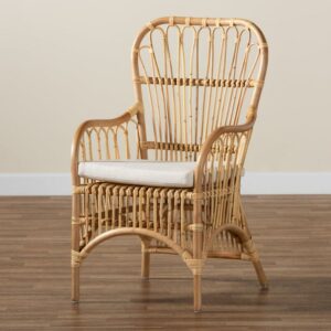 Modern and contemporary armchair Handmade from rattan Natural finish Removable cushion is padded with foam and upholstered in cotton-polyester blend fabric Cushion is not waterproof Fully assembled Made in Indonesia Product Weight: 15.6 Pound Package Weight: 22.6 Pound Dimensions: 39.5″ High x 24″ Wide x 22″ Deep; Seat Dimensions: 17.3″ High x 18.1″ Wide x 20.1″ Deep; Arm: 26″ High; Back: 22.2″ High; Legs: 16.1″ High; Product Color: Natural/White Product Composition: Fabric “30% Polyester, 70% Cotton”/Rattan/Foam