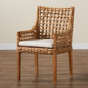 Relax and lounge on the charming Saoka armchair. Handmade in Indonesia, this wood chair displays a natural brown finish. Woven rattan and sloped armrests lend a cozy, casual look. The plush, removable cushion is padded with soft foam and upholstered in a smooth fabric. The distinctive style and superb comfort of the Saoka armchair transform the feel of any space.
