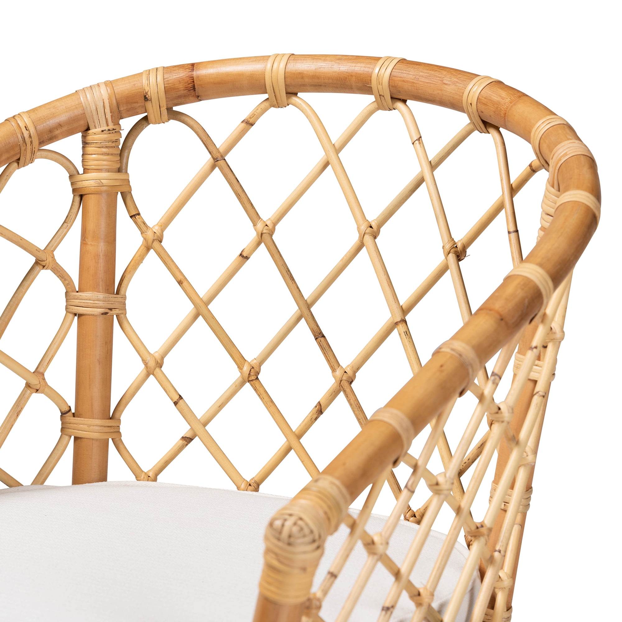 • Modern Bohemian dining chair • Constructed from Natural Rattan • Cushion is padded with foam and upholstered in fabric • Sloping armrests • Woven embellishments • Fully assembled • Made in Indonesia • Product Weight: 13.8 Pound • Package Weight: 19.6 Pound • Overall Dimensions: 33.00″ High x 23.25″ Wide x 22.50″ Deep; Seating Area Dimensions: 19.50″ Wide x 20.00″ Deep x 20.25″ High; Arms: 28.50″High; Legs: 18.00″ High; Back: 12.75″ High; • Product Color: White/Natural Brown • Product Composition: Fabric “70% Cotton, 30% Polyester”/ Rattan/ Foam/ Rattan Semi Pole