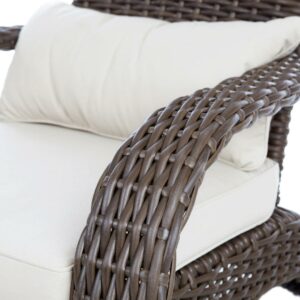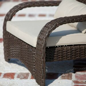 The Deluxe Coconino Wicker Chair is constructed of all-weather half-round wicker and includes a 3″ thick beige cushion and lumbar pillow. This lightweight yet durable Adirondack style chair is perfect for enjoying an evening on the patio or relaxing by the poolside. The attractive mocha finish is the perfect accent for any patio. This wicker chair can be used all year round and provides a maintenance free outdoor seating experience.