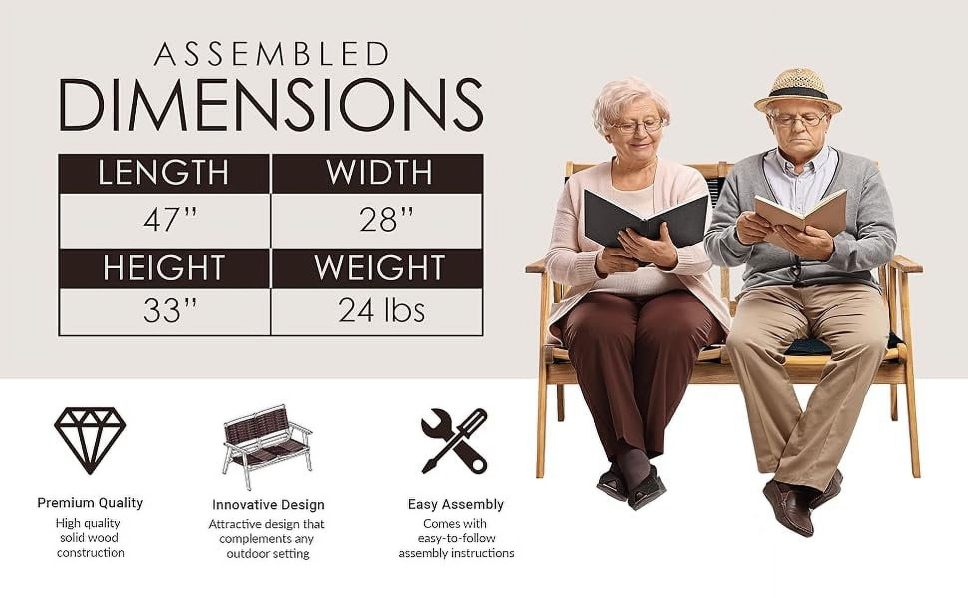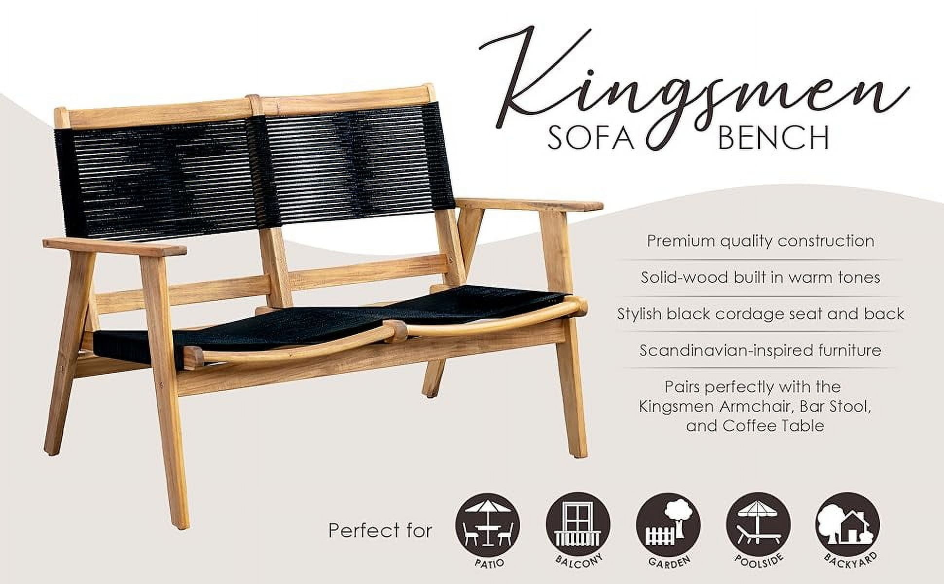 Balkene Home 63368: The Kingsmen Loveseat Bench by Balkene Home is part of our midcentury-modern Scandinavian-inspired collection of indoor outdoor furniture, and pairs perfectly with the Kingsmen Armchair, Loveseat Bench, and Coffee Table to create a versatile seating arrangement. KINGSMEN LOVESEAT BENCH: This two-seat bench features solid-wood construction – with clean lines and modern black cordage suspension seat – plus easy assembly. LOW MAINTENANCE: Coordinates with the rest of the Kingsmen line to complete your entertaining space in style | Solid acacia wood construction in warm teak tones | Stylish black cordage seat. FEATURES: Seamlessly mix & match with other pieces in the collection | Perfect indoors or out | Arrives requiring easy assembly with basic tools | Low maintenance – just wipe clean and store seasonally | Weight limit is 650 lbs. ASSEMBLED DIMENSIONS: 47″L x 28″W x 33″H; Weight; 24 lbs. | Seat: 41″W x 15″H x 21″D | Seat Back: 44″W x 21.5″H.
