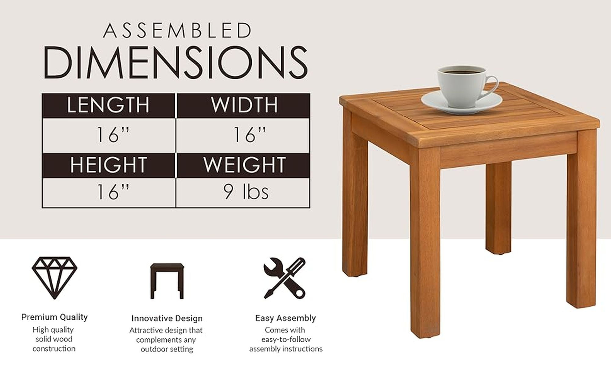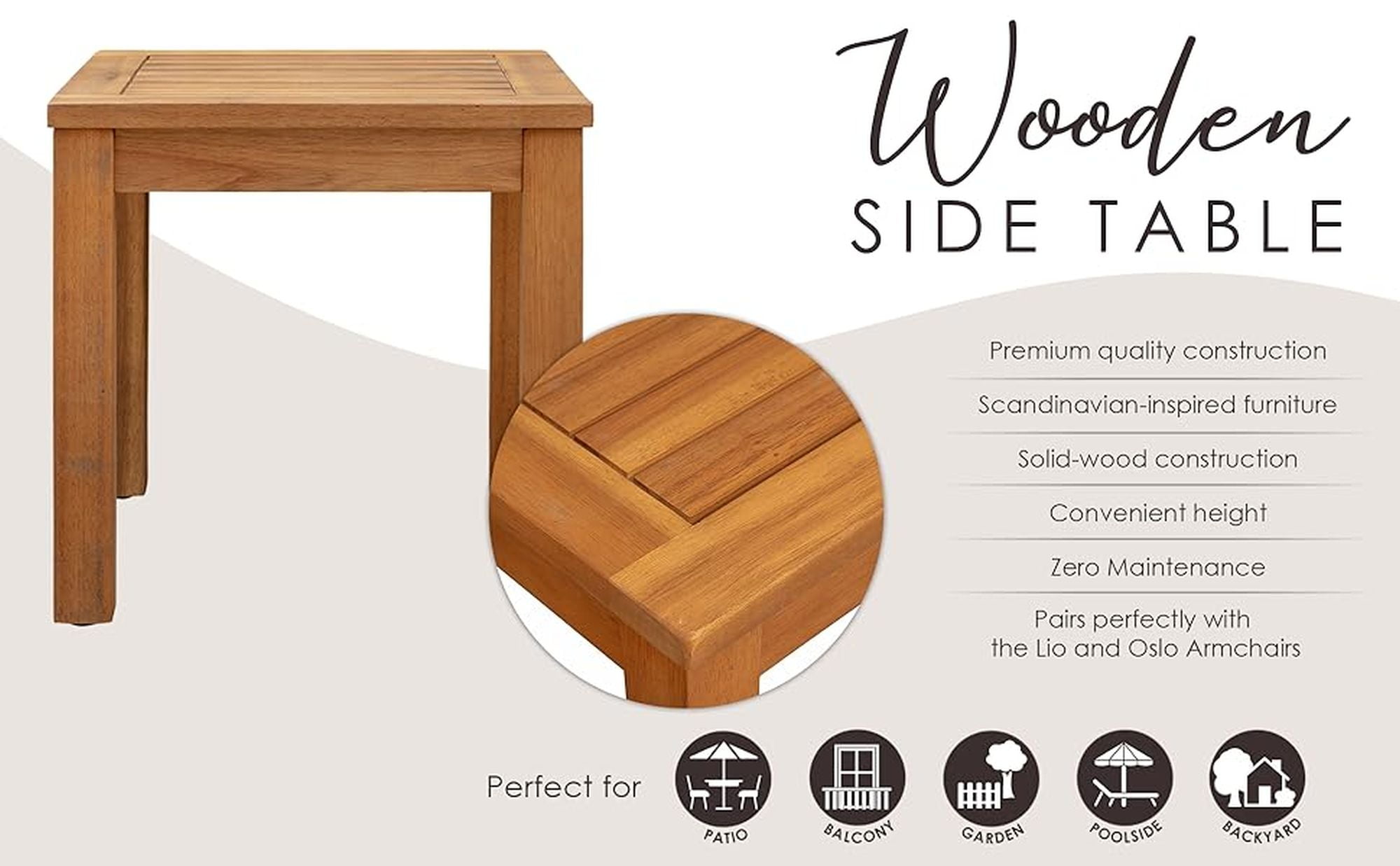 BALKENE HOME 63407: The Wooden Side Table by Balkene Home is part of our midcentury-modern Scandinavian-inspired collection of indoor-outdoor furniture, and pairs perfectly with both the Lio and Oslo Armchairs. LIO/OSLO WOODEN SIDE TABLE: This table features solid-wood construction with clean lines and a convenient height and easy assembly. Compatible with the Lio or Oslo Armchairs to complete your chat area in style. LOW MAINTENANCE: Solid wood construction of the end table ensures long-lasting use for years to come. With clean-lines and minimalistic design, this side table complements every decor. FEATURES: Solid wood construction in warm tones | Seamlessly mix & match with other pieces in the collection | Perfect indoors or out | Low maintenance just wipe clean and store seasonally | Weight limit is 165 lbs. ASSEMBLED DIMENSIONS: 16″W x 16″D x 16″H, Weight; 9 lbs.