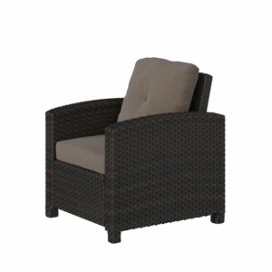 The Balkene Home Miles Outdoor Wicker Club Chair is constructed of all weather wicker and includes comfortable khaki cushions. This lightweight yet durable armchair is perfect for enjoying an evening on the patio or relaxing poolside. The attractive mocha finish is the ideal accent for any patio. This wicker chair can be used year-round and provides a low-maintenance outdoor seating experience.