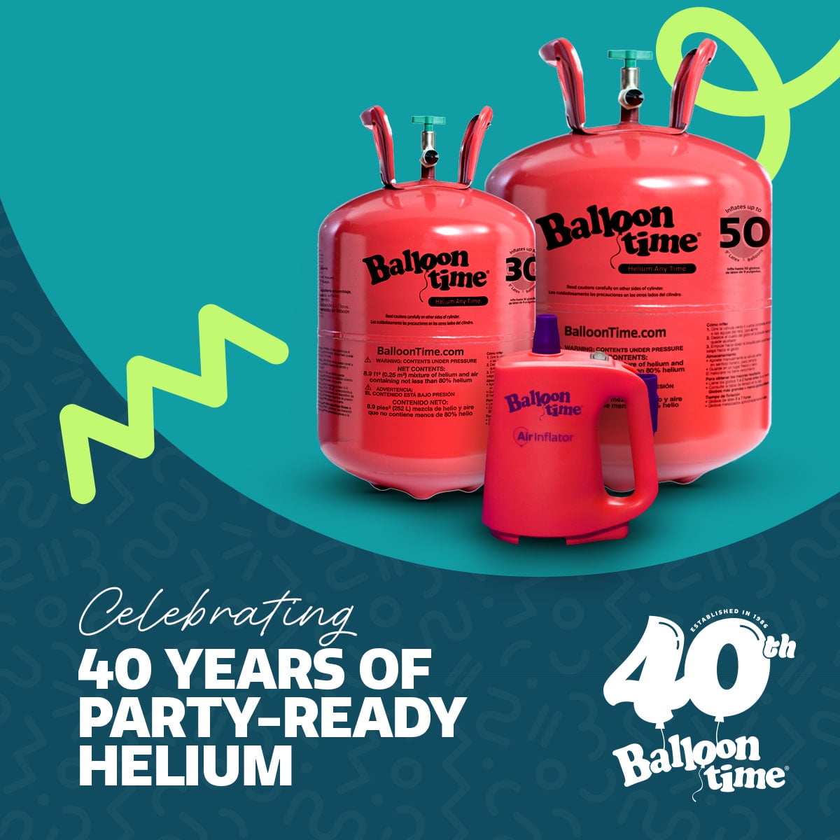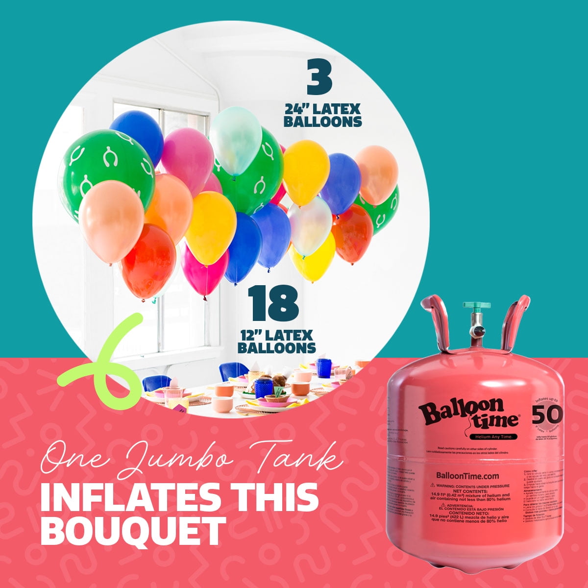 Balloon Time Helium Kits make DIY balloon décor simple and fun. This portable helium tank for balloons allows for easy and convenient setup whether at home or on-the-go, making it perfect for any occasion, including birthdays, bridal showers, everyday moments and graduations. For best results, inflate your latex or foil balloons 1-2 hours before your event. The Helium Kit includes a 12” helium/air mixture tank, a spool of white ribbon and 50 nine-inch latex balloons in assorted colors. Foil and specialty balloons are sold separately. Inflating is easy: Open the tank by rotating the green value four full turns. Place the balloon on the black nozzle; hold in place. Gently press down near the end of the black nozzle to release helium. Fill latex balloons to resemble the shape of an egg, not a lightbulb. Tie a knot in the balloon and attach ribbon between the knot and the end of the balloon. Close the tank twisting the green valve when you are finished to save unused helium for later use. Balloon Time Helium Tanks can be safely stored in a cool, dry place or recycled when empty. Visit the Balloon Time website for more information.