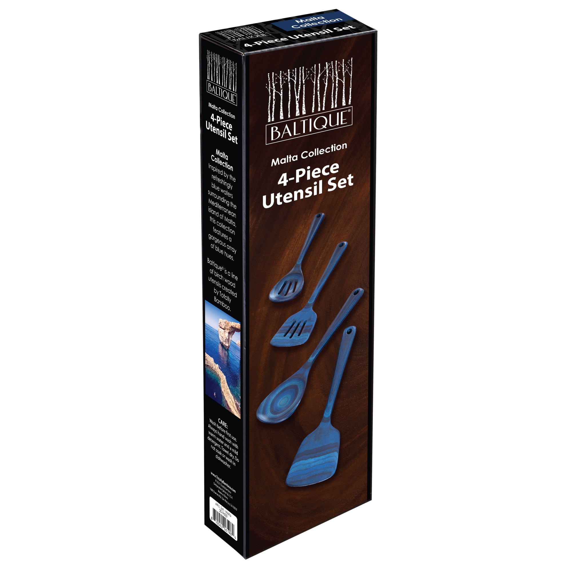 Add a splash of brilliant blue to your kitchen with the Baltique Malta Collection 4-Piece Utensil Set. These eye-catching utensils are masterfully crafted from layers of colored birched wood to create a gorgeously deep color array. The Malta Collection features a blend of deep blues inspired by the refreshing waters surrounding the picturesque Mediterranean island. This beautifully colored utensil set includes the most popular kitchen tools in the collection; a Mixing Spoon, Slotted Spoon, Spatula and Slotted Spatula. The Mixing Spoons are perfect for stirring up soups and sauces while the Spatulas are great for flipping and turning foods. When the cooking is complete, these eye-catching utensils are sure to impress guests at the dinner table. Each utensil measures 12-1/2 inches long, is safe for use on nonstick coatings and includes a convenient hanging hole for easy storage and display. To clean, hand wash or wipe with a damp cloth; do not soak or wash in the dishwasher.