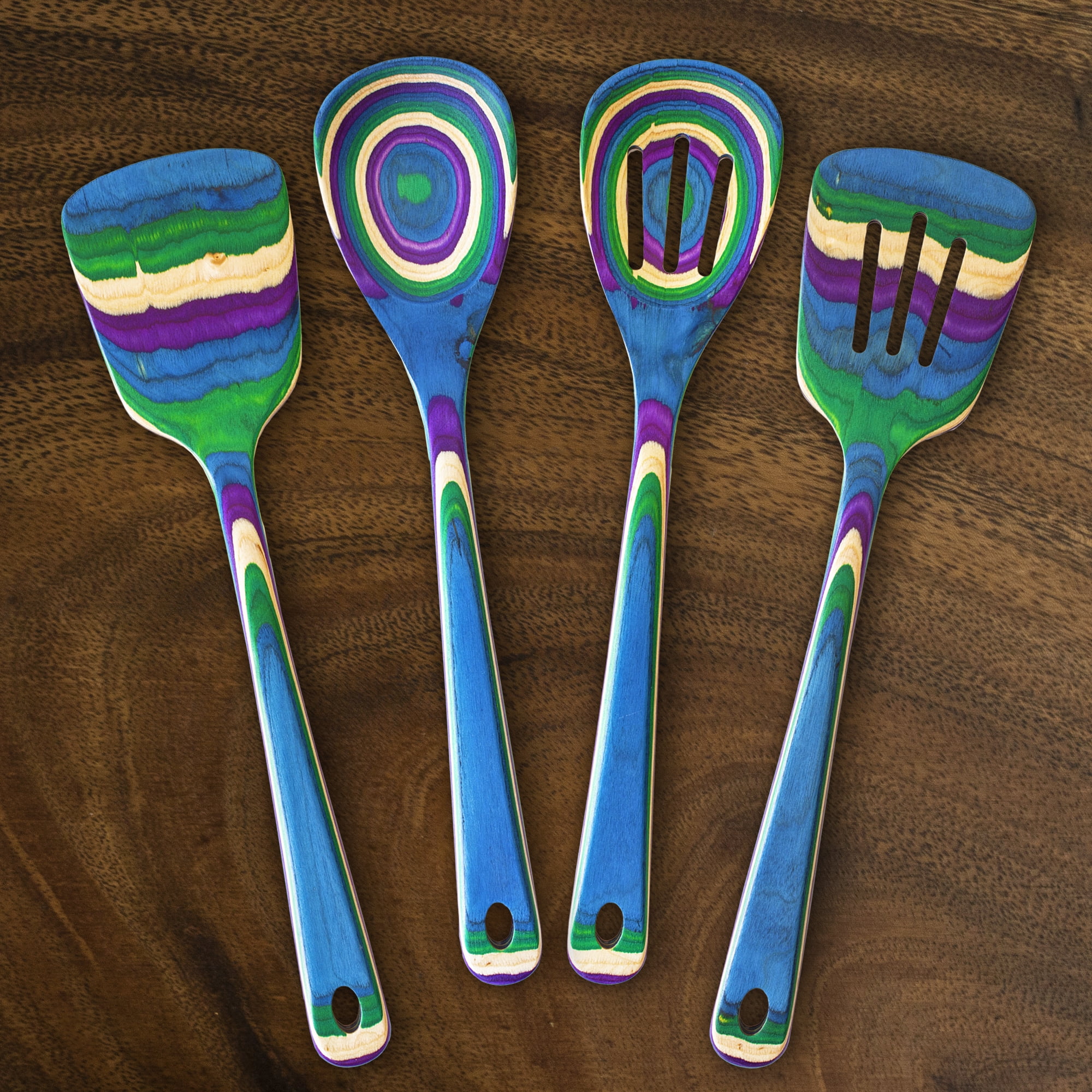 CRAFTED WITH COLOR: These gorgeous utensils feature an eye-catching blend of electric blue, vibrant green, royal purple and natural birch wood colors A VARIETY OF FUNCTIONAL TOOLS: 4 piece utensil set includes a Mixing Spoon, Slotted Spoon, Spatula and Slotted Spatula MASTERFUL MIXING SPOONS: At 12-1/2 inches long, these beautiful mixing spoons can reach even the deepest of cooking pots; they’re perfect for stirring up soups and sauces SPLENDID SPATULAS: These beautiful spatulas have ample length for flipping and turning food as well as for serving guests AN ESCAPE FROM ORDINARY UTENSILS: Our Mumbai collection takes inspiration for its vibrant color array from the extravagant plumage of India’s national bird, the peacock