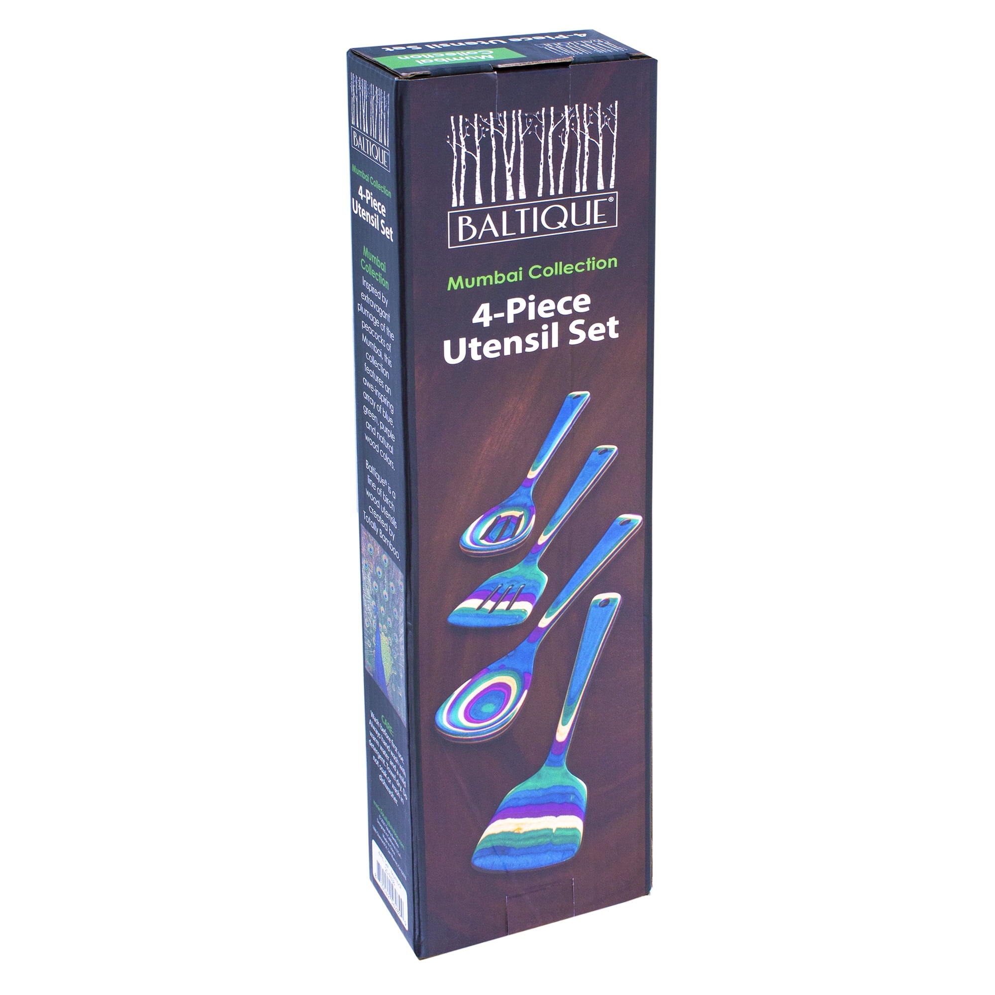 Add a splash of lavish color to your kitchen with the Baltique Mumbai Collection 4-Piece Utensil Set. This distinctive utensil set is masterfully crafted from layers of colored birch wood to create a gorgeous color array. Our Mumbai collection is inspired by the extravagant plumage of India’s national bird, the peacock. The blend of electric blue, vibrant green, noble purple and natural birch wood bring an eye-catching pop of color to the kitchen. This vibrantly colored utensil set includes the most popular kitchen tools in the collection; a Mixing Spoon, Slotted Spoon, Spatula and Slotted Spatula. The Mixing Spoons are perfect for stirring up soups and sauces while the Spatulas are great for flipping and turning foods. When the cooking is complete, these boldly colored utensils are sure to impress guests at the dinner table. Each utensil measures 12-1/2 inches long, is safe for use on nonstick coatings and includes a convenient hanging hole for easy storage and display. To clean, hand wash or wipe with a damp cloth; do not soak or wash in the dishwasher.