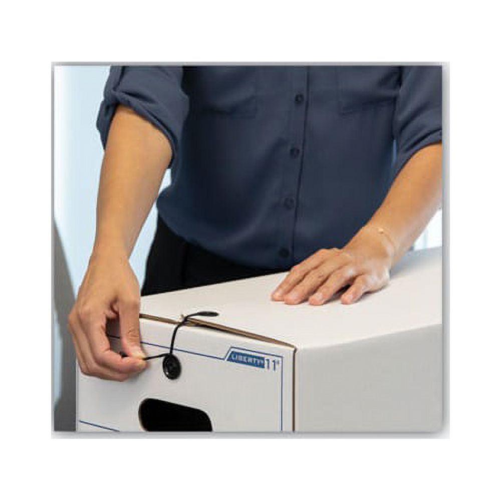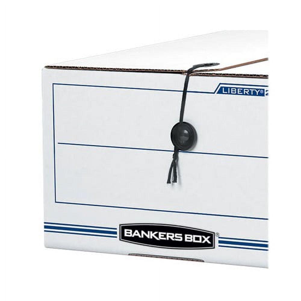 Strong, durable storage boxes are designed for frequent access and maximum stackability. Maximum security box with string-and-button closure keeps your record form-size files secure, even if box is overturned. Reinforced plastic handle makes it easy to pull box off shelving. Storage boxes offer easy one-step FastFold setup. Stacking weight is 375 lb. Bankers Box Liberty Check and Form Boxes, White, Blue.