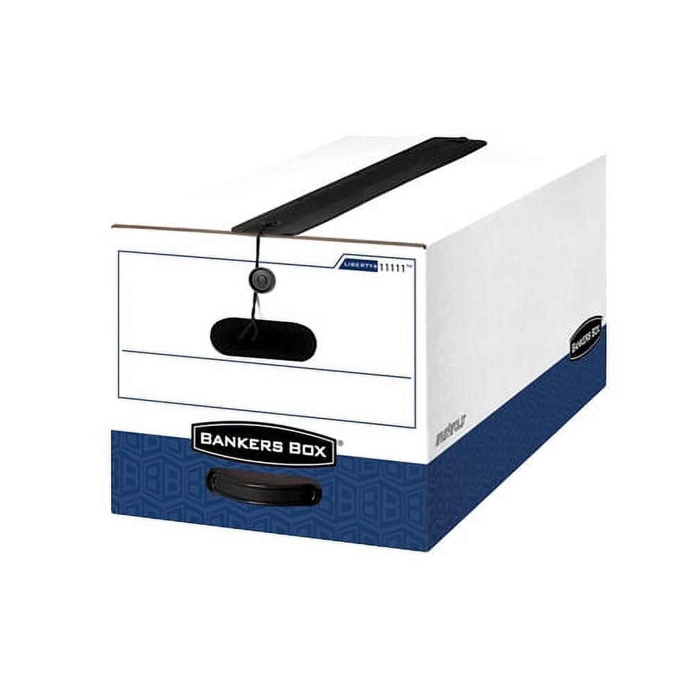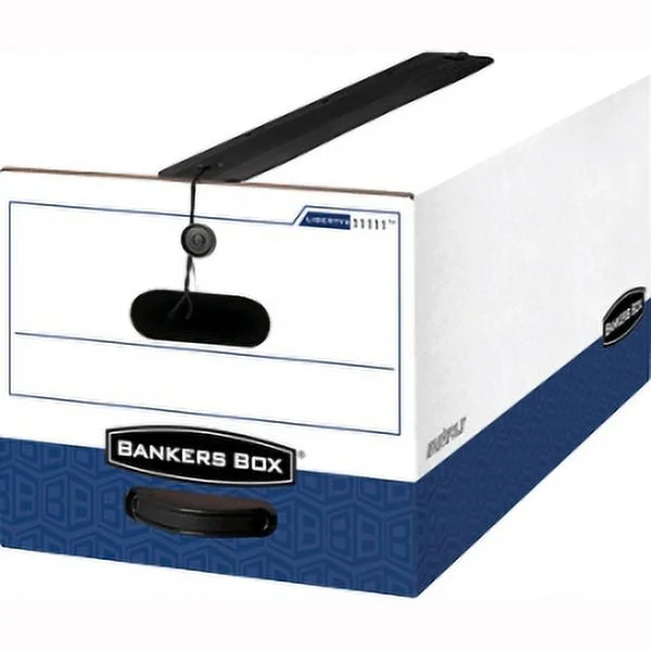 Three-inch seal protects stored files from dust and dirt and ensures a flat top for stable stacking. Maximum security design with string and button closure keeps contents secure, even if box is overturned. Up to 50% stronger than other string and button boxes for stacking without shelving. FastFold® quick and easy assembly. Reinforced, plastic handle makes it easy to pull a box out of a stack or off shelving. Ensures flat top for stable stacking. Box Type: Stackable File Storage; Box Style: FastFold® Quick & Easy Assembly; Strength: Heavy-Duty; File Size Format: Legal.