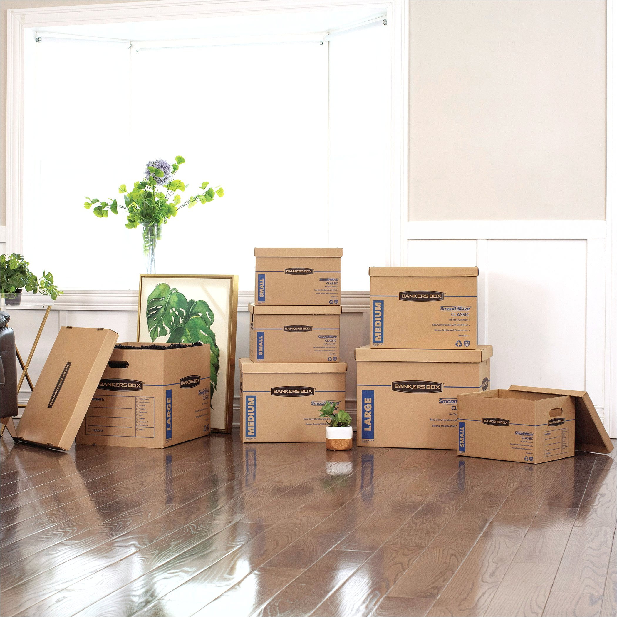 Quick Assembly: no tape is required, so you can quickly and easily assemble the boxes Durable and : unique double wall construction for extra strength on sides and bottom, and using strong 32 ECT B-Flute Kraft corrugated board Built In Handles: reinforced, easy carry handles make it simple to carry and move your boxes Convenient lift-off lid: quick access to your items when needed but the lid stays secure while transporting your moving boxes Recyclable, Stackable, and Reusable: our stronger moving boxes are easier to keep organized in stacks, quick to break down as needed, and store flat until ready to reuse 100+ years of experience: Bankers Box is a brand built with your moving projects in mind, offering strength and reliability to protect your more valuable items