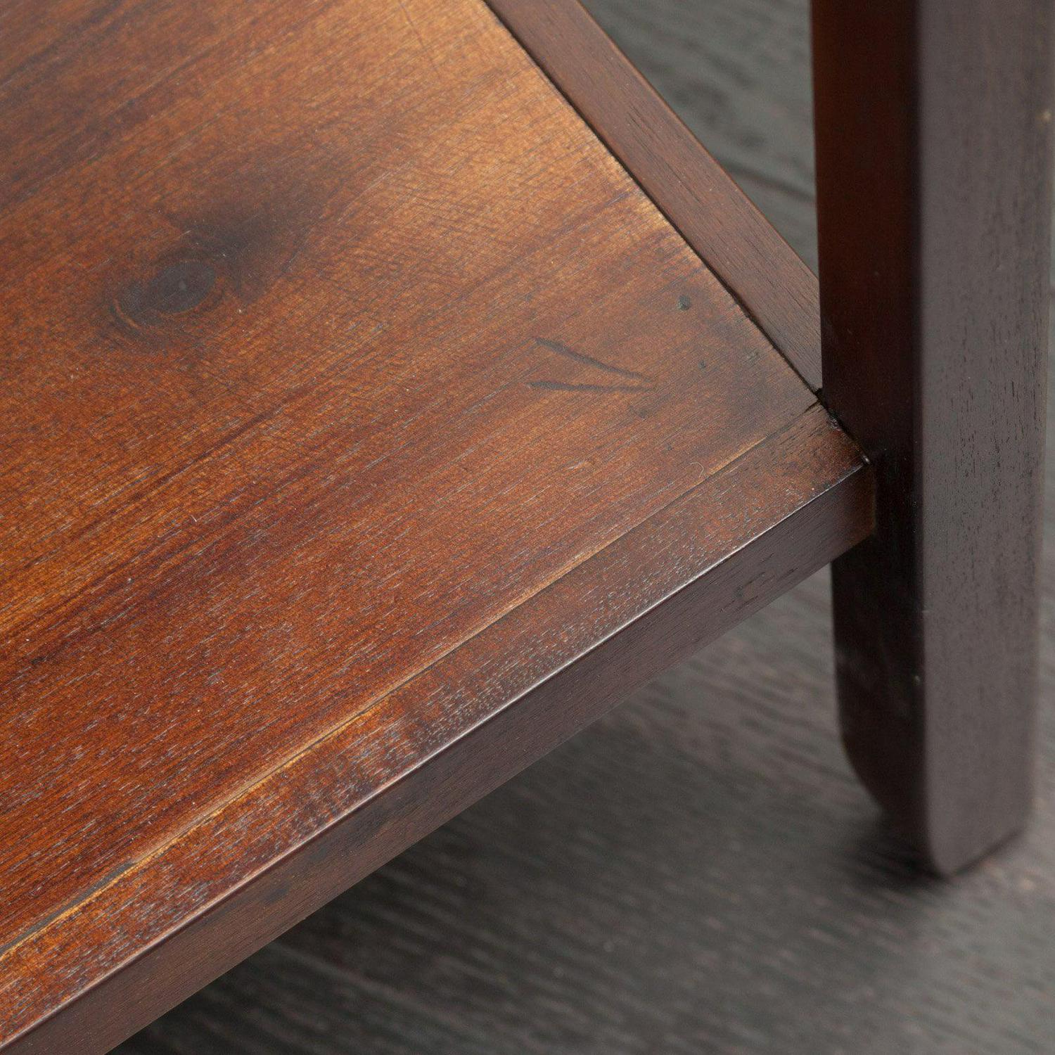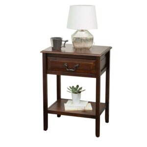 Add a classic accent to your room with the Banks Acacia Wood Accent End Table. The traditional design of this end table will blend well with any décor. A shelf and drawer provide convenient storage and display space. The rich, mahogany finish offers a luxurious feel. Crafted with laminated acacia, this end table is sure to stand up to everyday use. Enjoy the traditional look of this table in your living room.