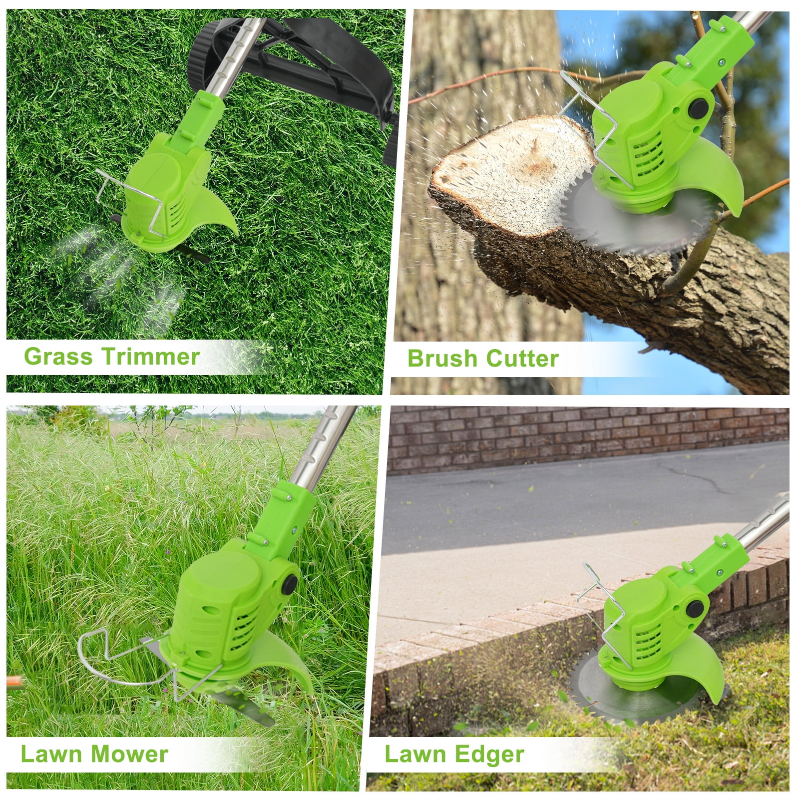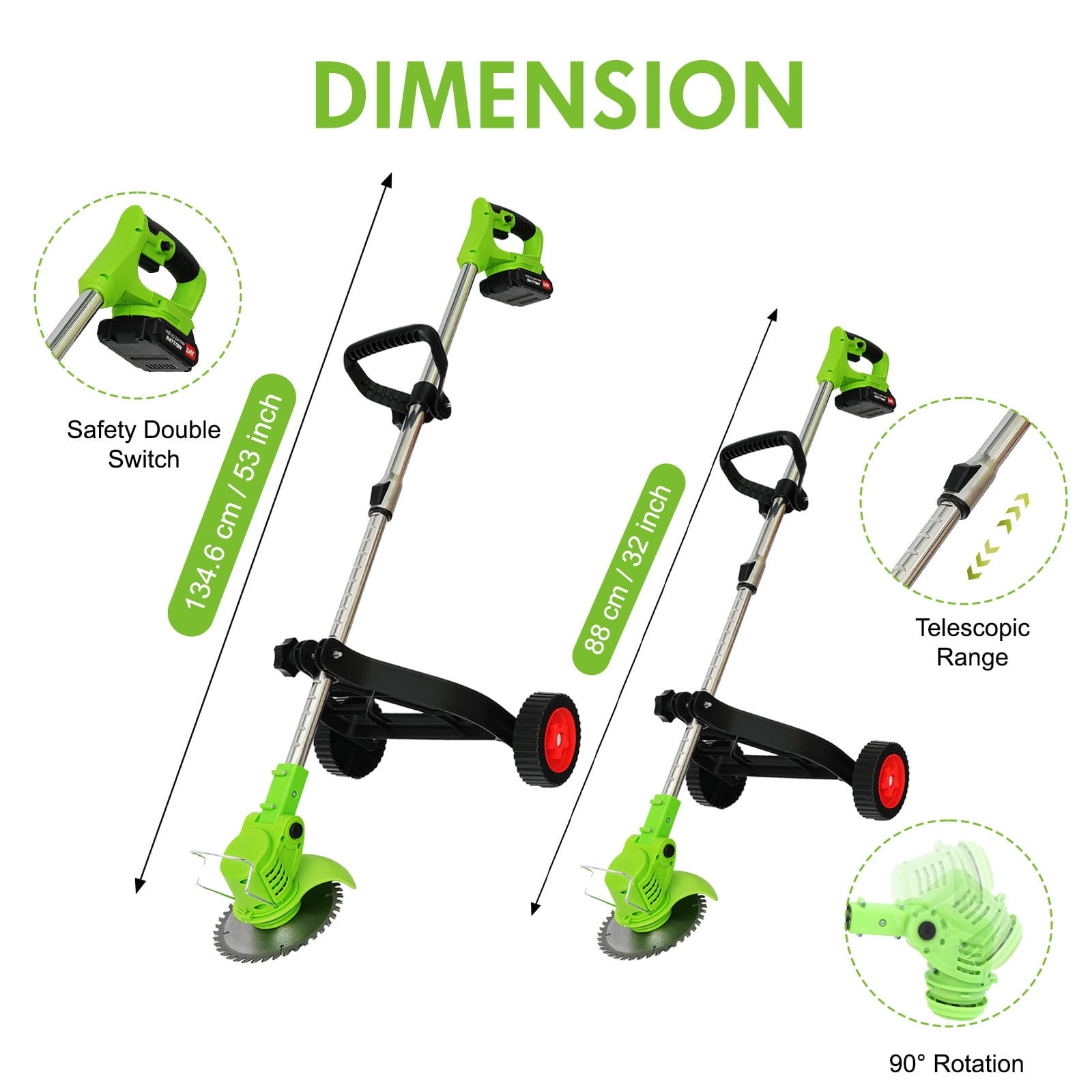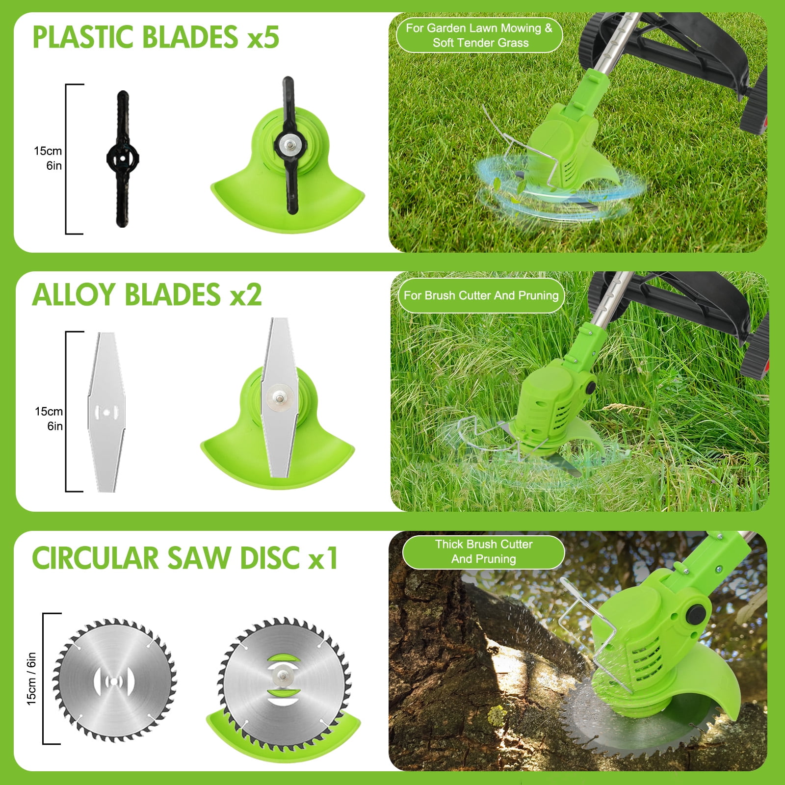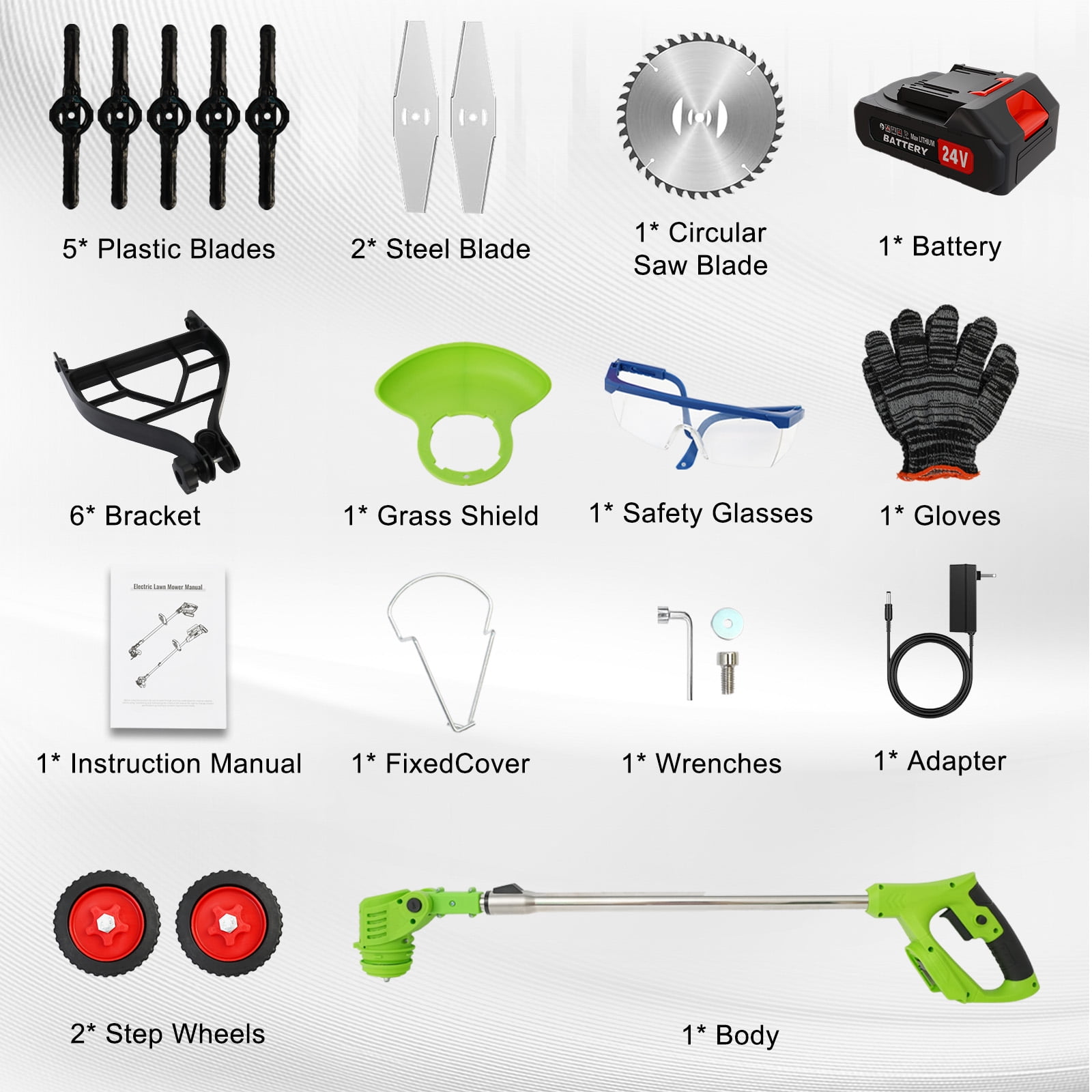 🌳About Item: 【Lightweight and Powerful, Grass Worry-free】On the journey of lawn trimming, let our cordless electric grass trimmer be your powerful assistant.No longer constrained by wires, no longer worried about motor burnout, our product brings a new grass trimming experience with its powerful performance and lightweight design. 【Powerful Functionality】Utilizing a durable and reliable cordless grass trimmer motor with a 18000 RPM no-load speed, it effortlessly tackles various lawn conditions. 【Lightweight and Convenient】Weighing only 3.6 pounds and equipped with a lightweight portable charger, grass trimming work is no longer tedious.Even women and the elderly can easily handle it and enjoy the pleasure of grass trimming. 【Efficient Battery】Equipped with an 800W high-power motor, 8500 RPM, and two rechargeable 2000mAh high-capacity 24V batteries, it completes grass trimming tasks at once.With 10% higher grass trimming capacity than other products, it’s safer and more durable. 【Multi-functional Design】A 3-IN-1 lawn trimming tool that not only acts as a lawn trimmer but also effortlessly converts into a wheeled lawn trimmer and sidewalk trimmer.With a full 90° rotating head and adjustable telescopic shaft, you can easily trim even in narrow spaces, enjoying a comfortable experience. 【Multiple Blades】Equipped with 6-inch saw blades, stainless steel blades, and plastic blades, suitable for different lawn conditions, allowing you to quickly and efficiently complete trimming tasks. 【Version Upgrade】The new version features a step-type brush cutter with side cutting blades, making it more effective in handling tender grass, avoiding motor entanglement, and extending its lifespan. 【Safe and Practical】Featuring a protective ring design, it protects plants and landscapes, avoiding contact with hard objects, ensuring a stable and efficient trimming experience. 【Ergonomic Design】With a small push design that conforms to ergonomics, it provides a comfortable and balanced operating experience, allowing easy control and movement in the garden, achieving quick and efficient grass trimming. 🌳Specification: Type: Lithium Battery Grass Trimmer Power Input: 24V No-load Speed: 18000 RPM Working Speed: 8500 RPM Battery Type: 2000mAh Lithium Battery Charging Time: 2 hours per battery Dimensions: 45 x 5.9 x 5.9 inches / 114 x 15 x 15 cm Assembly Required: Yes 🌳Package Contents: Machine * 1 Lithium Battery * 1 (2000mAh 5C) Charger * 1 Socket Wrench * 1 Saw Blade * 1 Stainless Steel Blade * 2 Plastic Blade * 5 Safety Goggles * 1 Protective Gloves * 1 Instruction Manual * 1