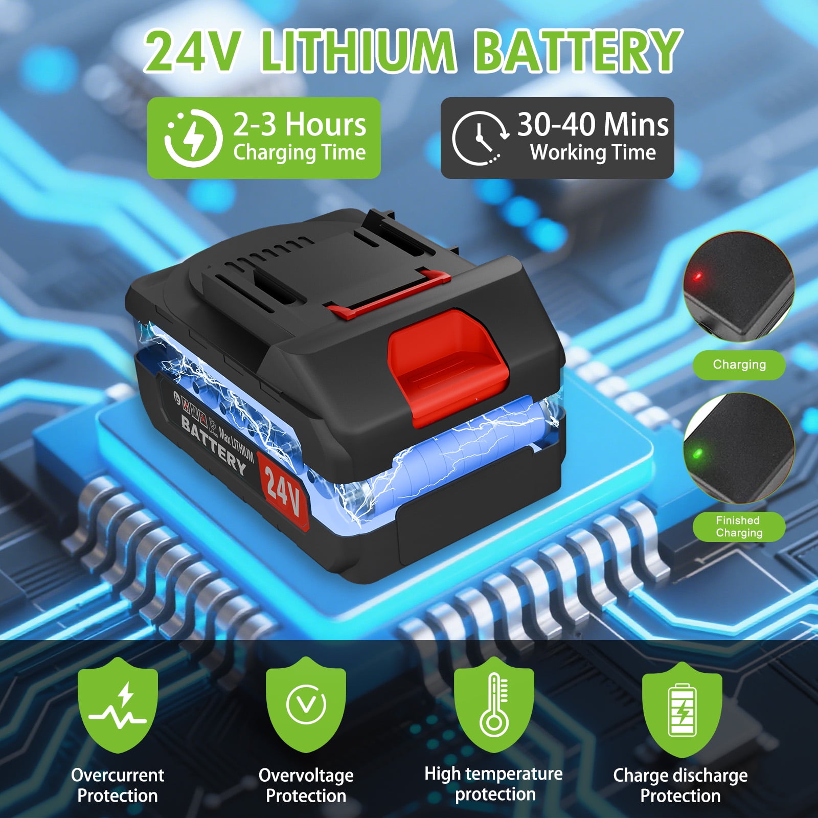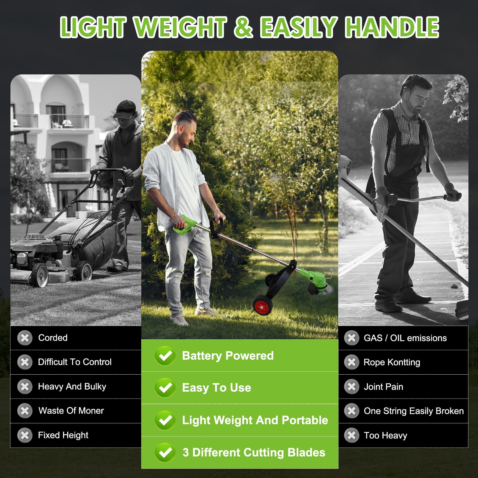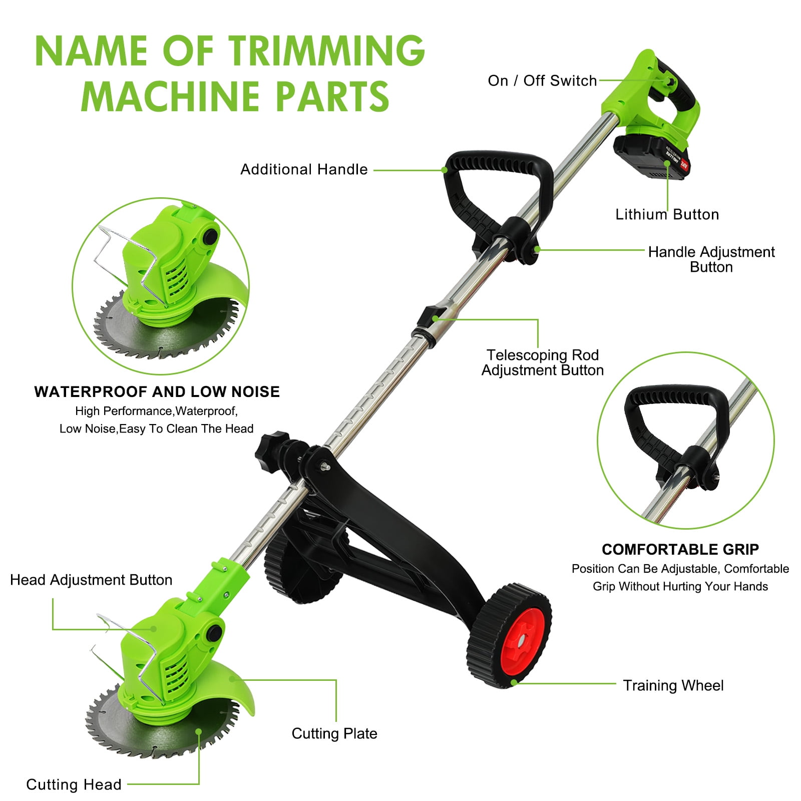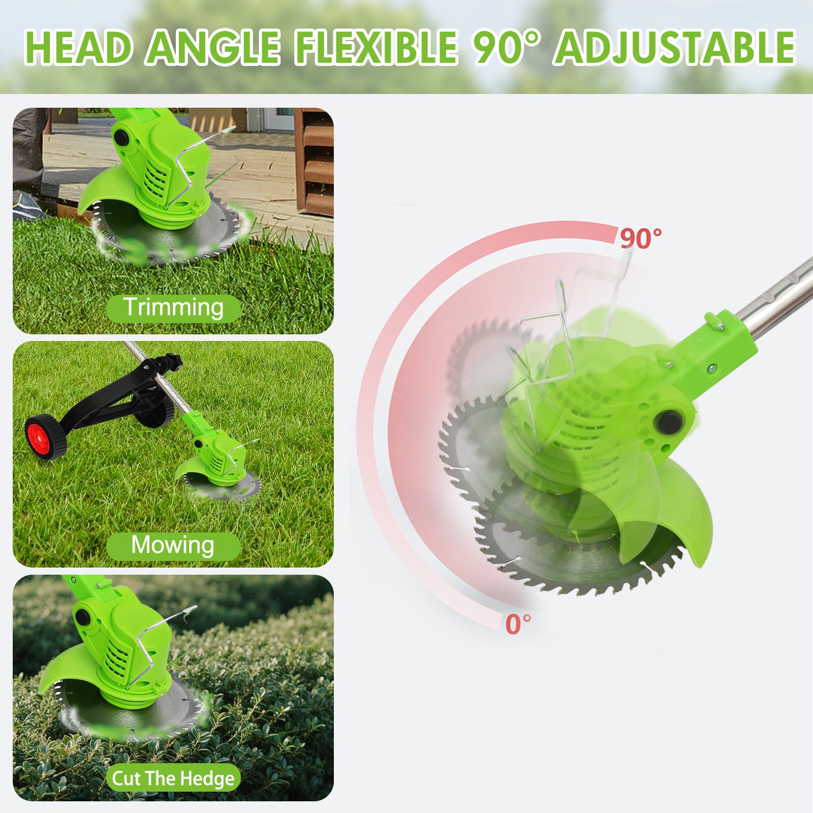 🌳About Item: 【Lightweight and Powerful, Grass Worry-free】On the journey of lawn trimming, let our cordless electric grass trimmer be your powerful assistant.No longer constrained by wires, no longer worried about motor burnout, our product brings a new grass trimming experience with its powerful performance and lightweight design. 【Powerful Functionality】Utilizing a durable and reliable cordless grass trimmer motor with a 18000 RPM no-load speed, it effortlessly tackles various lawn conditions. 【Lightweight and Convenient】Weighing only 3.6 pounds and equipped with a lightweight portable charger, grass trimming work is no longer tedious.Even women and the elderly can easily handle it and enjoy the pleasure of grass trimming. 【Efficient Battery】Equipped with an 800W high-power motor, 8500 RPM, and two rechargeable 2000mAh high-capacity 24V batteries, it completes grass trimming tasks at once.With 10% higher grass trimming capacity than other products, it’s safer and more durable. 【Multi-functional Design】A 3-IN-1 lawn trimming tool that not only acts as a lawn trimmer but also effortlessly converts into a wheeled lawn trimmer and sidewalk trimmer.With a full 90° rotating head and adjustable telescopic shaft, you can easily trim even in narrow spaces, enjoying a comfortable experience. 【Multiple Blades】Equipped with 6-inch saw blades, stainless steel blades, and plastic blades, suitable for different lawn conditions, allowing you to quickly and efficiently complete trimming tasks. 【Version Upgrade】The new version features a step-type brush cutter with side cutting blades, making it more effective in handling tender grass, avoiding motor entanglement, and extending its lifespan. 【Safe and Practical】Featuring a protective ring design, it protects plants and landscapes, avoiding contact with hard objects, ensuring a stable and efficient trimming experience. 【Ergonomic Design】With a small push design that conforms to ergonomics, it provides a comfortable and balanced operating experience, allowing easy control and movement in the garden, achieving quick and efficient grass trimming. 🌳Specification: Type: Lithium Battery Grass Trimmer Power Input: 24V No-load Speed: 18000 RPM Working Speed: 8500 RPM Battery Type: 2000mAh Lithium Battery Charging Time: 2 hours per battery Dimensions: 45 x 5.9 x 5.9 inches / 114 x 15 x 15 cm Assembly Required: Yes 🌳Package Contents: Machine * 1 Lithium Battery * 1 (2000mAh 5C) Charger * 1 Socket Wrench * 1 Saw Blade * 1 Stainless Steel Blade * 2 Plastic Blade * 5 Safety Goggles * 1 Protective Gloves * 1 Instruction Manual * 1
