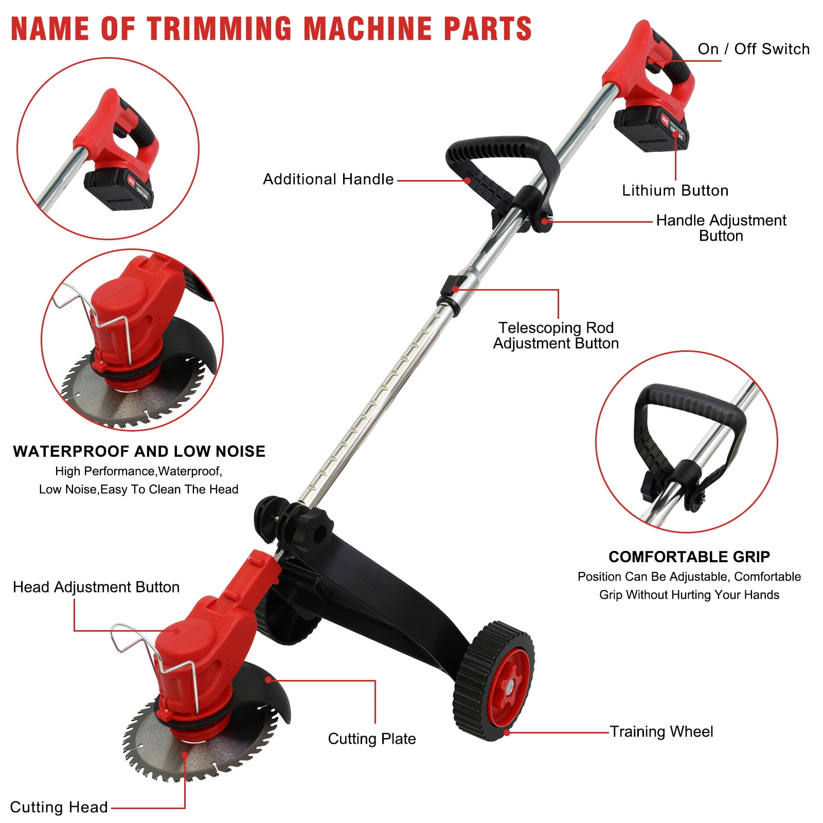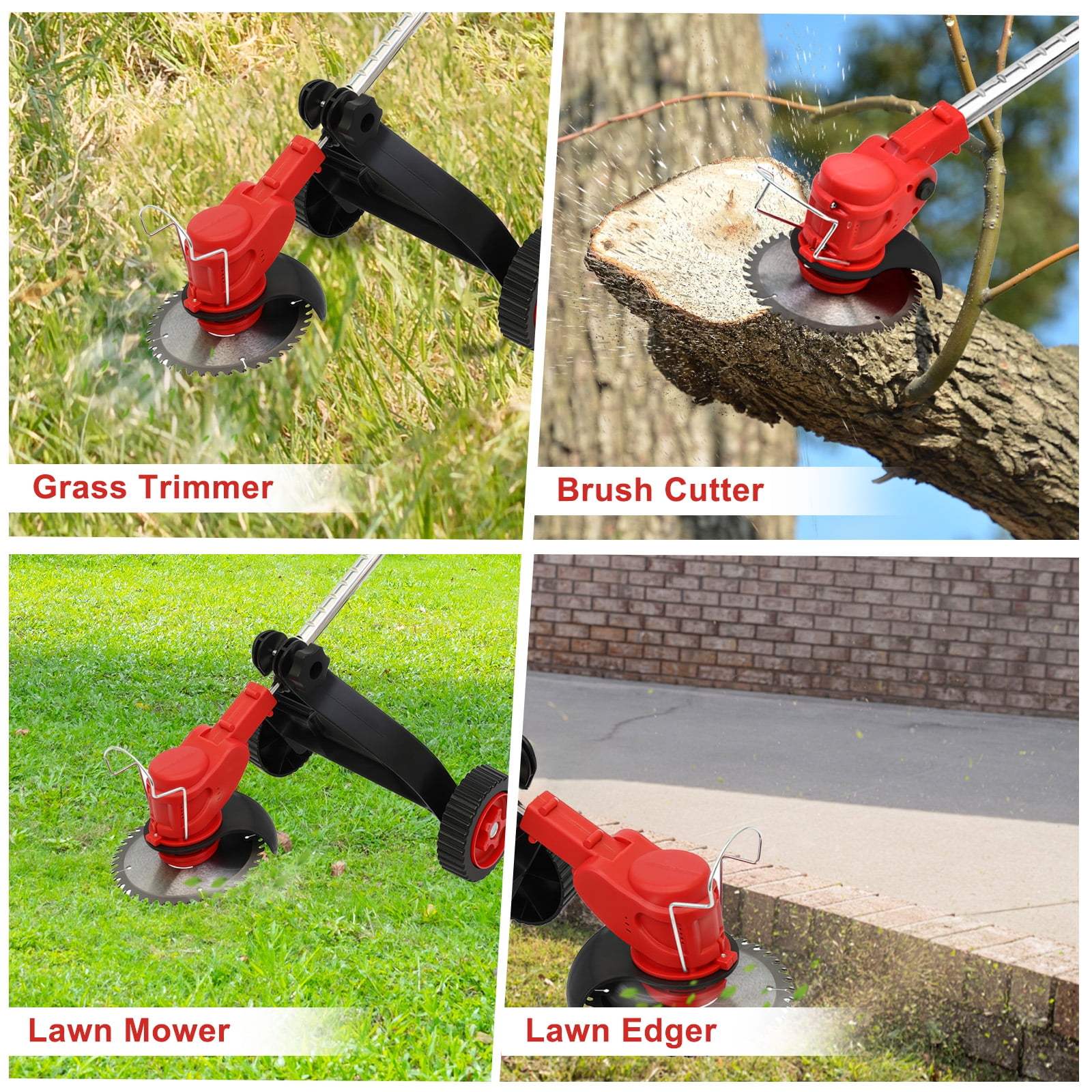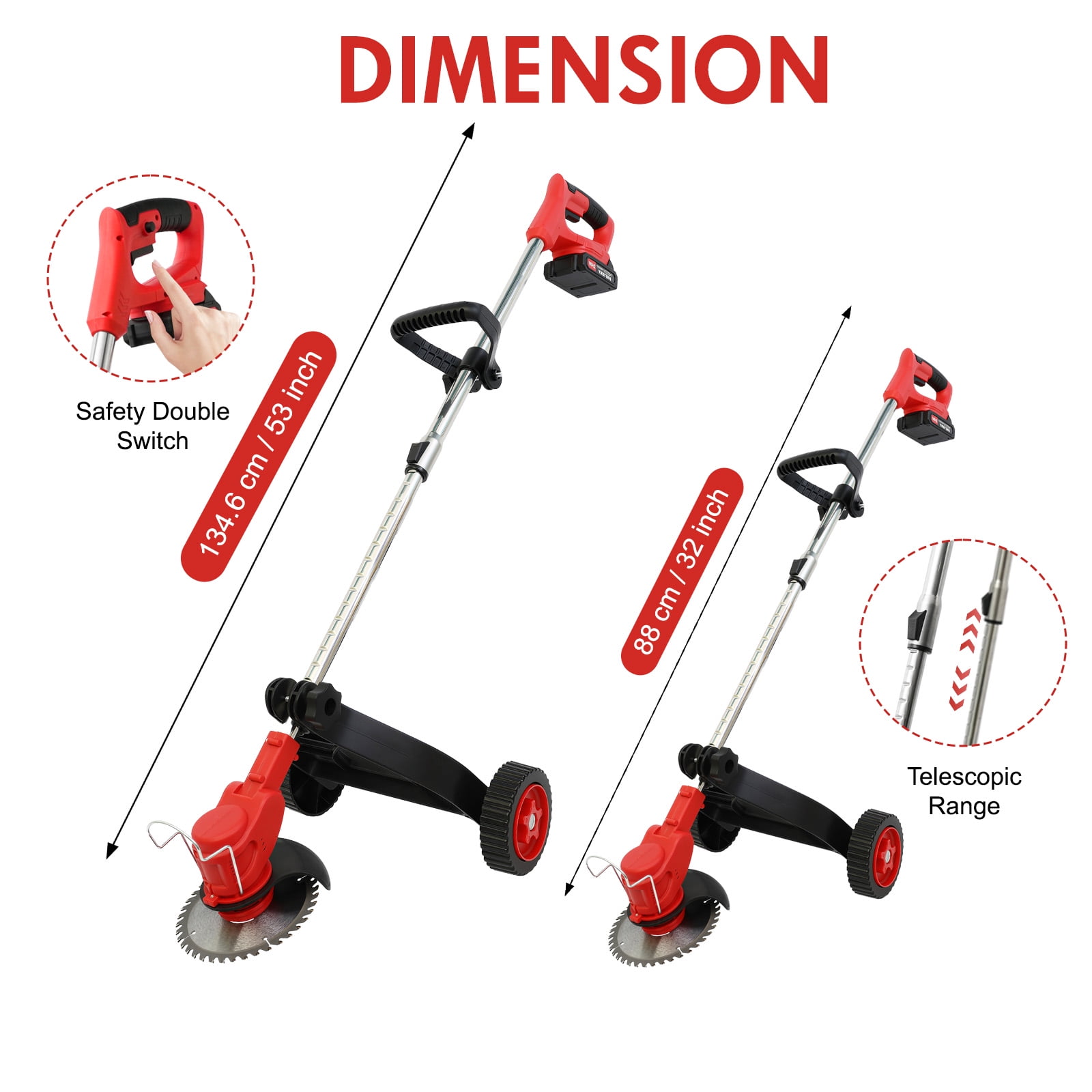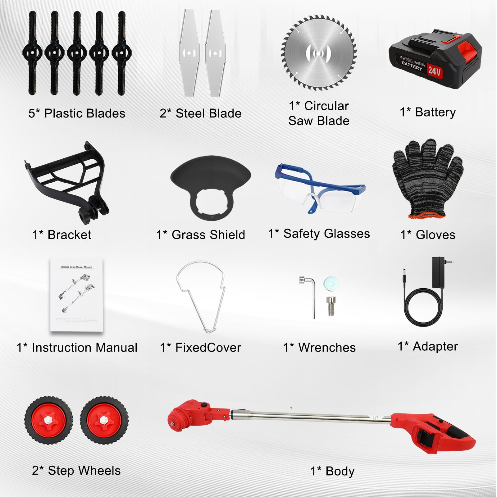 💒About Item: 【High Power and High Efficiency】This lawn mower is equipped with a high-power motor, which can easily cope with a variety of grass types, whether it is a dense lawn or a messy weed, it can be cut in a short time.The efficient motor drive makes the mower more stable during operation, reducing the possibility of jamming and malfunctions, so that your mowing work is twice as effective with half the effort. 【Portable Cordless Design】Say goodbye to cumbersome wire bondage, this lawn mower adopts a cordless design, allowing you to mow the grass as you want in the yard without being limited by wires.The built-in large-capacity lithium battery is durable, allowing you to maintain high efficiency and stability even during long mowing operations. 【Telescopic Handle and Adjustable Wheel】The height of the telescopic rod can be adjusted freely according to your needs.Therefore, it provides maximum safety regardless of the size of the body and works in a comfortable position to reduce the pressure on the lower back.At the same time, the lawn mower is also equipped with adjustable wheels, which can easily cope with flat grass or undulating small slopes, making your mowing experience smoother. 【Safety Design】This weeder has double switches, double safety controls, and comes with a protective cover to prevent debris from splashing, while the safety lock design can ensure your safety. 【Low Noise Design】This lawn mower adopts a low noise design, which has very low noise during operation, allowing you to maintain a quiet courtyard environment while enjoying the fun of mowing.Whether it’s early morning or late afternoon, you can enjoy mowing the grass in tranquility. 【3 kinds of lawn mower blade integrated design】The lawn mower innovatively adopts the integrated design of 3 kinds of lawn mower blades, whether it is fine trimming or rough cutting, it can easily deal with it.The plastic blade is suitable for mowing on soft lawns;The stainless steel metal blade is suitable for pruning weeds and small shrubs, and the 40-tooth alloy blade is ideal for cutting coarse shrubs, twigs and seedlings.(Please choose the correct blade when weeding to avoid damaging the blade.) 💒Specification: Type: Weeder Material: Aluminum + plastic Color: Red Plug: American plug Power input :24V Battery: Lithium battery, 24V Power :800W Number of batteries :1 5C2000 battery No-load speed (without tool):21000r/min Charging time: about 2h Dimensions :45×5.9×5.9 inches /114*15*15CM Assembly required: Yes 💒Package Contents: 1x Weeder 1x 24V rechargeable lithium-ion battery 1x Charger 1x 6″ saw blade 1x side-cutting blade 2 metal blades 5x plastic blades 1x wheels 2 rotary wrenches 1 pair of non-slip gloves 1 pair of safety glasses 1x User Manual 💒Note: When you use the electric weeder brush trimmer for the first time, please fully charge the battery. Charge before use for longer life. Uninstall the battery immediately after use to keep the power off. Please pay attention to safety when using, wear protective measures, stay away from crowds and bodies, and avoid being cut by blades. It is forbidden to replace the blade in the energized state!