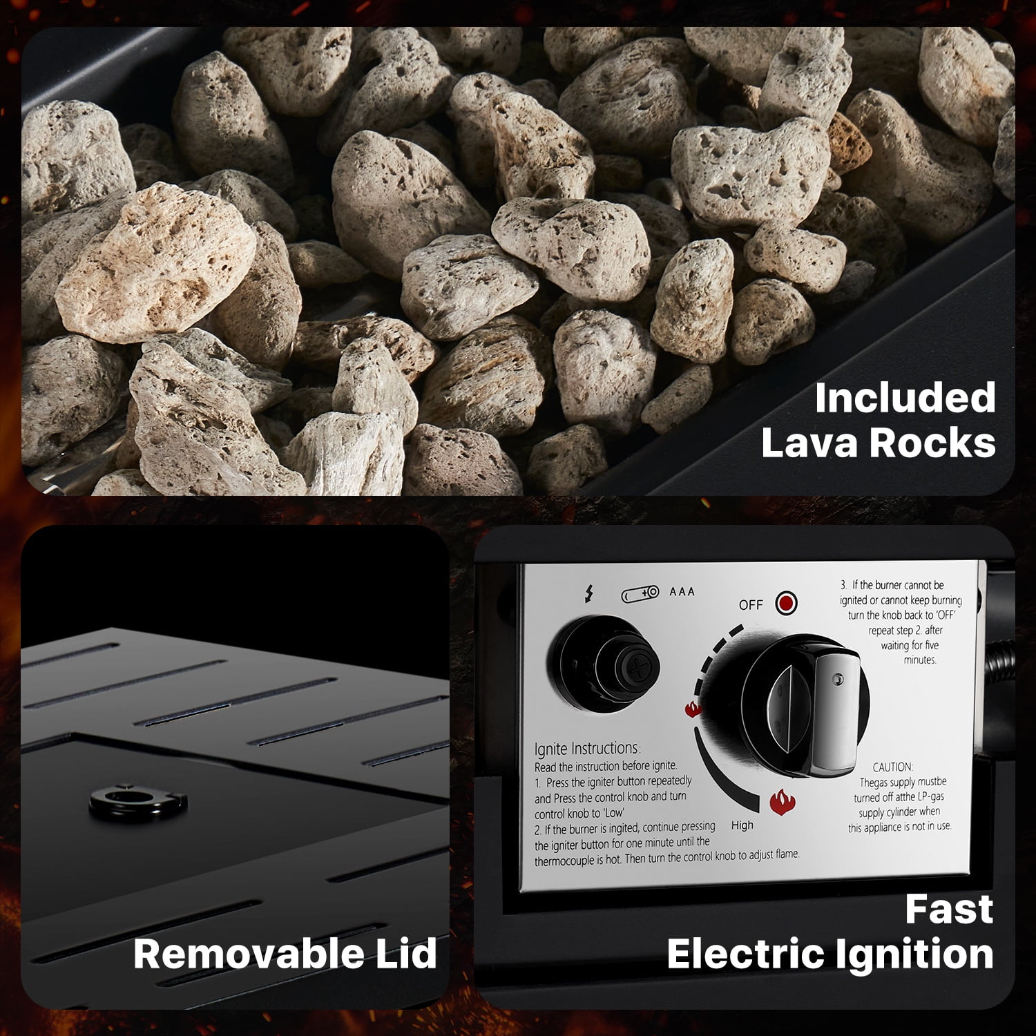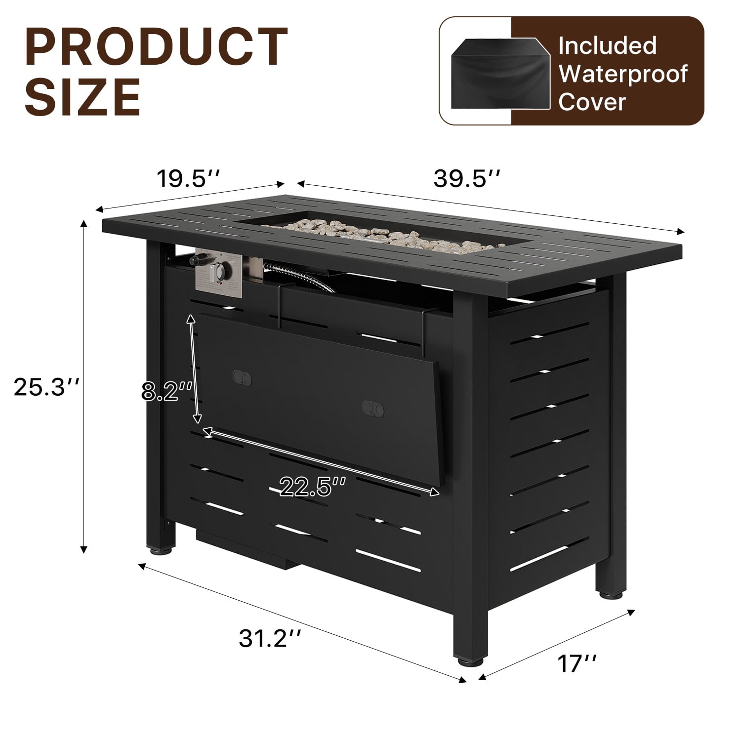 Durable Carbon Steel Material: Crafted from high-quality carbon steel, this fire pit table ensures exceptional durability and long-lasting performance. The robust material is designed to withstand outdoor elements, providing a reliable and sturdy centerpiece for your outdoor space. 50,000 BTUs of Heat: Equipped with a powerful burner capable of producing 50,000 BTU of heat, this outdoor fire pit table offers impressive warmth and comfort. Its high heat output is perfect for creating a cozy ambiance during cool evenings and enhancing your outdoor gatherings. Waterproof Lid and Storage Shelf: The patio fire pit table includes a waterproof lid that protects the burner when not in use, keeping it safe from the elements. Additionally, a convenient side storage shelf provides ample space for storing fire pit accessories, fire starters, or other essentials. 2 in 1 Versatile Table : Beyond its function as a fire pit, this product can be used as a wonderful table to put drinks and food on or decorative piece. Its versatile design allows it to seamlessly integrate into your outdoor setting, providing practical use and style. Waterproof Cover and After Sales: A waterproof cover is included to safeguard the fire pit table from rain, dust, and debris, ensuring it remains in excellent condition.The fire pit table comes with detailed instruction books. All necessary hardware and tools are also included. If you have any questions, please feel free to contact us. Specification: Modern and elegant design Electronic ignition devices Beautiful blue glass beads Two side hooks for easy using Waterproof PVC cover for easy storage Secure and spacious metal desktop Suitable for 20 lbs propane stove
