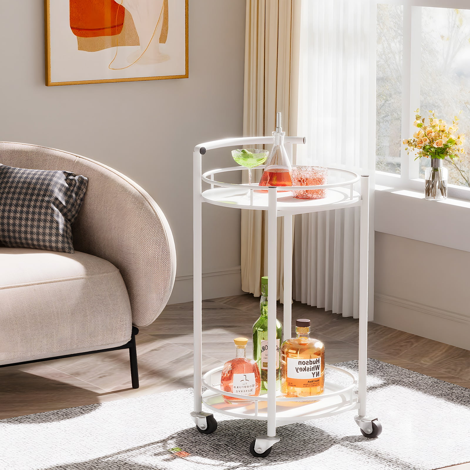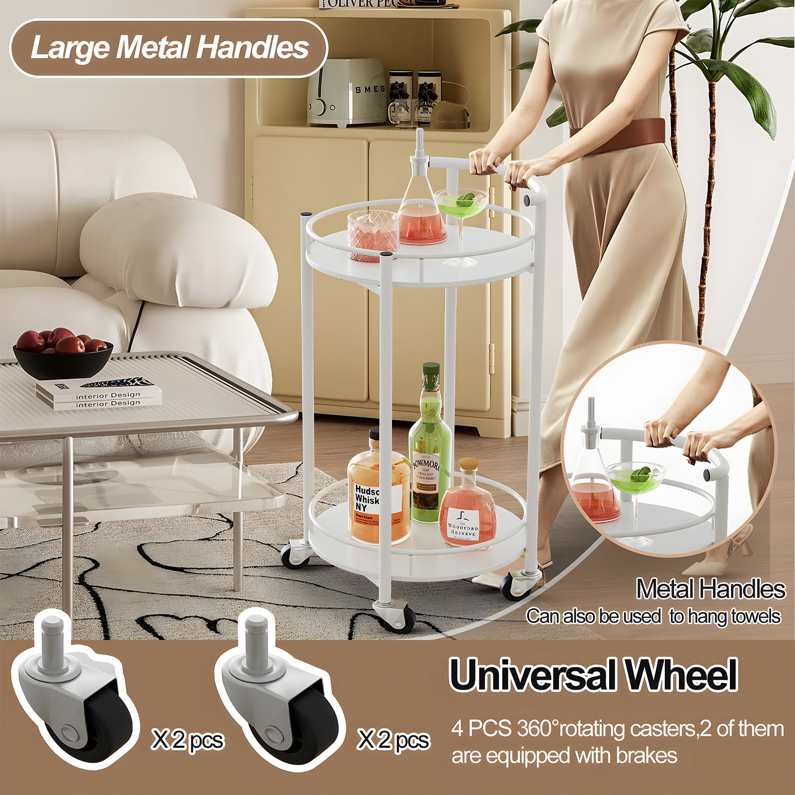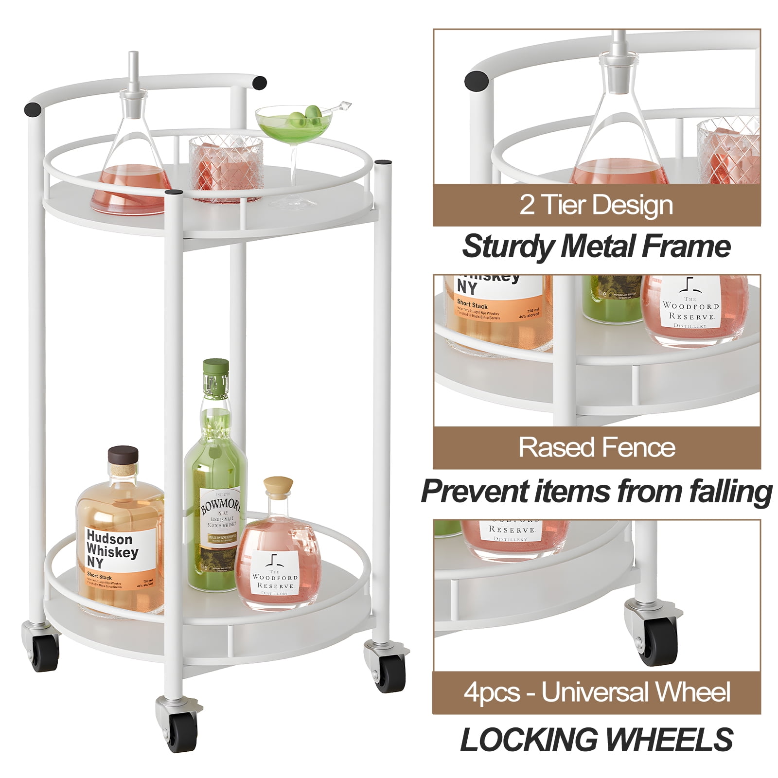 Bar Cart White Rolling Cart for Home,2 Tiers Bar Serving Cart Round Wine Cart with Handle, Metal Wine Rack and Casters, Serving Bar Trolley for Home Kitchen,Living Room,Christmas,New Year