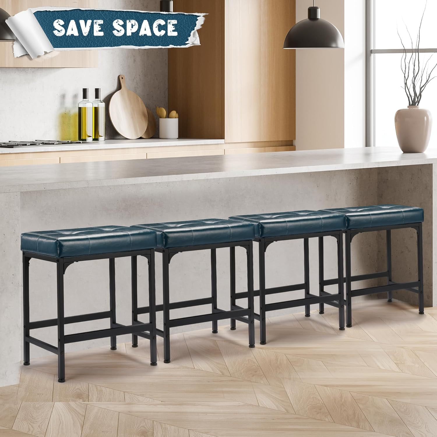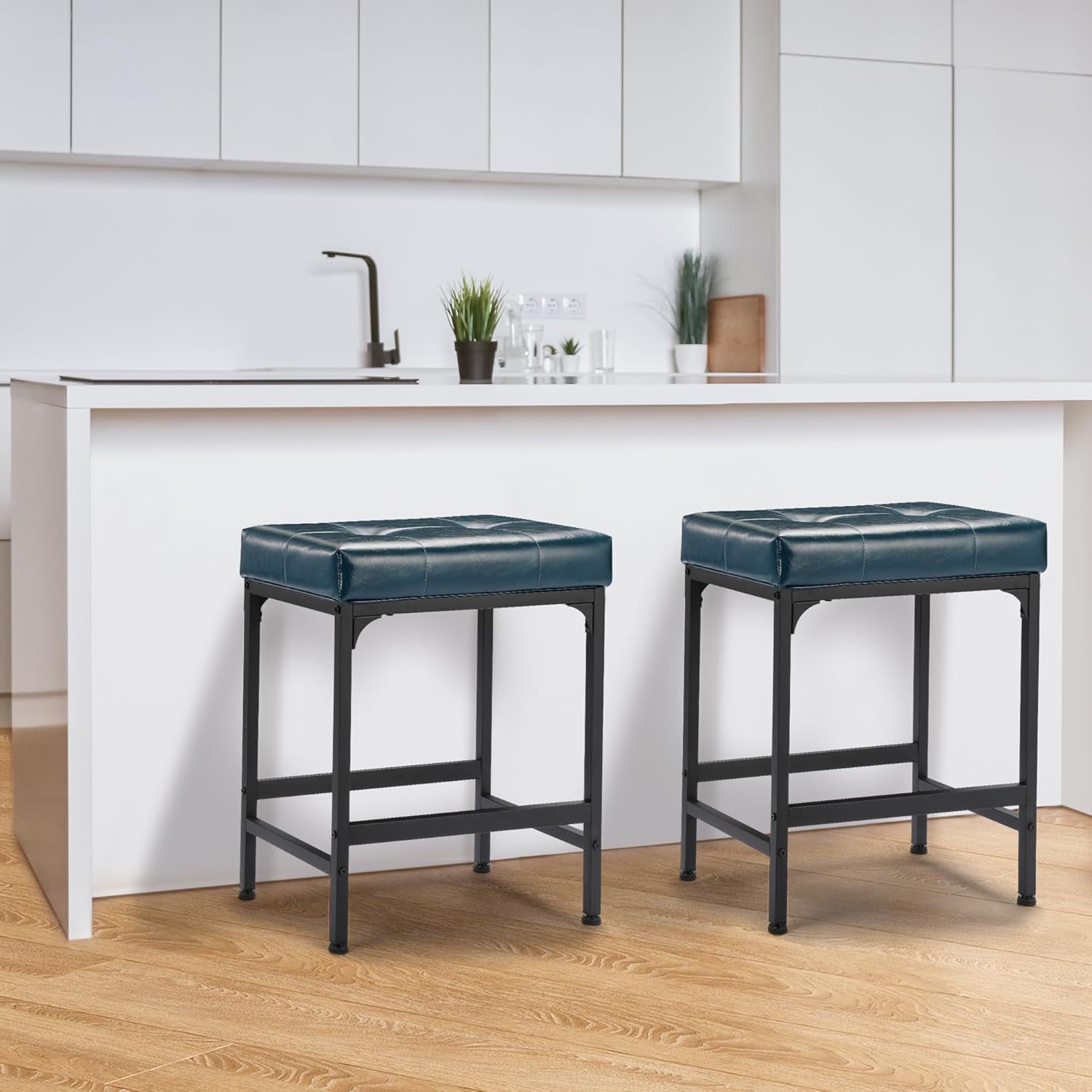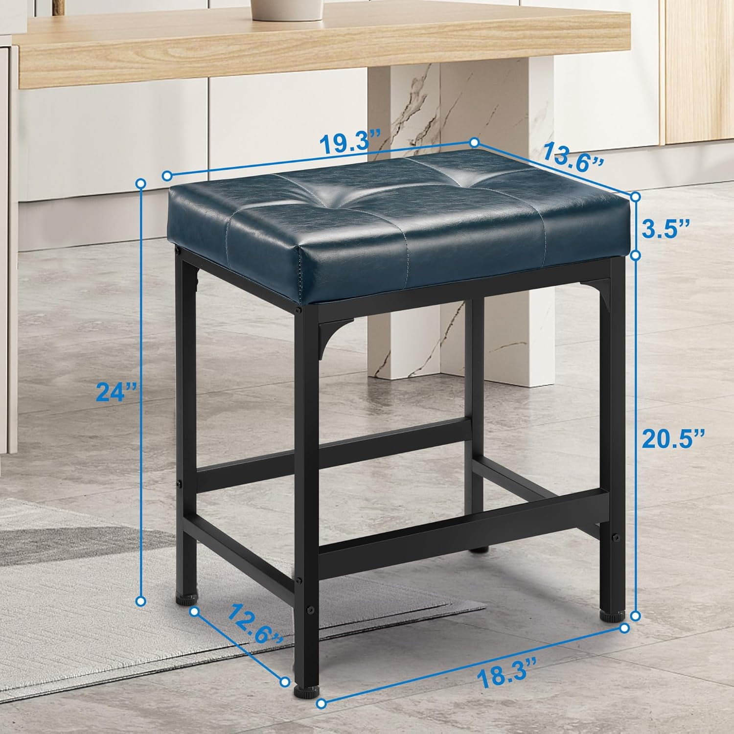 【Comfortable Wide Seat】This bar stool cushion is filled with 3.5-inch thick high-density foam, super soft and comfortable, and will not deform. The 19.3-inch wide seats provide a spacious and comfortable sitting experience. 【Premium PU Leater】The counter height bar stools feature premium PU leather with a soft and supple texture and a natural grain pattern. The counter stools are resisting wear, tear, and fading over time. It requires minimal care and can be wiped clean with a damp cloth. 【Study Metal Base】The counter stool base is made of a chrome-plated metal steel frame with high-quality welds. The rectangular structure is stable and sturdy and can withstand a weight of 250 pounds. The built-in footrest of the stool gives you a relaxing sitting experience. 【Modern Versatile Bar Stools】Simple and classic design add a contemporary touch to your home decor. The counter height stools are very suitable for coffee shops, taverns, farmhouse bars, bars, kitchen islands, living rooms, bedrooms, and dining areas. 【Dimensions】 13.6″L x 19.3″W x 24″H, Suitable for 34″ to 44″ countertop heights and table heights. Weight Capacity: 250 lbs