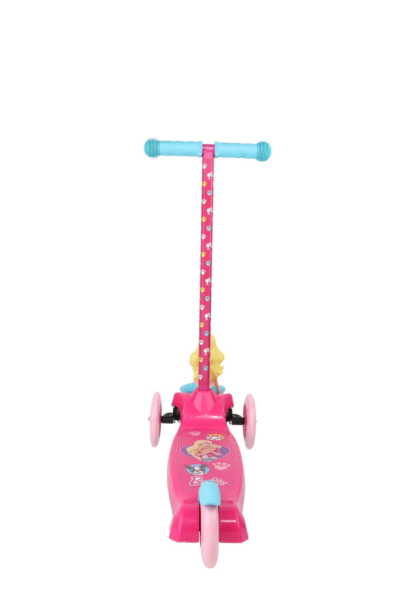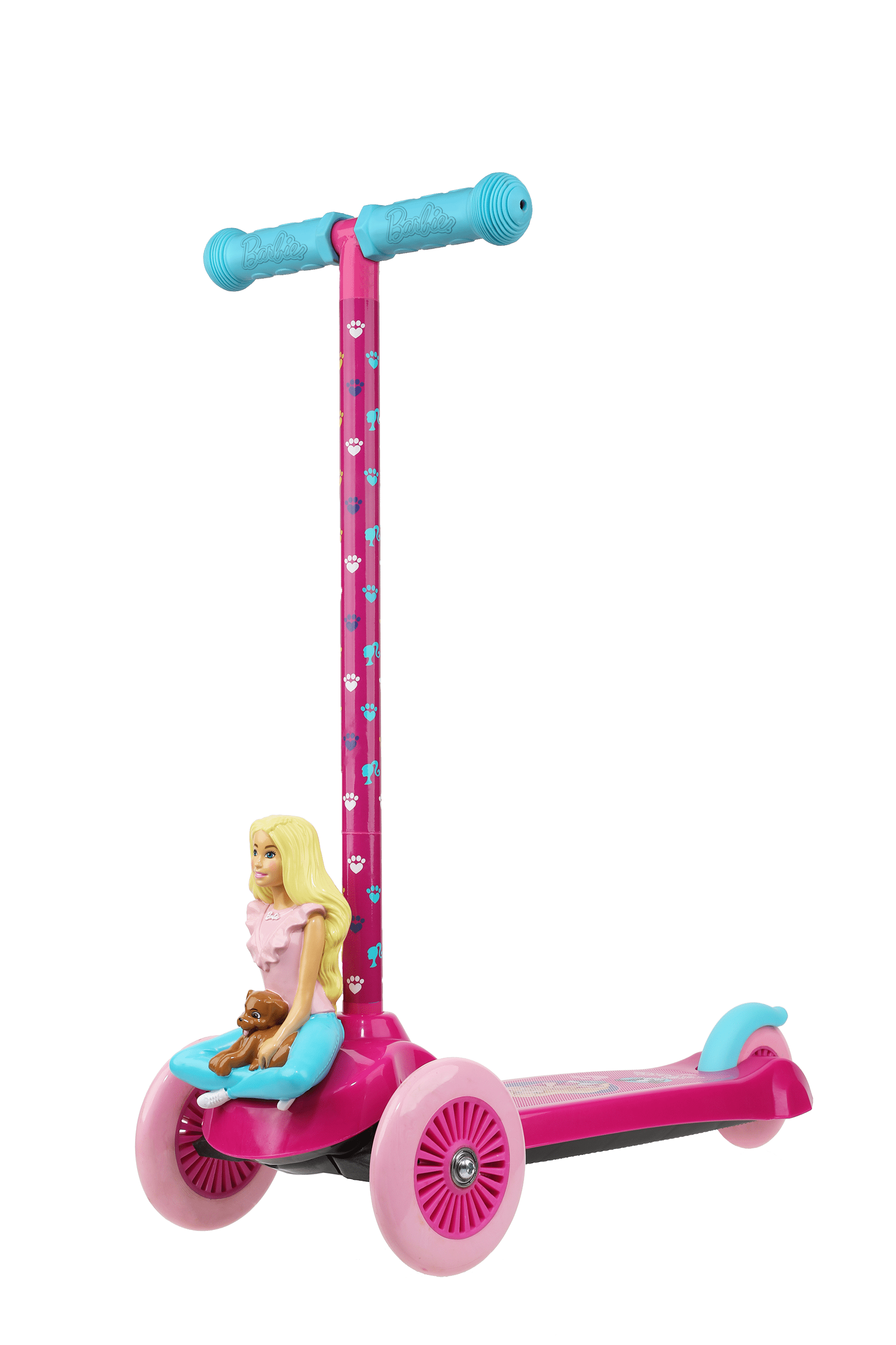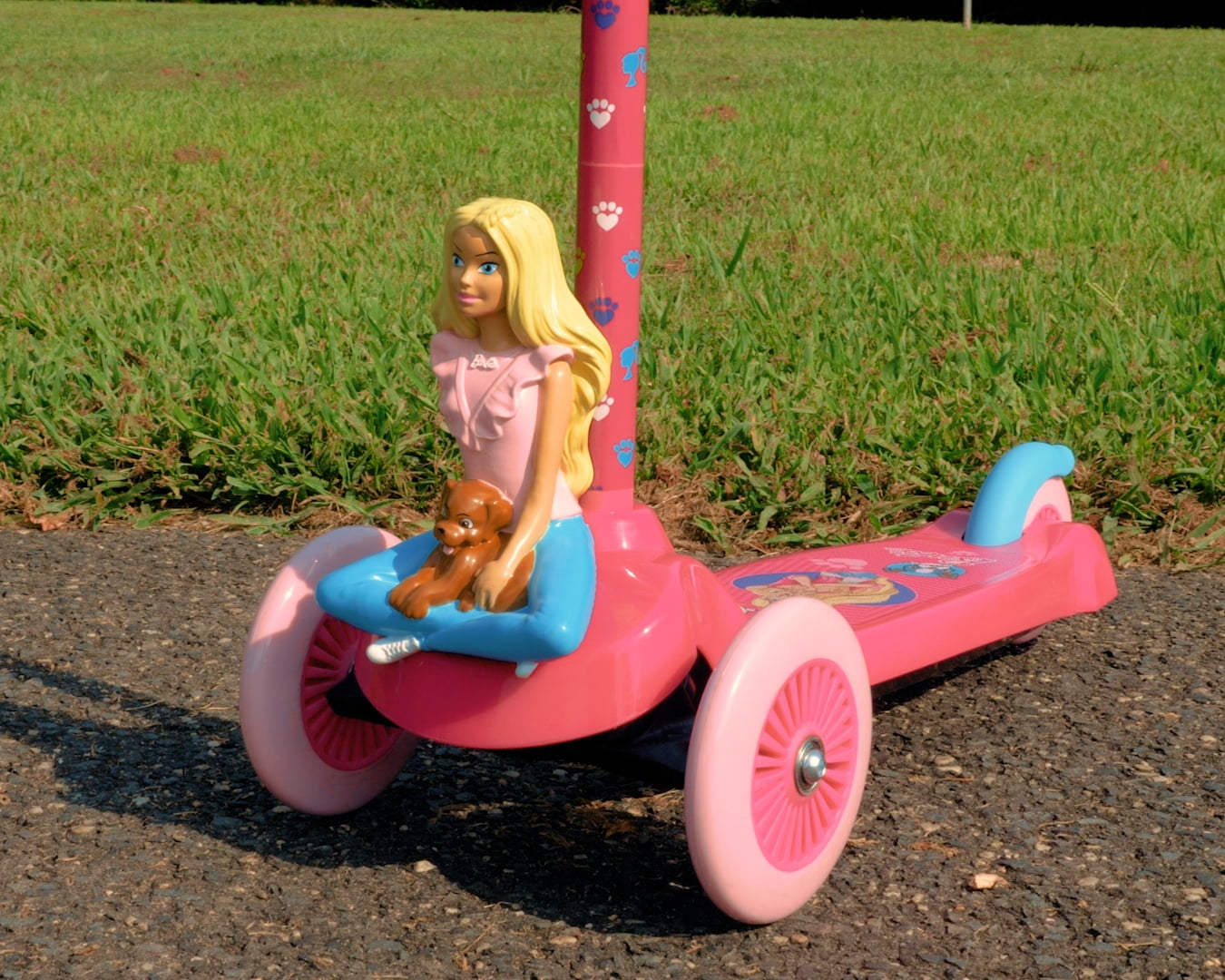 Ride around and play all day with your one-of-a-kind Scooter! With a unique 3d design this scooter looks just like a Barbie doll on the front and is perfect for boys or girls who love Barbie! This 3 wheeled push scooter is designed with a stable platform to foster balance and coordination and safe-roll wheels to keep the beginner scooter rider safe and in control while learning the basic motor skills of balance and coordination. With easy tilt and turn steering, 3-wheel platform and a foot-activated brake, this scooter is tons of fun! For ages 3 and up. 75 lbs maximum weight capacity