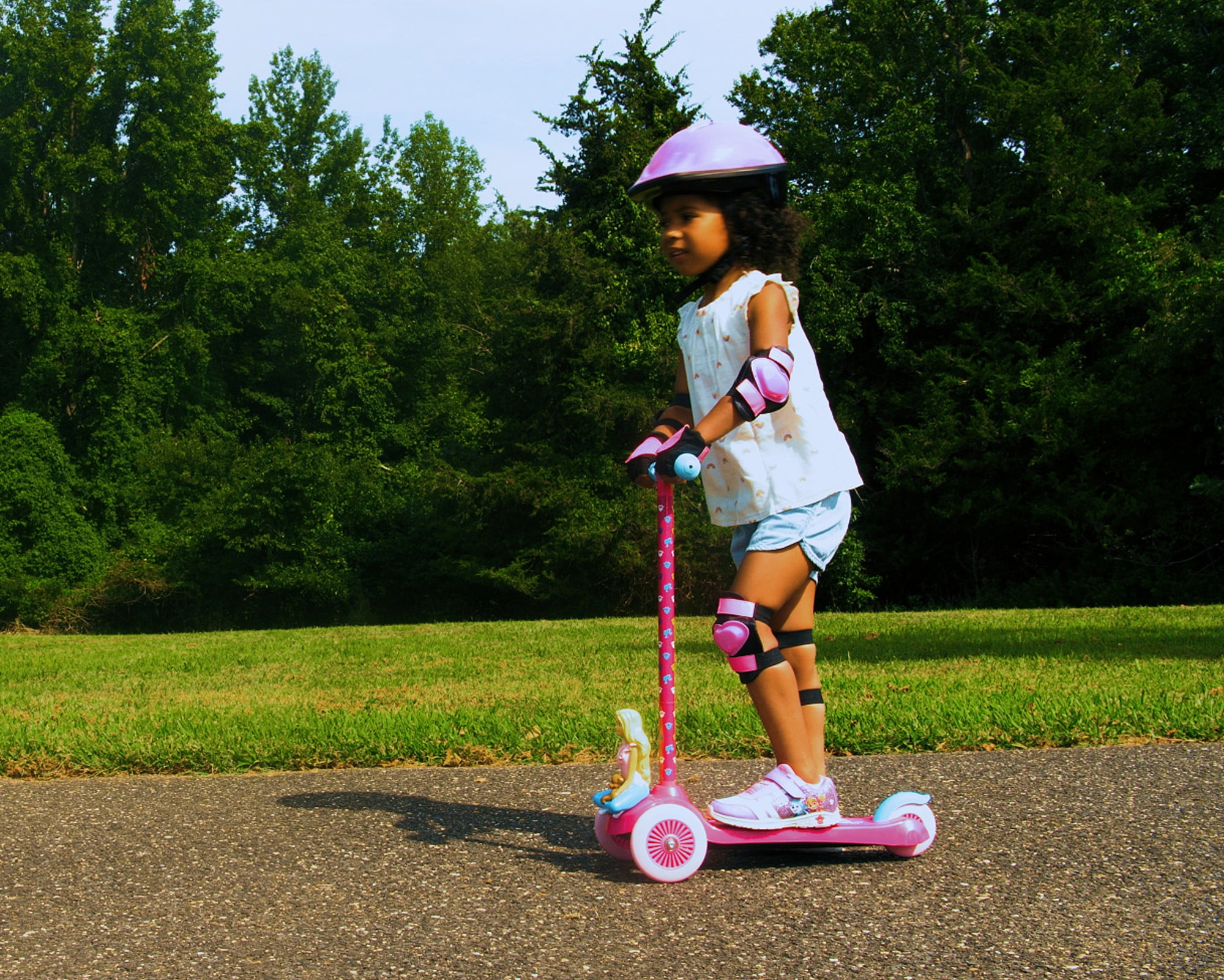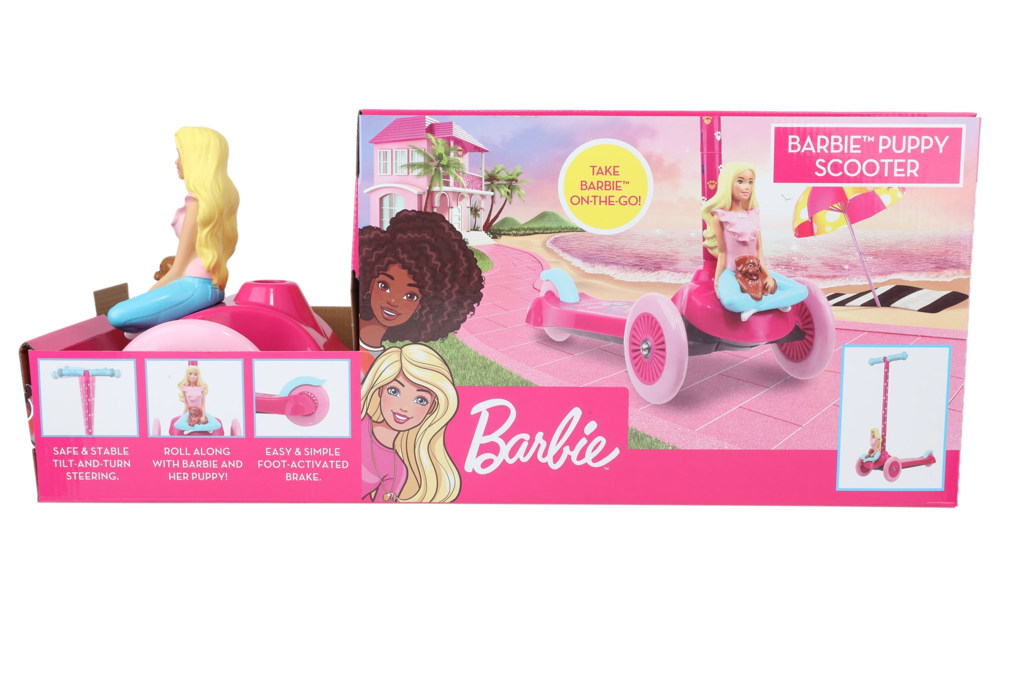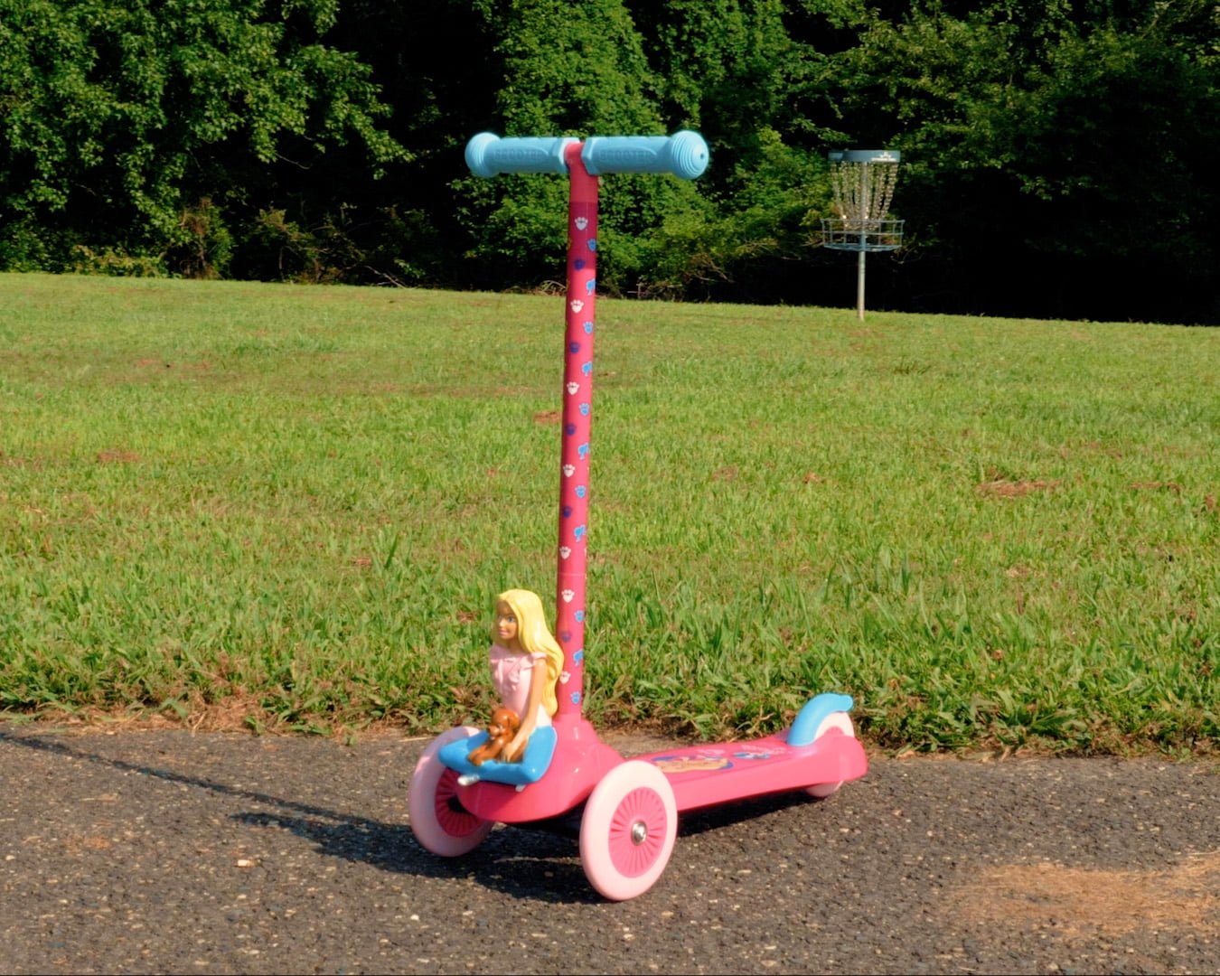 Ride around and play all day with your one-of-a-kind Scooter! With a unique 3d design this scooter looks just like a Barbie doll on the front and is perfect for boys or girls who love Barbie! This 3 wheeled push scooter is designed with a stable platform to foster balance and coordination and safe-roll wheels to keep the beginner scooter rider safe and in control while learning the basic motor skills of balance and coordination. With easy tilt and turn steering, 3-wheel platform and a foot-activated brake, this scooter is tons of fun! For ages 3 and up. 75 lbs maximum weight capacity