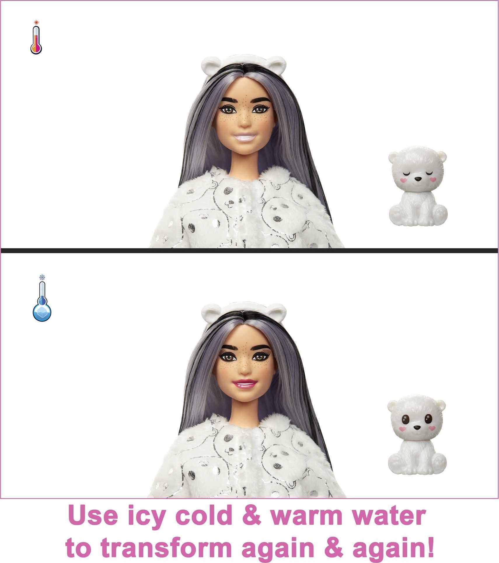 Barbie Cutie Reveal Snowflake Sparkle Series dolls offer the cutest unboxing with 10 surprises, including a posable Barbie doll! Unbox the package to find a soft, plush, sparkly polar bear friend and four surprise bags. Remove the polar bear costume to find a Barbie doll with long hair and twinkle-shine details. Open the surprise bags to find a shimmery fur skirt, headband, sponge-comb and mini polar bear. Kids can dress and accessorize Barbie doll — the costume top reverses and becomes a super-soft fleece jacket, and the costume head also turns into a pet bed! The surprises continue with color-change cuteness. Wintry ‘snowflake sparkle’ paint appears on Barbie doll’s face, and her polar bear ‘opens and closes’ its eyes — such a cutie! Just use the sponge-comb and icy cold water to activate; change back with warm water. Discover all the cute surprises with this Barbie Cutie Reveal series. Includes doll in animal costume and 10 surprises. Doll cannot stand alone. Colors and decorations may vary.