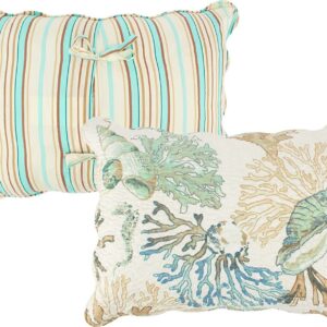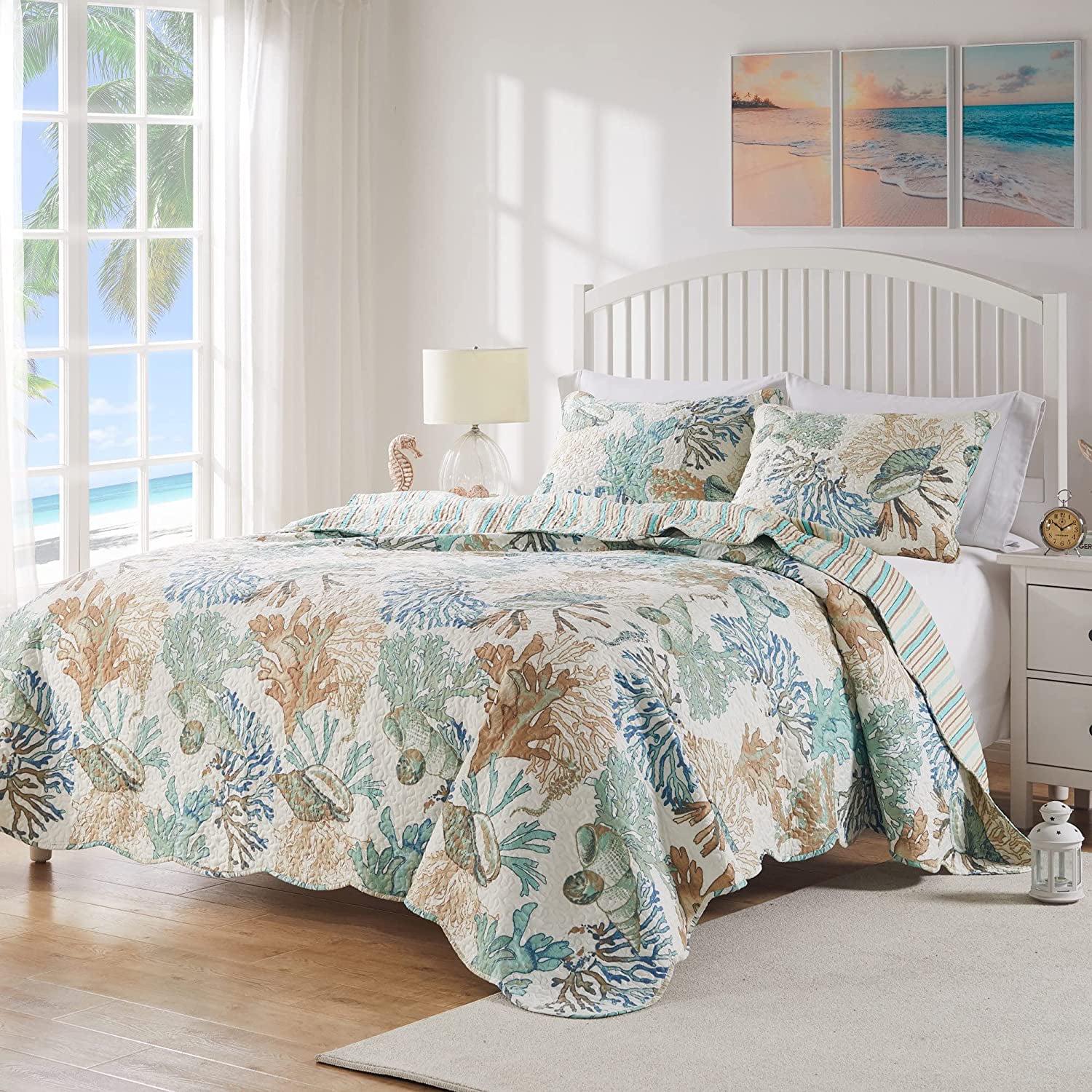 BAREFOOT BUNGALOW ATLANTIS COASTAL QUILT SET – Drifting seahorses, corals and seashells bathed in golden beams create an ocean botanical sanctuary in your bedroom. Shimmering in paradise, dreams of Atlantis inspired this coastal bedding set. Reverses to an all-over ticKing/California King stripe. Prewashed and preshrunk. Machine quilted for durability and oversized for better coverage on today s deeper mattresses. Set includes: Quilt and two pillow shams (one sham per Twin/Twin XL set). Dimensions: 2-Piece Twin/Twin XL set includes one 68×88-inch quilt and one 20×26-inch pillow sham; 3-Piece Full/Queen set includes one 90×90-inch quilt and two 20×26-inch pillow shams; 3-Piece King/California King set includes one 105×95-inch quilt and two 20×36-inch pillow shams (All dimensions +/- 2 inches). 100% Microfiber polyester face and back; Cotton-rich fill, 60% cotton/40% polyester. Machine washable.