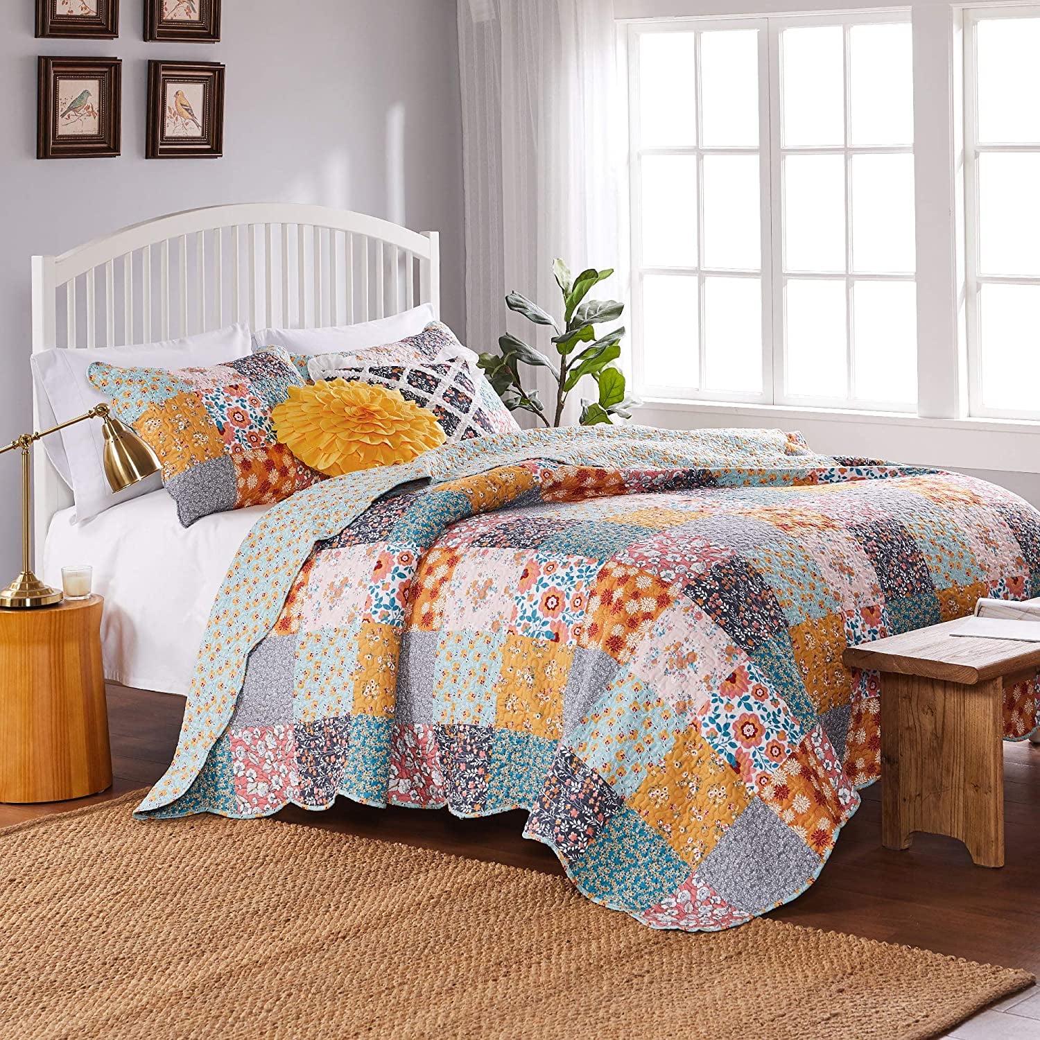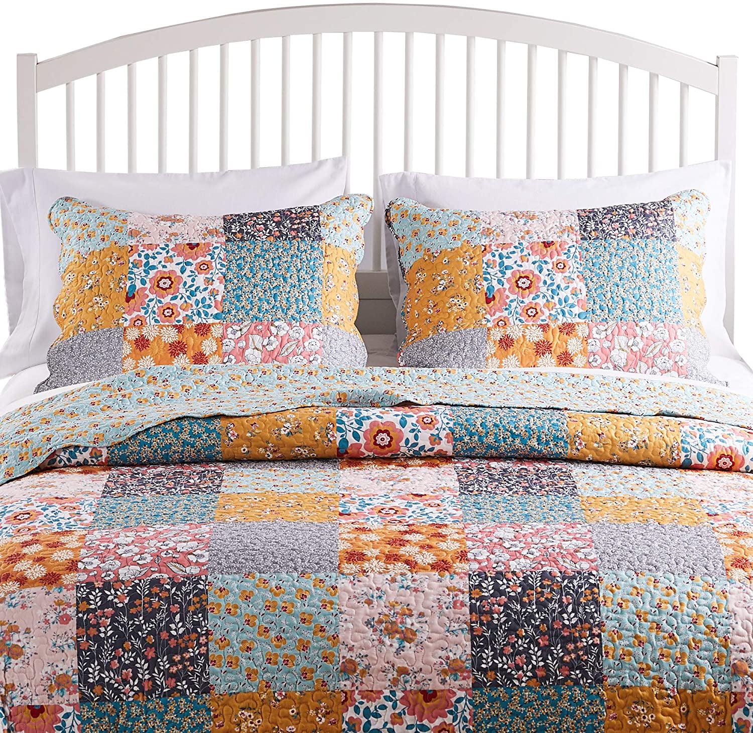 Brighten your bedroom with the fresh, updated colors of this patchwork print bedding by Barefoot Bungalow. An eclectic blend of dreamy calico patterns in gold, blue, orange and green creates a cheerful mood. This enchanting quilt set features bright florals and reverses to an all over coordinating floral print. Vermicelli quilting throughout adds texture and surface interest. Reversible pillow sham(s) complete the look. Oversized for better coverage on today s deeper mattresses. Prewashed with extra softener for a silky feel and preshrunk for size resilience with fabric bound edges. Quilt set comes with quilt and two pillow shams (one sham per Twin set). Dimensions: Twin set comes with 68×88-inch quilted coverlet, plus one 20×26-inch quilted pillow sham. Full/Queen set comes with one 90×90-inch quilted coverlet, plus two 20×26-inch quilted pillow shams. King set comes with one 105×95-inch quilted coverlet, plus two 20×36-inch quilted pillow shams. All dimensions +/- 2 . 100% Cotton face; 100% microfiber polyester back; Cotton-rich fill is 60% cotton/40% polyester. Machine Wash. Imported.