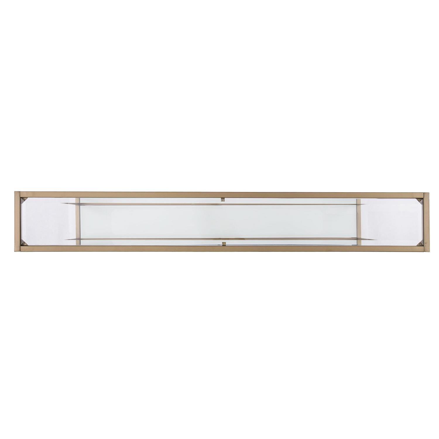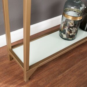 Add a touch of glam to any space with the shimmer of gold and glass in this anywhere console. Simple, sleek silhouette with clear glass top shelf and white glass bottom shelf creates two tiers of storage, enhancing formal and casual spaces. Narrow metal and glass media console adds drama under your wall mounted tv. Create a memory vignette with photos and mementos on your sofa table, or shine a spotlight to a focal wall. This slim anywhere console stops the show in your home.