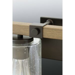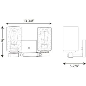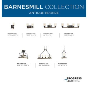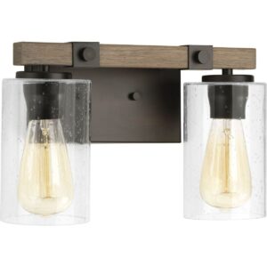 Transform your home into an atmosphere of romantic, rustic relaxation with the Barnes Mill collection s nostalgic two-light bath vanity fixture. Let your eyes wander over the two clear, seeded glass shades that add unexpected, but inviting, visual texture and substance. The charming shades surround smooth light sockets ready to hold clear light bulbs for a pinch of contemporary shine or vintage bulbs to enhance the light fixture s full rustic demeanor. Each light socket is anchored to a pleasing faux-painted wood plank to incorporate a friendly farmhouse appeal. A rectangular, antique bronze backplate manifests the fixture s industrial inspiration. The wood plank is held in place with two metal clasps, each decorated with a smooth, bolt-like knob. Pipe-like bars reach out from the backplate to ground the metal clasps and wood plank to the rest of the structure for a beautiful balance of rustic farmhouse and urban industrial style. For ideal illumination, the light fixture uses two medium base bulbs that are sold separately (100w max LED, CFL, Halogen, or incandescent). With the capability to be fully dimmable with dimmable bulbs and having the approval to be installed in damp locations, this bathroom lighting piece offers versatility when it comes to finding a place in your home décor vision. Mount the rustic light fixture facing up or down, above or around a bathroom mirror to banish shadows from your face as you prepare for the day or for a fun evening out. The light fixture s finely crafted design and outstanding versatility make it an ideal choice for farmhouse, urban industrial, rustic, or transitional interiors. It s time to breathe new life into the mundane every day with timeless and truly transformative bathroom lighting. Make your purchase today to begin your journey to a whole new lighting experience. Progress Lighting products are designed for exceptional quality, reliability, and functionality.