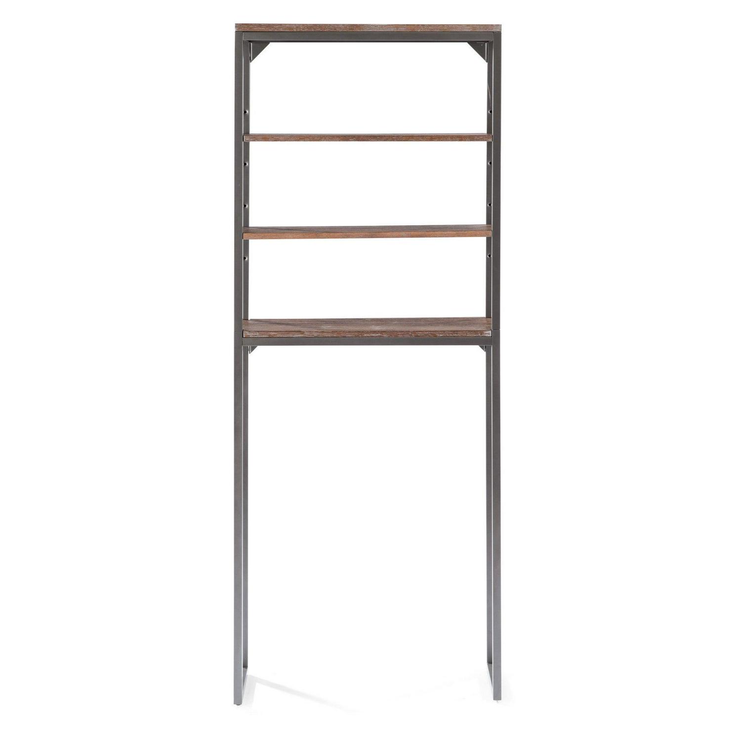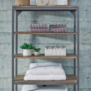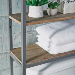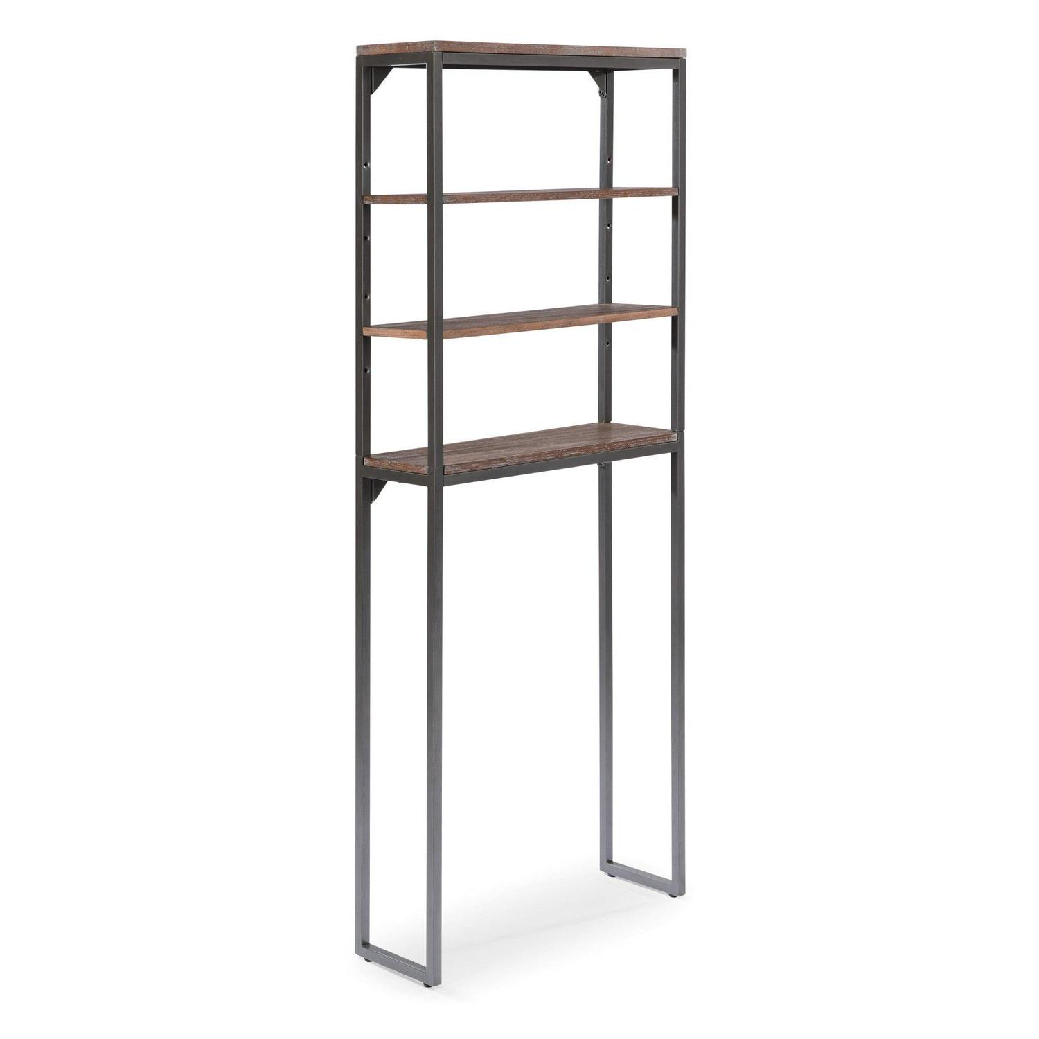 Turn any bathroom into a storage closet by adding this Homestyles Barnside Over-the-Commode Stand. This vertical storage solution stacks two fixed shelves and two adjustable shelves behind the toilet to add convenient storage in an otherwise unusable space. The dark gray wire-brushed finish gives this stand a desirable weathered look, but the powder-coated frame stands the test of time.