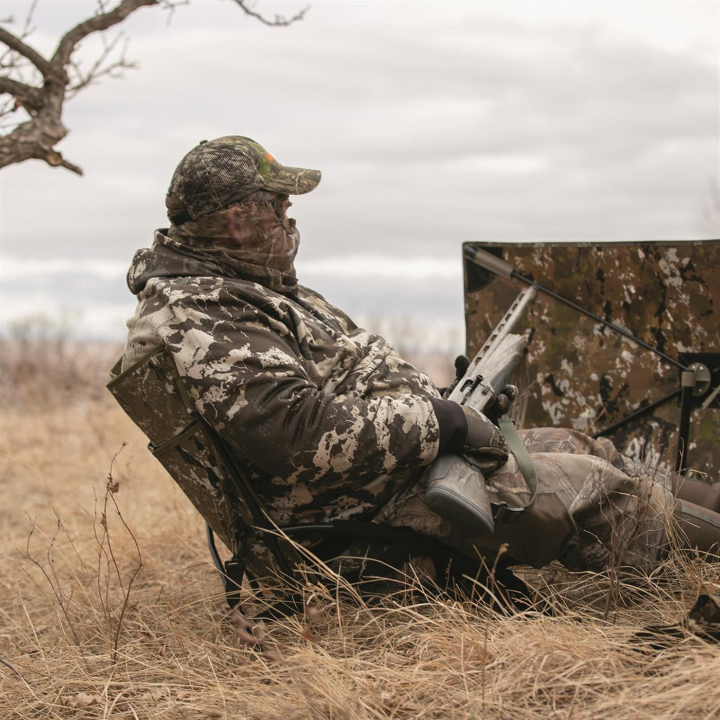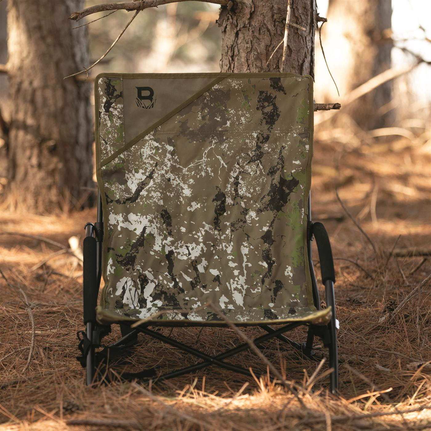 The low profile design of the Barronett Blinds® Ground Gobbler Chair keeps you dry and off the ground for run and gun hunting. Its seat comfortably angles back, relieving pressure off your legs while the padded armrests dampen noise and add comfort. The chair folds up for easy transport with its integrated carry strap.