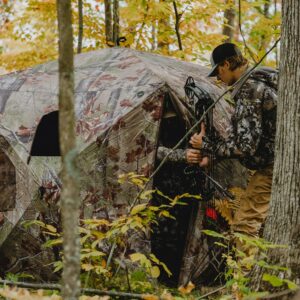 This Pentagon has a huge interior. The 5-sided shape allows for a comfortable group hunt with a footprint of 41.5 square feet, which is 70% greater than a comparable 4-sided blind. The shape of the Pentagon also creates unrivaled viewing from the blind with panoramic windows. The Pentagon is equipped with a durable framework with thicker, stiffer poles and strong hubs. The windows dip low for easy sight lines while seated and the middle windows have shoot-through holes to provide multiple shooting options.