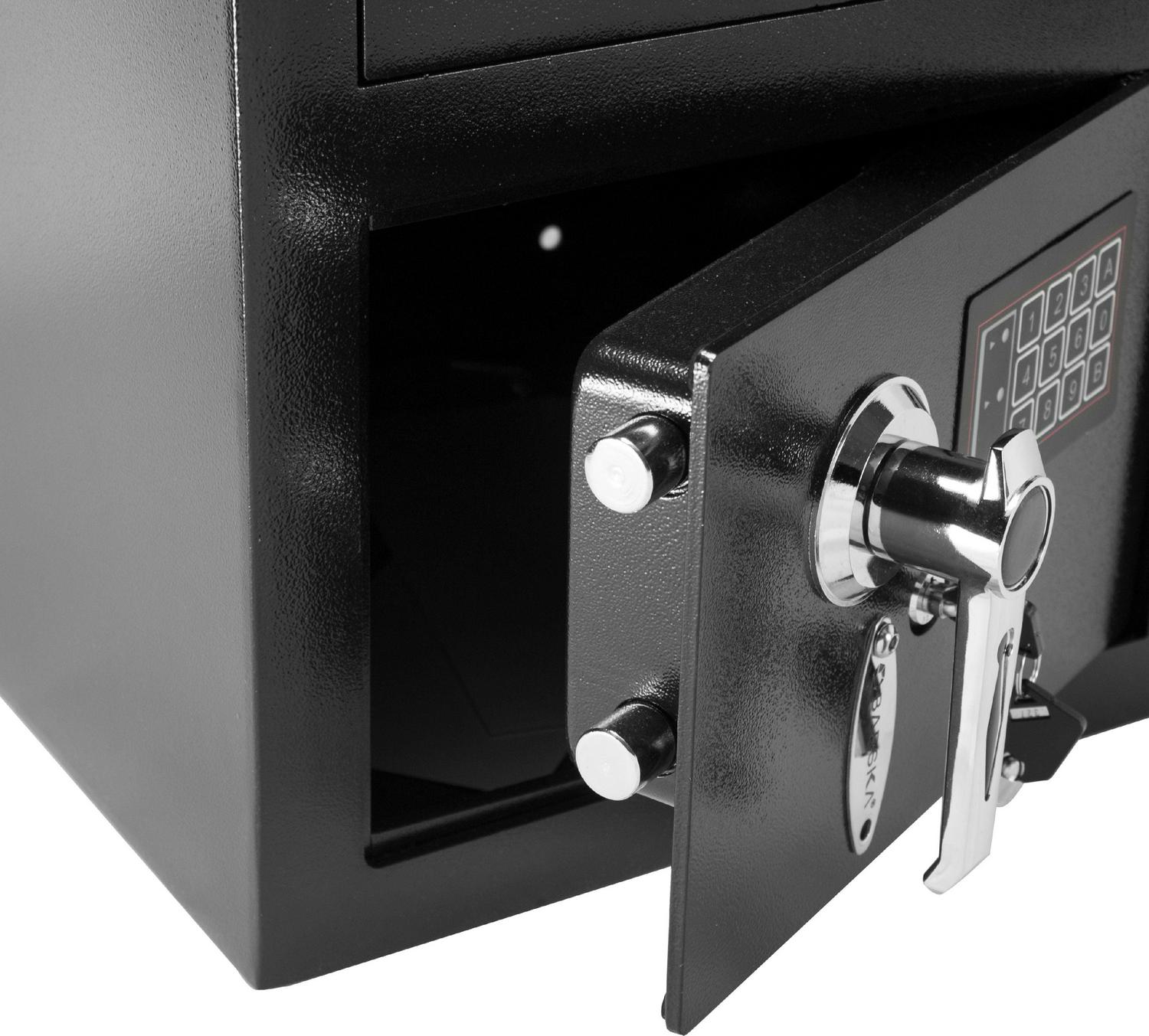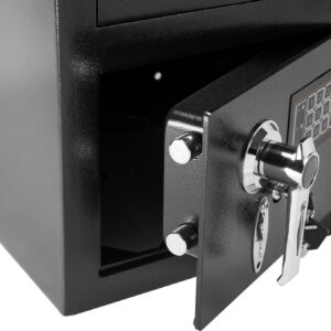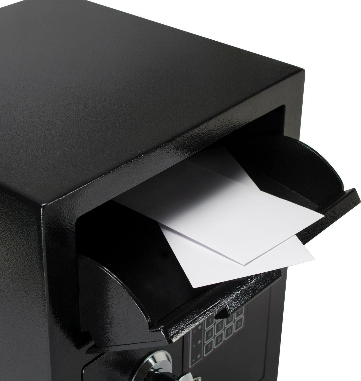 The Standard Keypad Depository Safe by Barska is the perfect storage solution for businesses and individuals who need a secure place to temporarily store cash deposits or important documents. The deposit door can accommodate standard size deposit bags or folders, and features anti-fishing baffles to eliminate the possibility of the contents being retrieved by an unauthorized user. The Barska Standard Depository Safe utilizes either a digital keypad or traditional keys to gain access to the safe’s contents. Features: Retains Two PIN Codes Anti-Fishing Baffles on Deposit Door Two Solid-Steel Locking Bolts Solid-Steel Body Construction Pre-Drilled Mounting Holes Operates on 4-AA Batteries (Included) Lock-Out Mode to Prevent Tampering Emergency Back-Up Keys and Mounting Hardware Dimensions: 13.75in x 13.75in x 16in Inner Dimensions: 13.5in x 11.5in x 8in Weight: 41.75 lbs