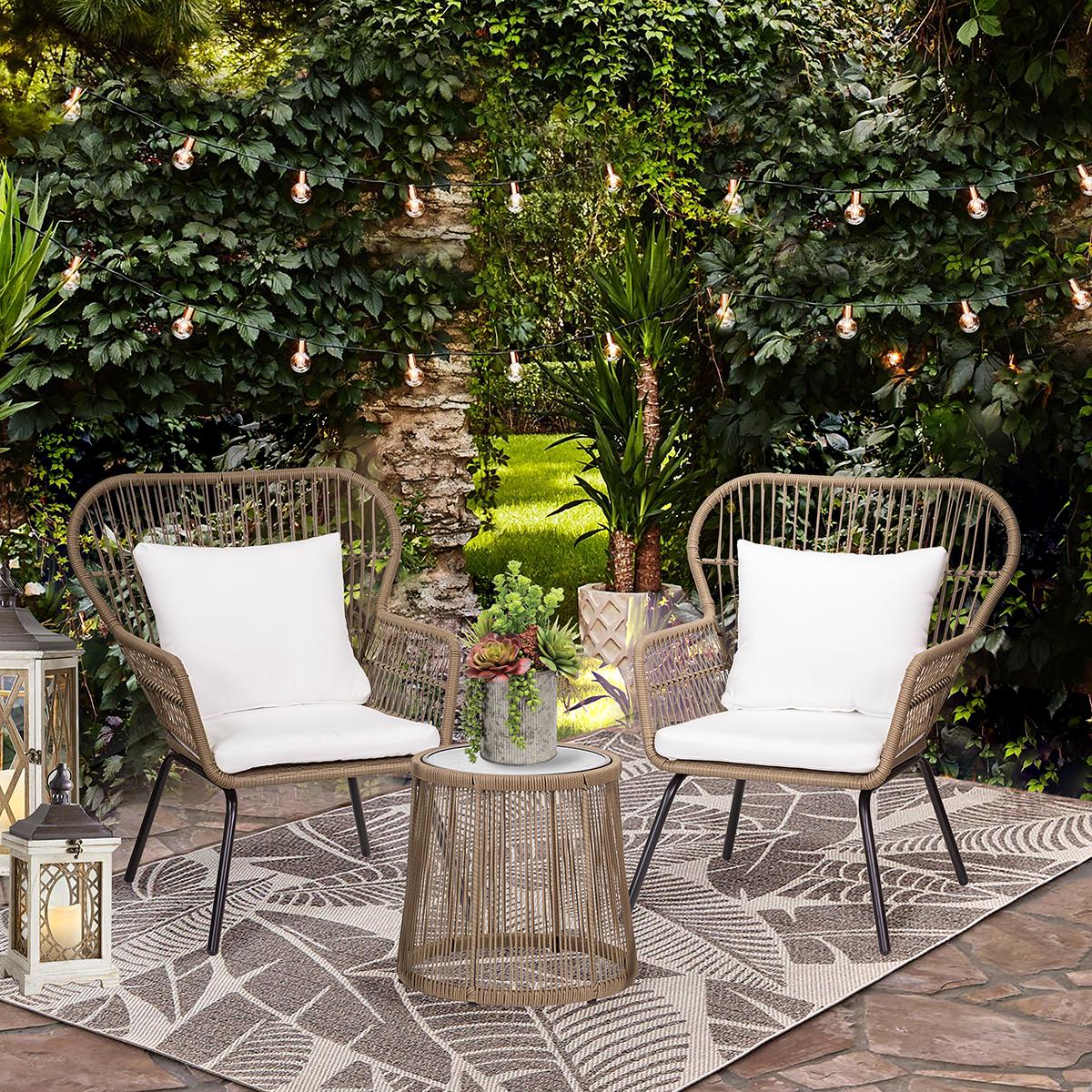 – 3-Pieces Bistro Set – The design has a contemporary appeal, extra wide seat width and depth perfect for you body. It is perfect addition for the pool, park, the garden and the country yard; This outdoor set is composed of 2 armchairs and a circular accent table to place small decor, snacks, and beverages
