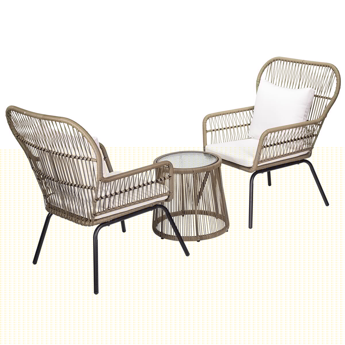 – With clean lines contrasted perfectly by its round edges, our rattan chat set is the ideal modern accessory for your outdoor space. Finished with thin angled legs, this set not only offers a sleek, minimalistic look but also provides a stable structure
