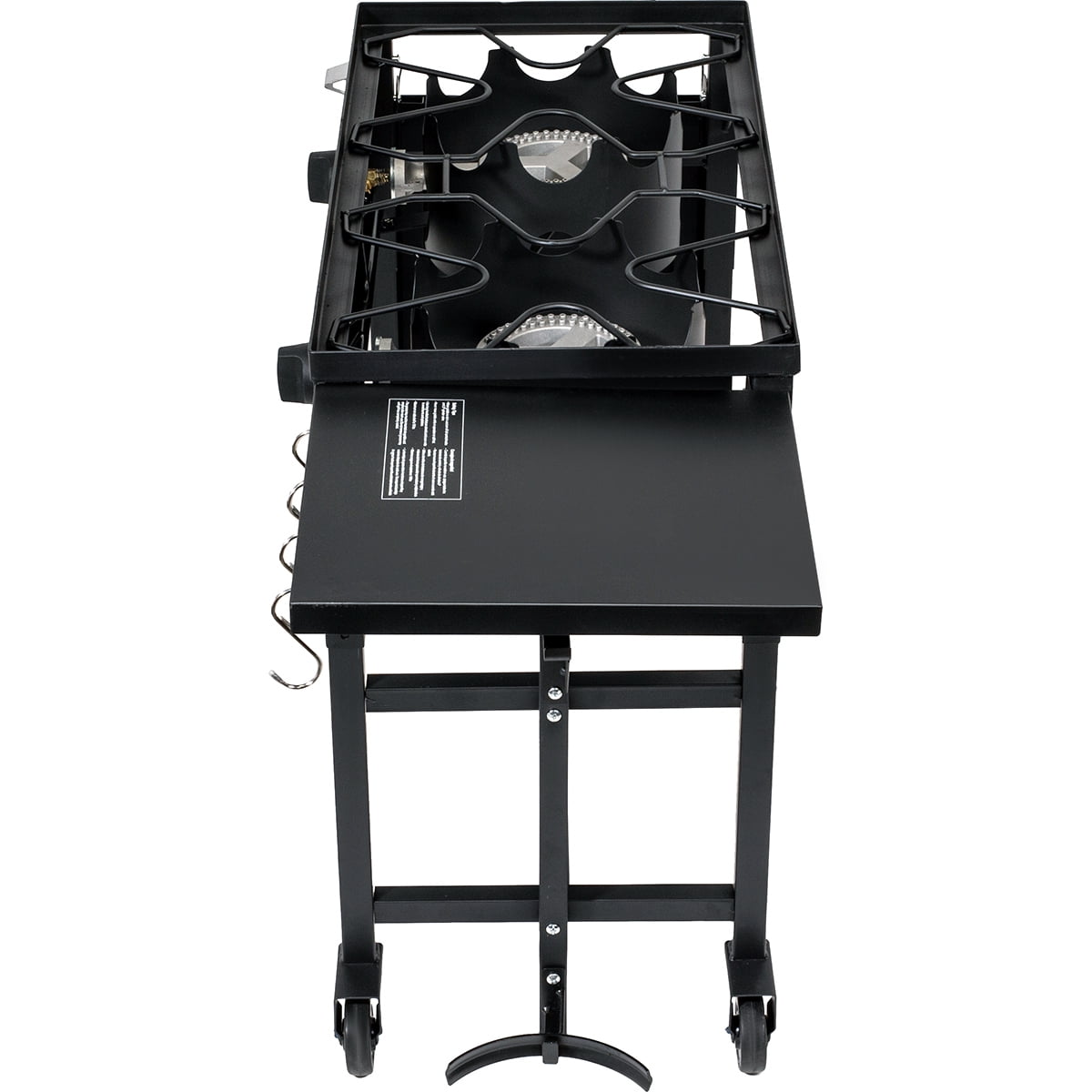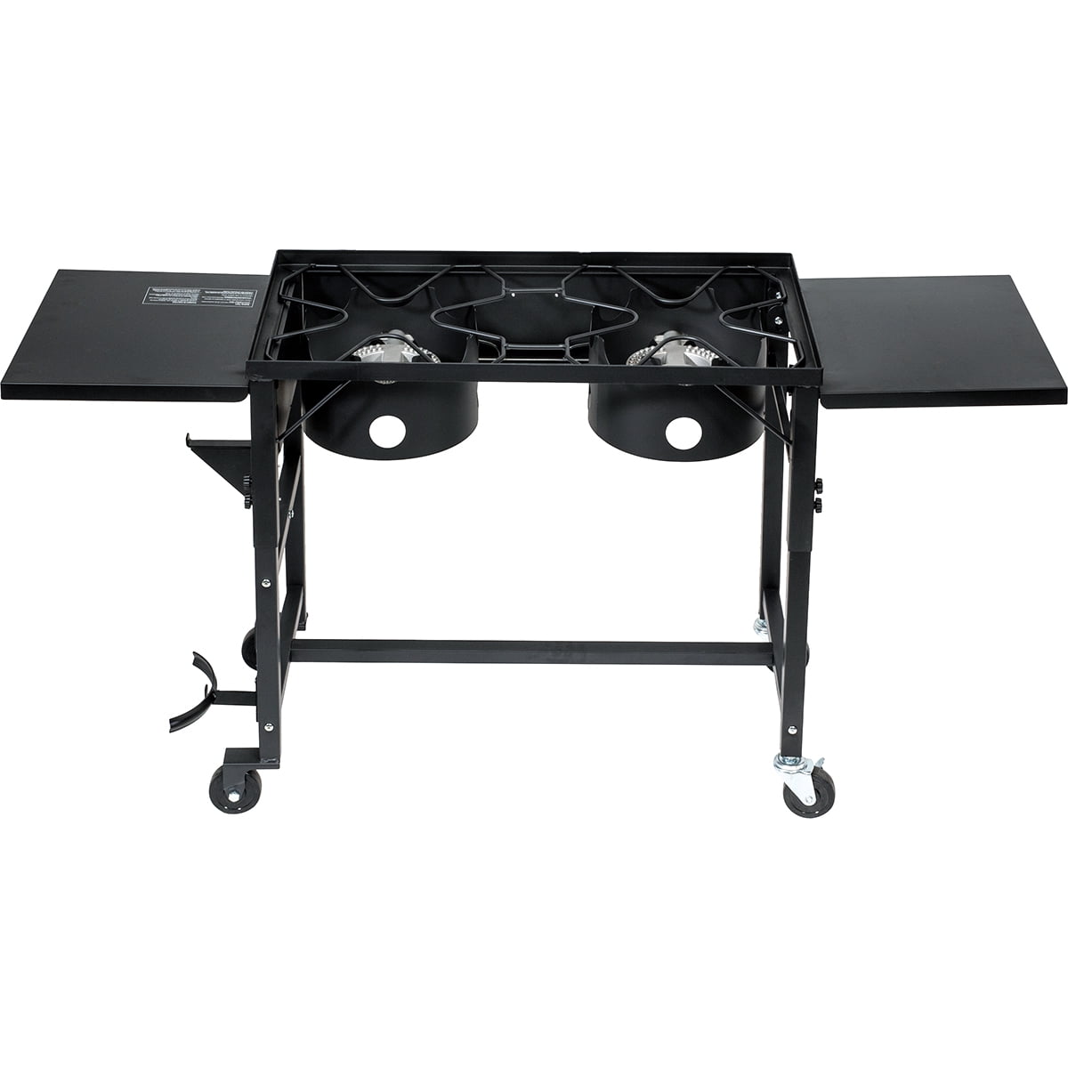 The Barton Outdoor Camping Propane Double Burner Stove Station features twin 58,000 BTU propane stoves and convenient drop-down side tables made to be compact and portable for a diverse selection of outdoor cooking applications. This outdoor cooking stove is perfect for on-the-go cooking when bringing friends or family for some outdoor camping and adventure fun. Easily transport the double burner stove on and off the campsite using its built-in swivel caster wheels for quick mobility and easy transport. Features: Powerful 58,000 BTU propane range double burners with large temperature controlling knobs for adjustable flame and quick heating Convenient drop-down side tables can fold up and down to be more compact for cooking in tighter areas Large 4 swivel caster wheels provide quick mobility and easy transport for on-the-go outdoor cooking application Mounted propane burner design lets you easily secure propane gas tanks safely underneath the burners Compatible for use with stainless steel griddle or flat-top grills attachments (sold separately) 4 hook utensil holder helps hold your favorite grilling tools like heat resistant BBQ gloves, spatula, tongs, and handy grill scraper at the ready. Perfect cooking stove specially designed to be portable and lightweight for outdoor cooking when camping, picnicking, backpacking, and various outdoor applications Specifications: Color: Black Type: Propane Double Burner Station Primary Material: Cast Iron Propane Fuel: LPG Ignition Type: Manual Maximum BTU: 58,000 Cooking Area: 496 sq. ft. Overall Dimensions: 56 in. x 17 in. x 29 in. Certification: Package Contents: Propane double burner station 0-1 PSI regulator with hose Assembly instructions
